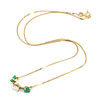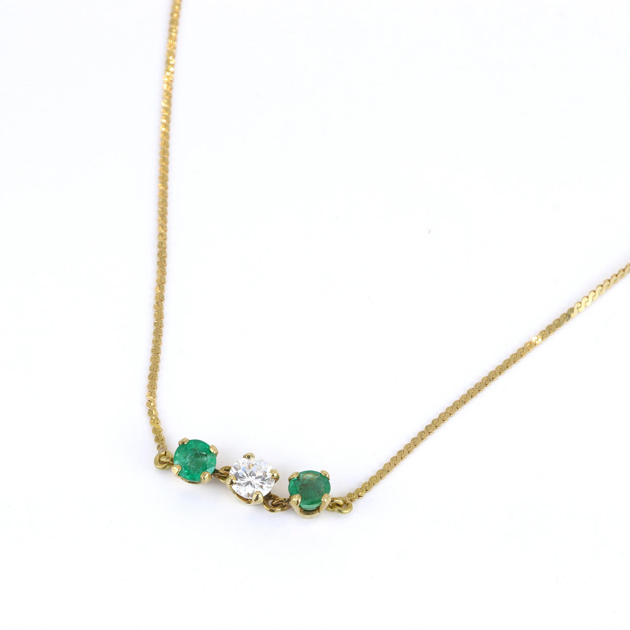 An 18ct yellow gold necklace set with two round cut emeralds and brilliant cut diamond. Dia. 0.50ct approx. Emerald 1ct total approx.