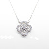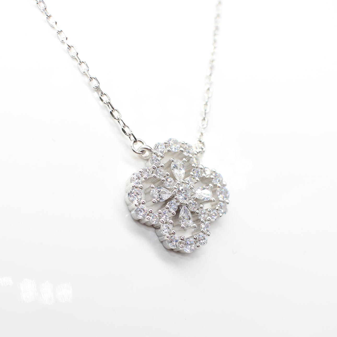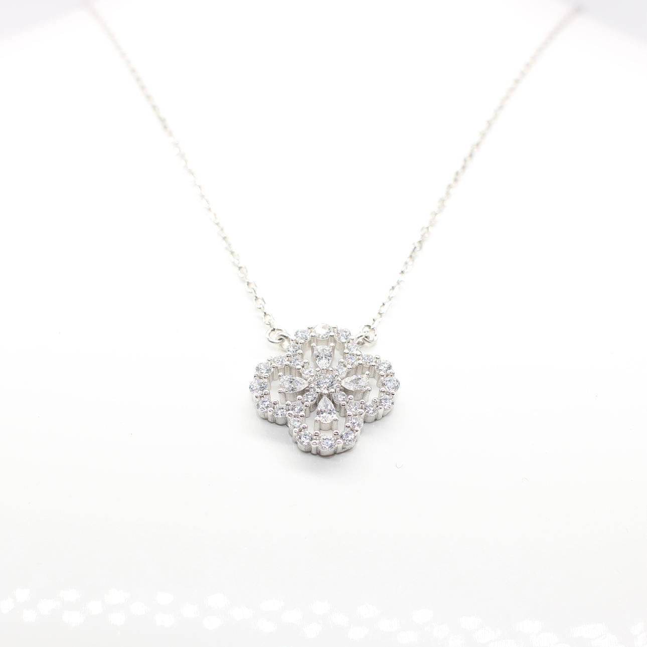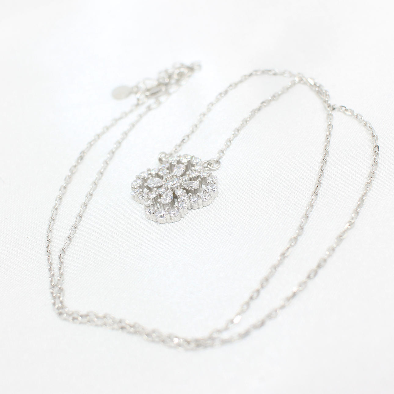 A silver (stamped 925) necklace with a fixed cloverleaf style pendant set with white cubic zirconia.