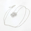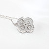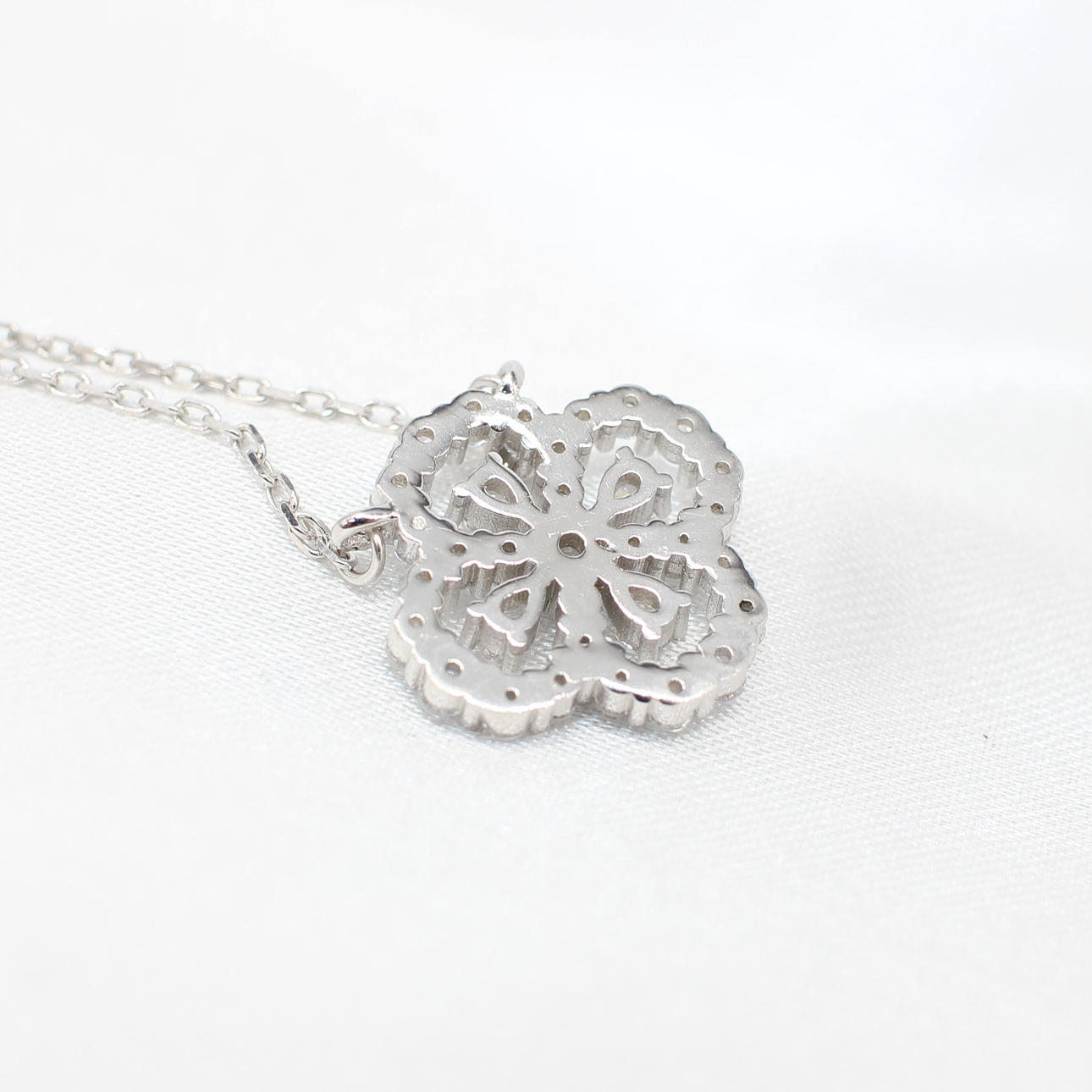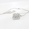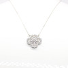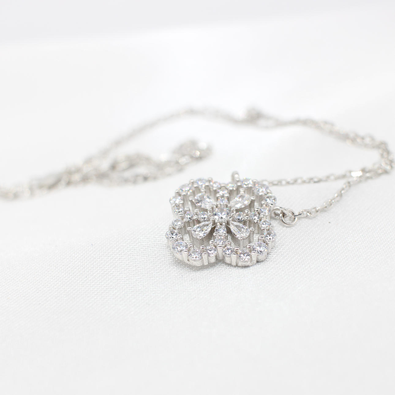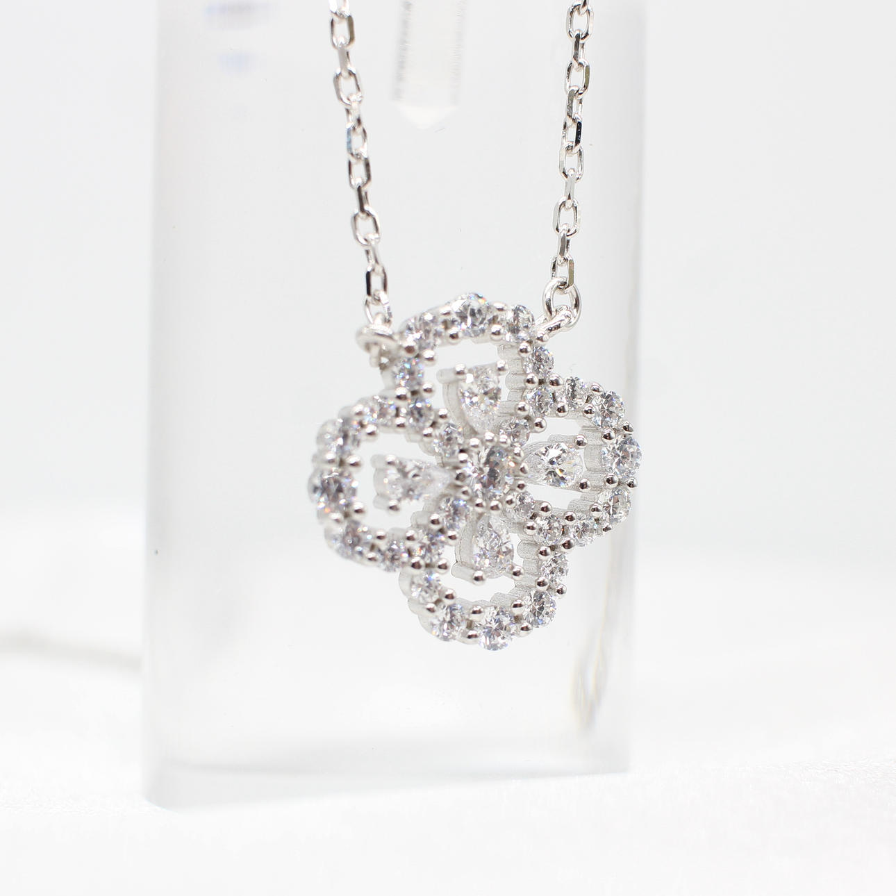 A silver (stamped 925) necklace with a fixed cloverleaf style pendant set with white cubic zirconia.