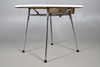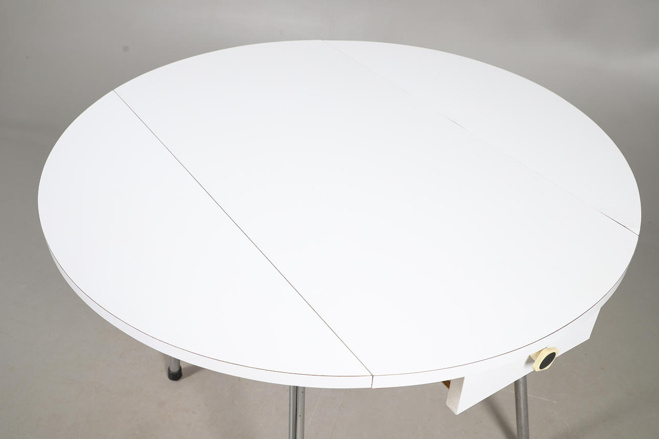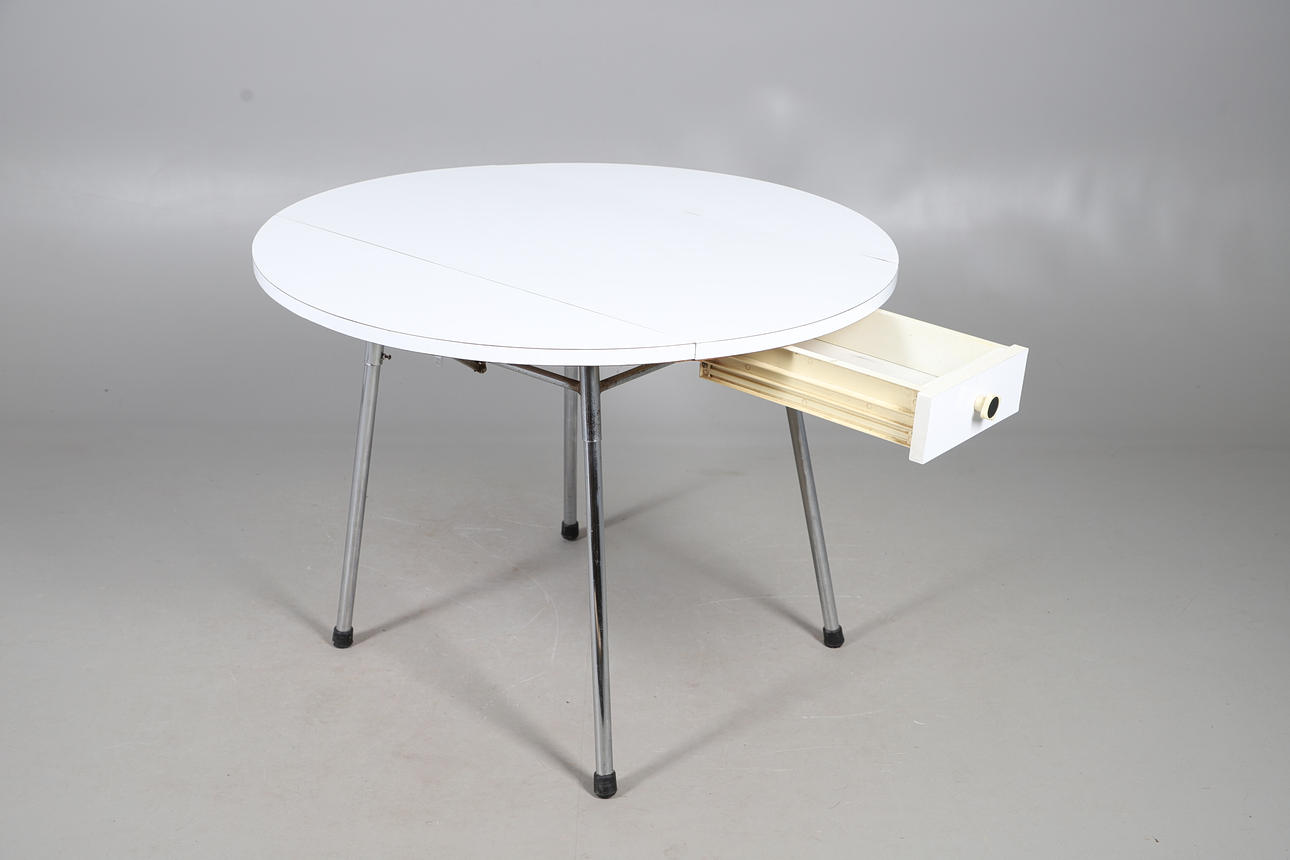 A 1960s/70s white drop leaf table, with a single drawer and raised on metal supports. 72cmn (h) x 100.5cm (length) x 56cm (w) (each leaf adds 25cm).