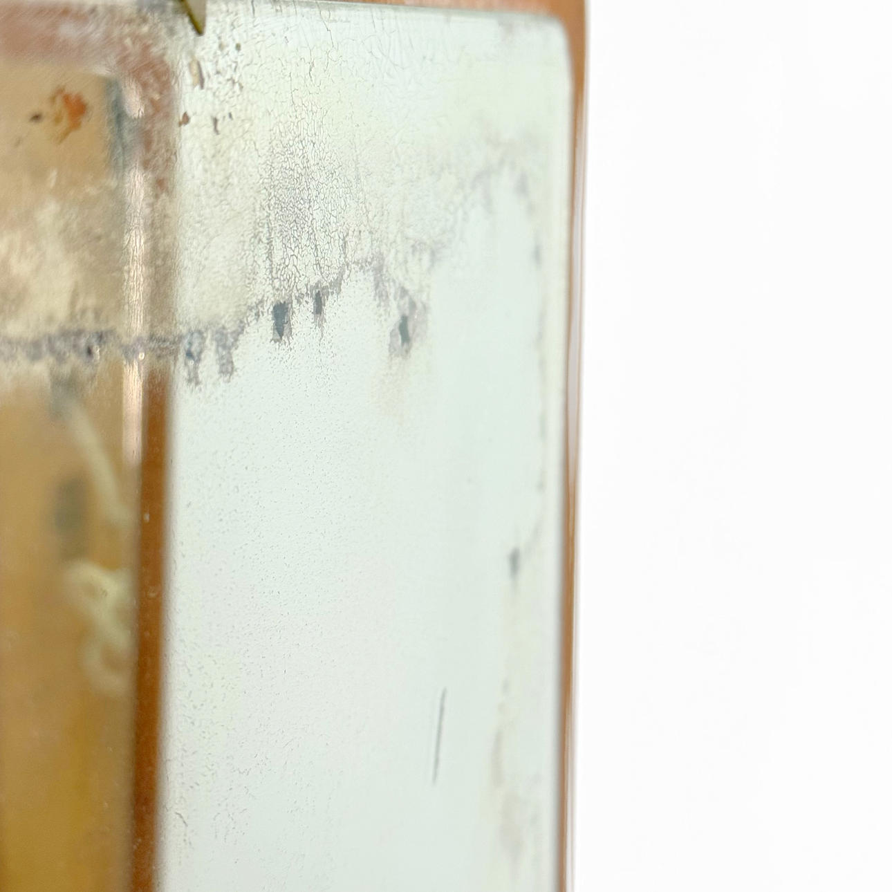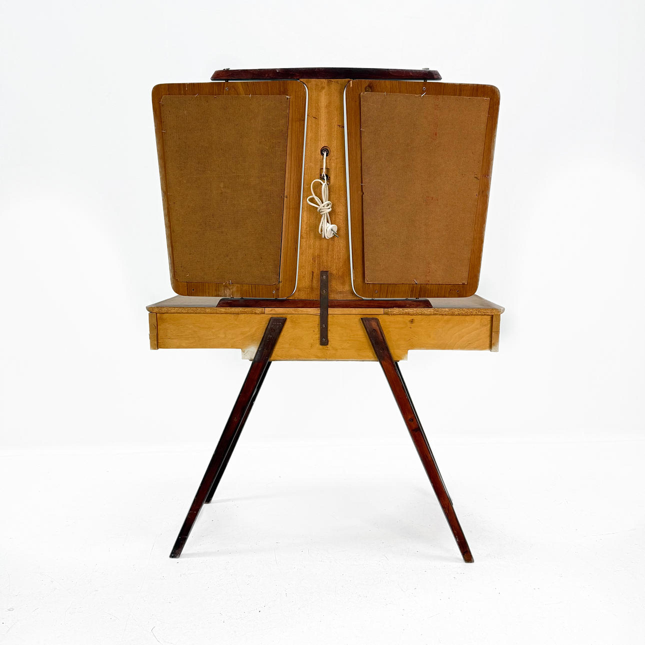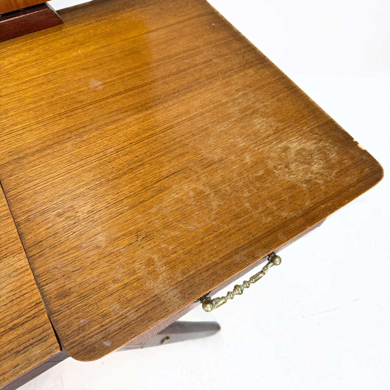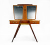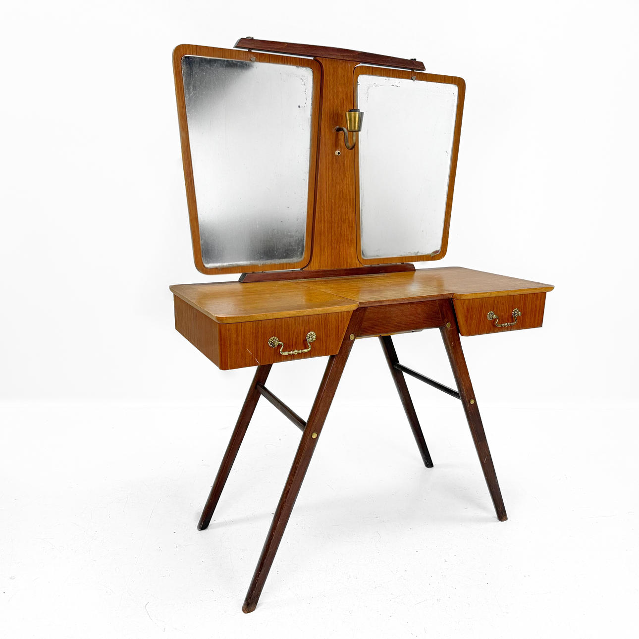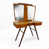 Age and wear and tear, marks on the top of the table. see picture. Lighting not tested, Missing button part, glass cup missing, Mirrors with rust.