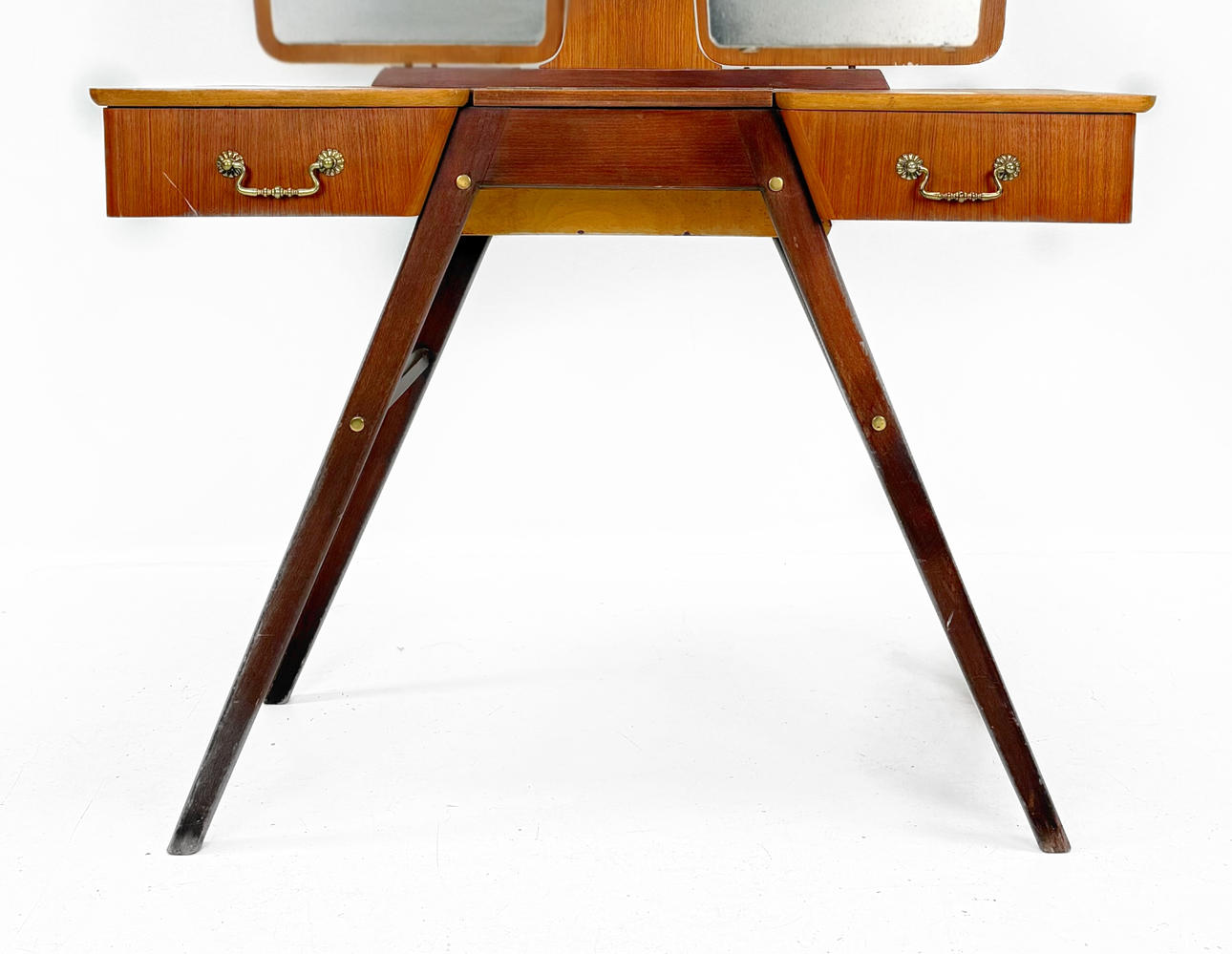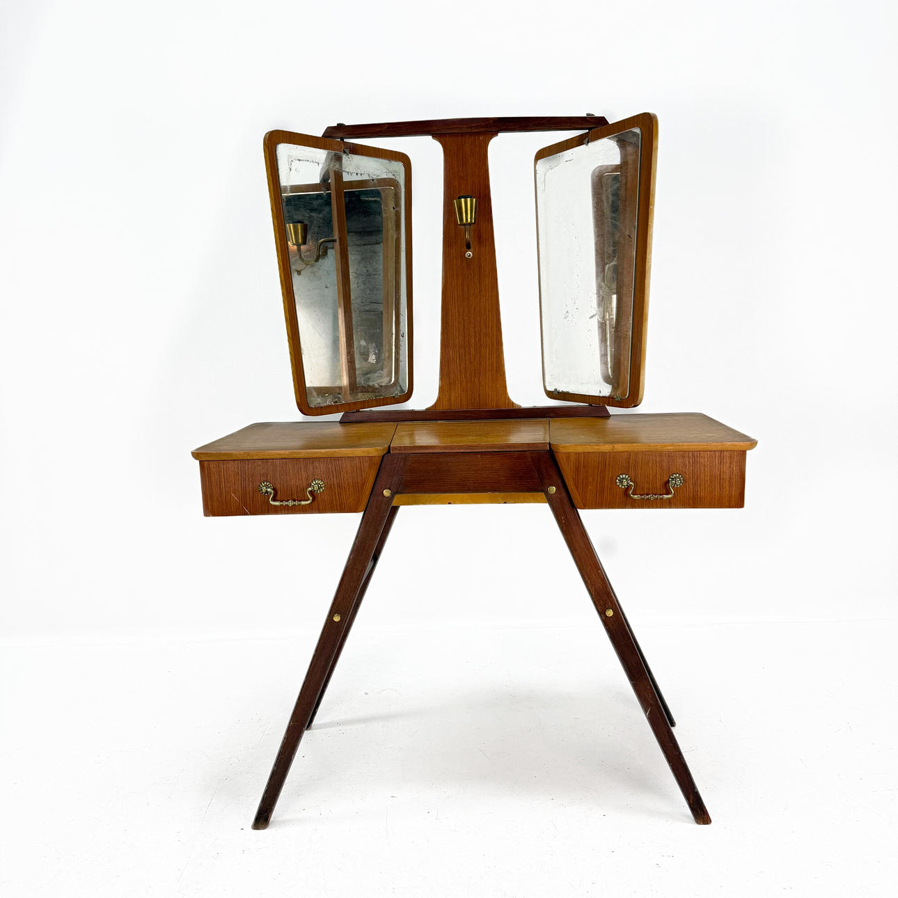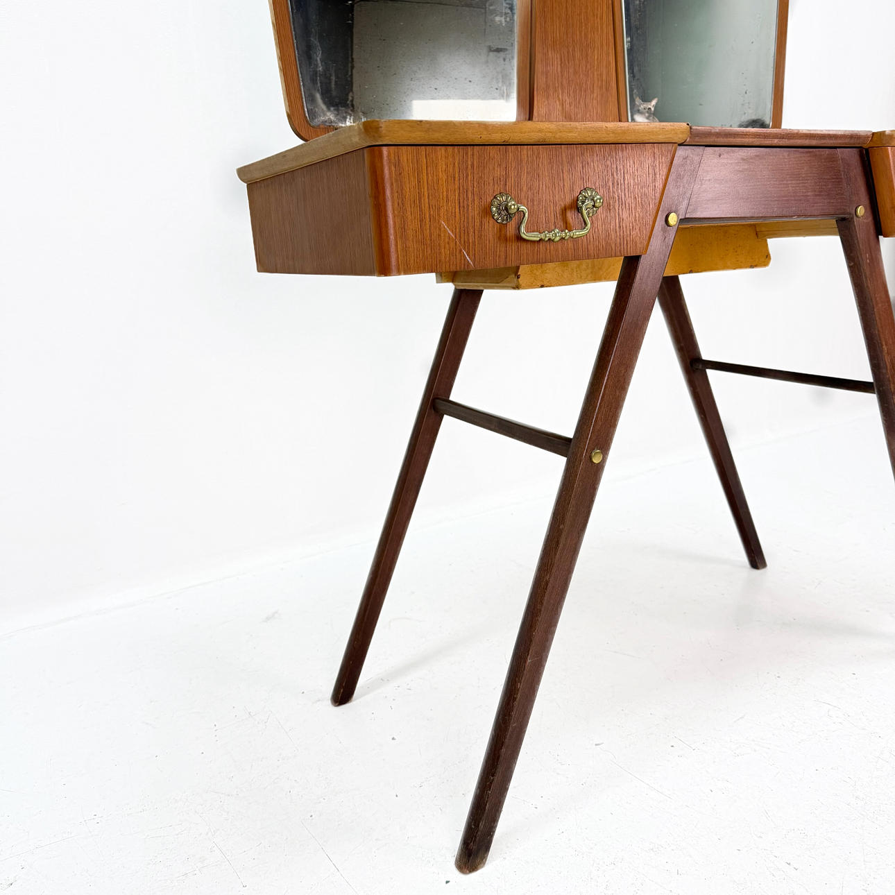 Age and wear and tear, marks on the top of the table. see picture. Lighting not tested, Missing button part, glass cup missing, Mirrors with rust.