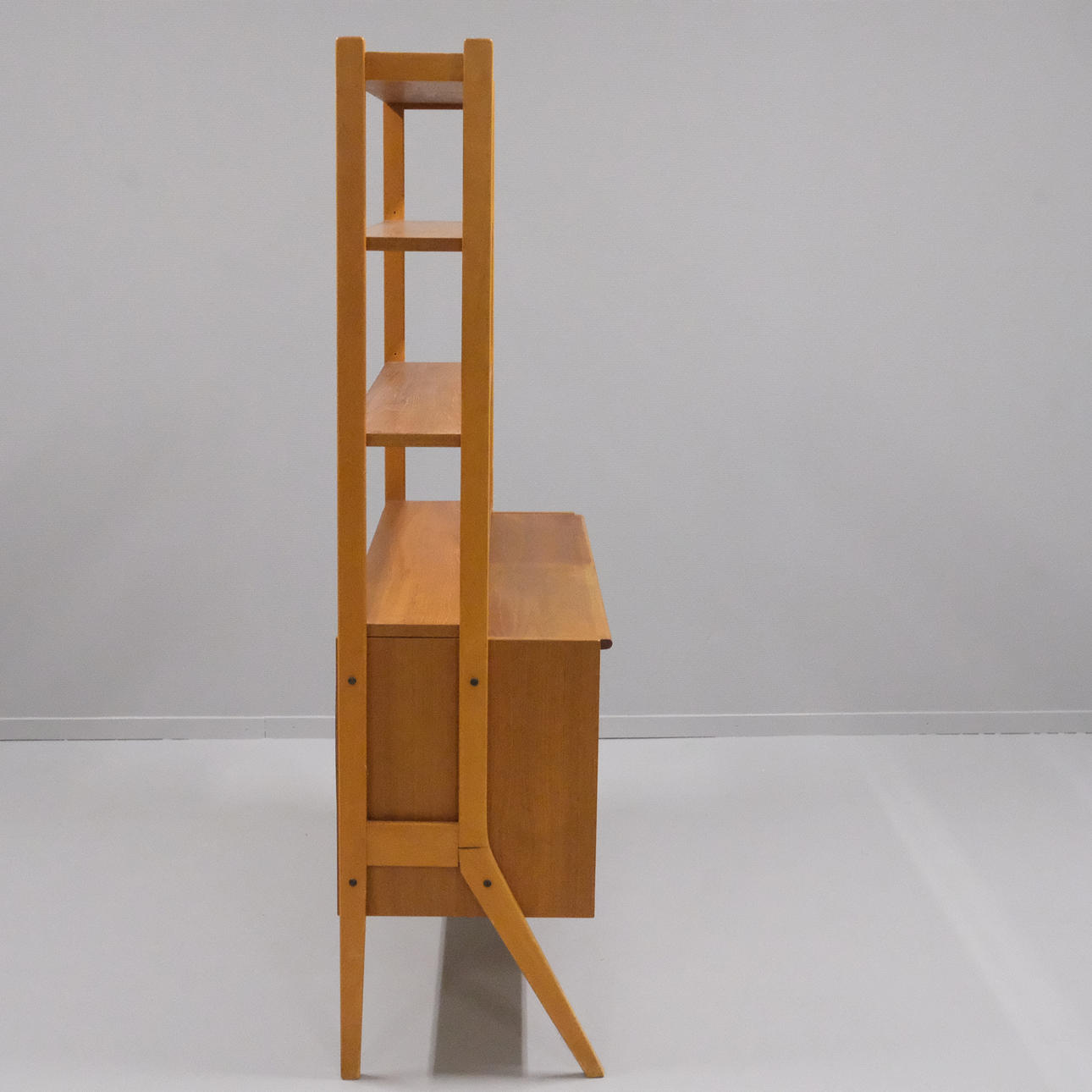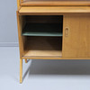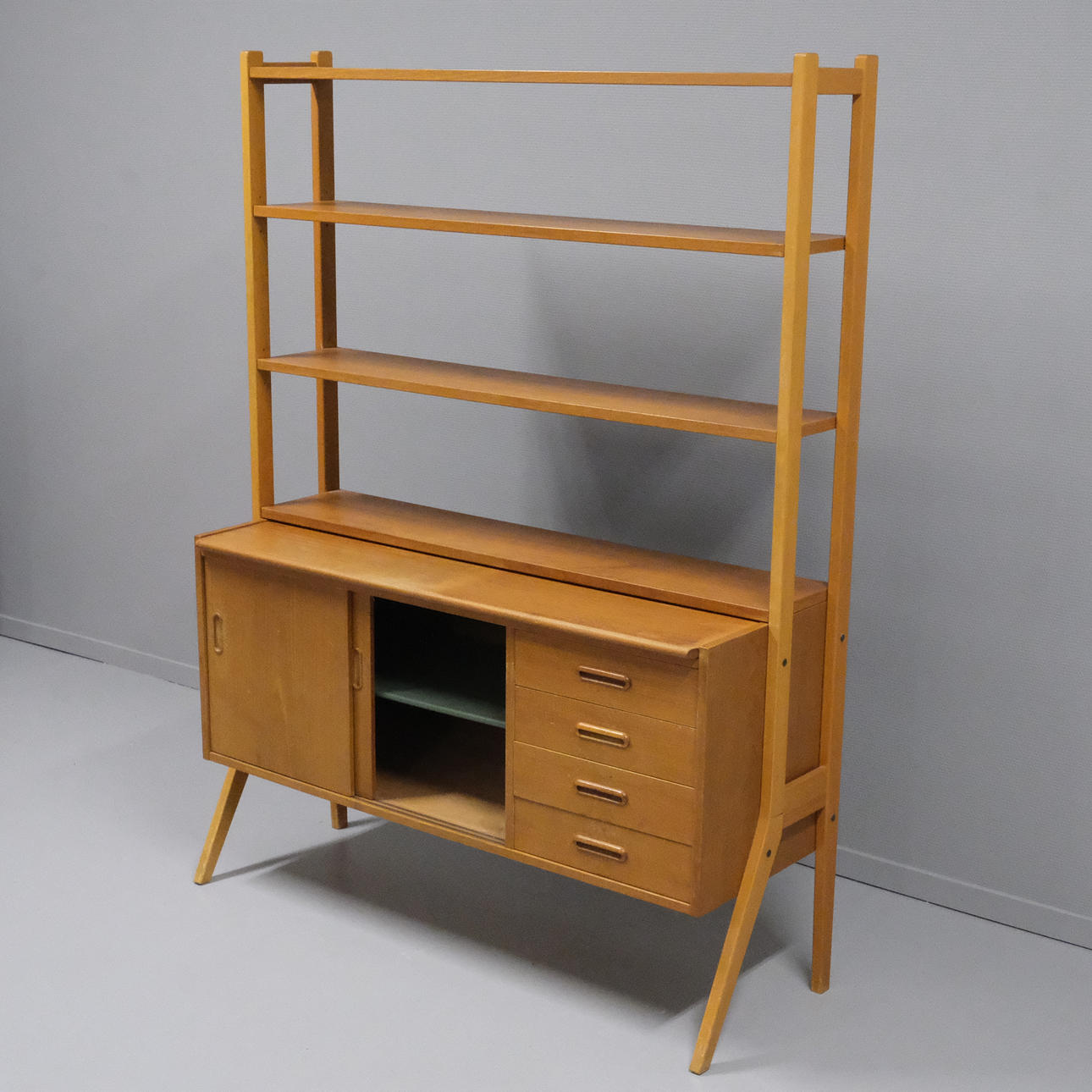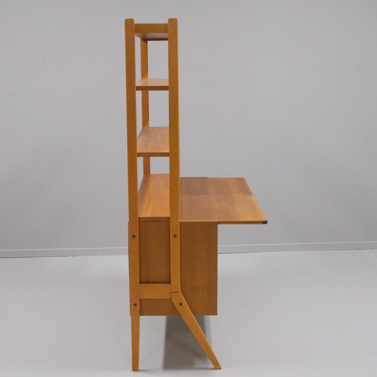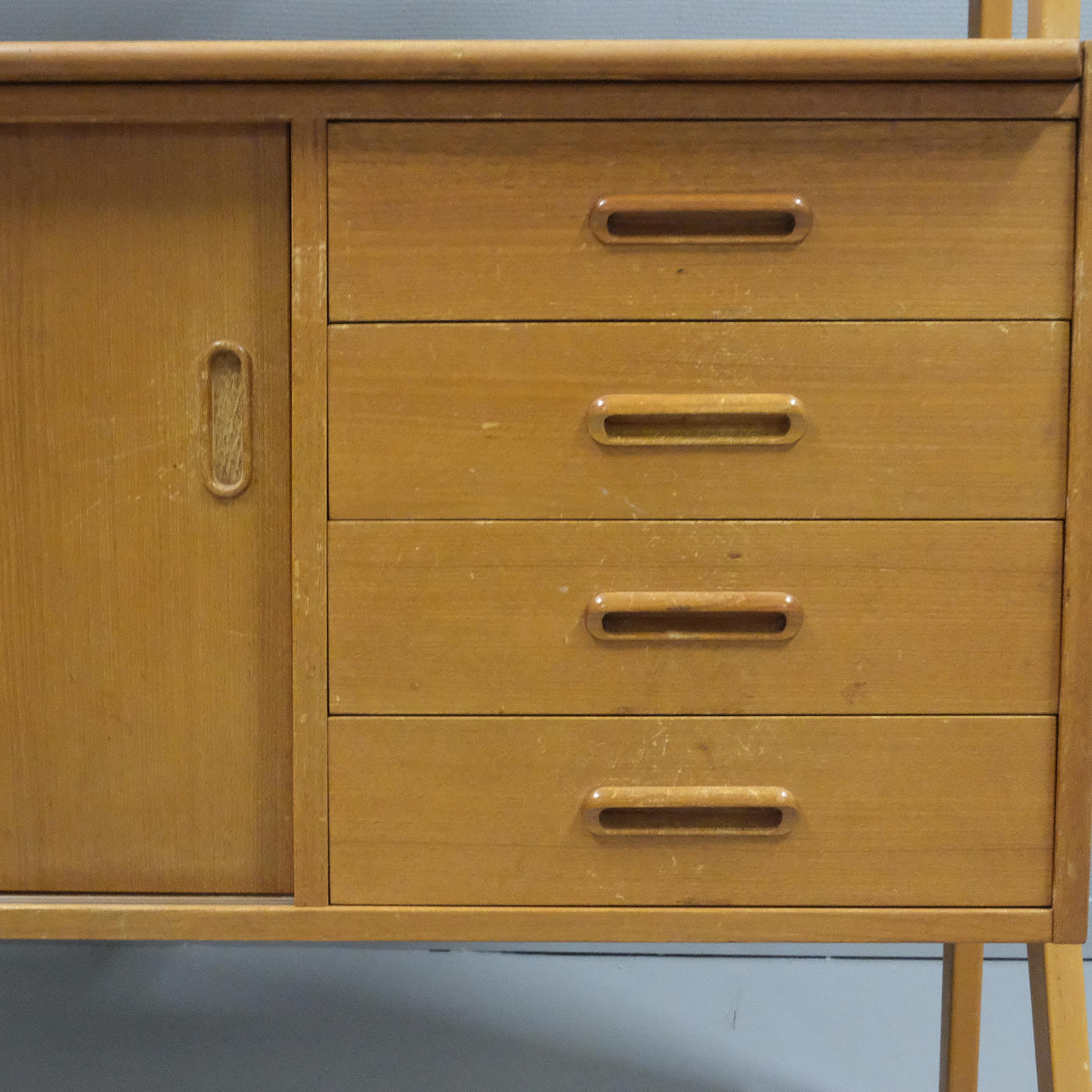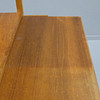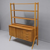 Veneered teak. Drawers, sliding doors and shelves. Height 159cm. Length 120cm. Depth 42cm, extended 63cm.