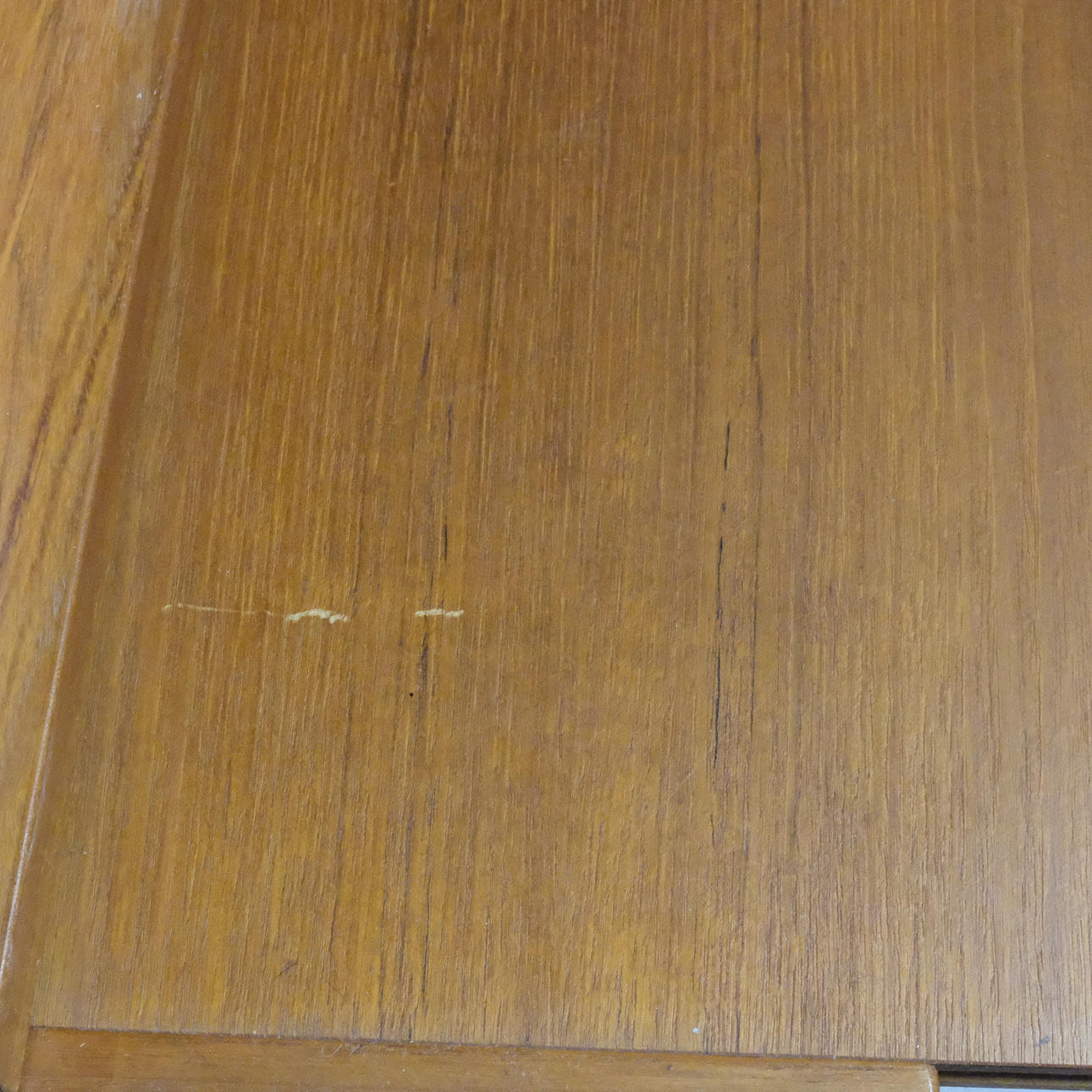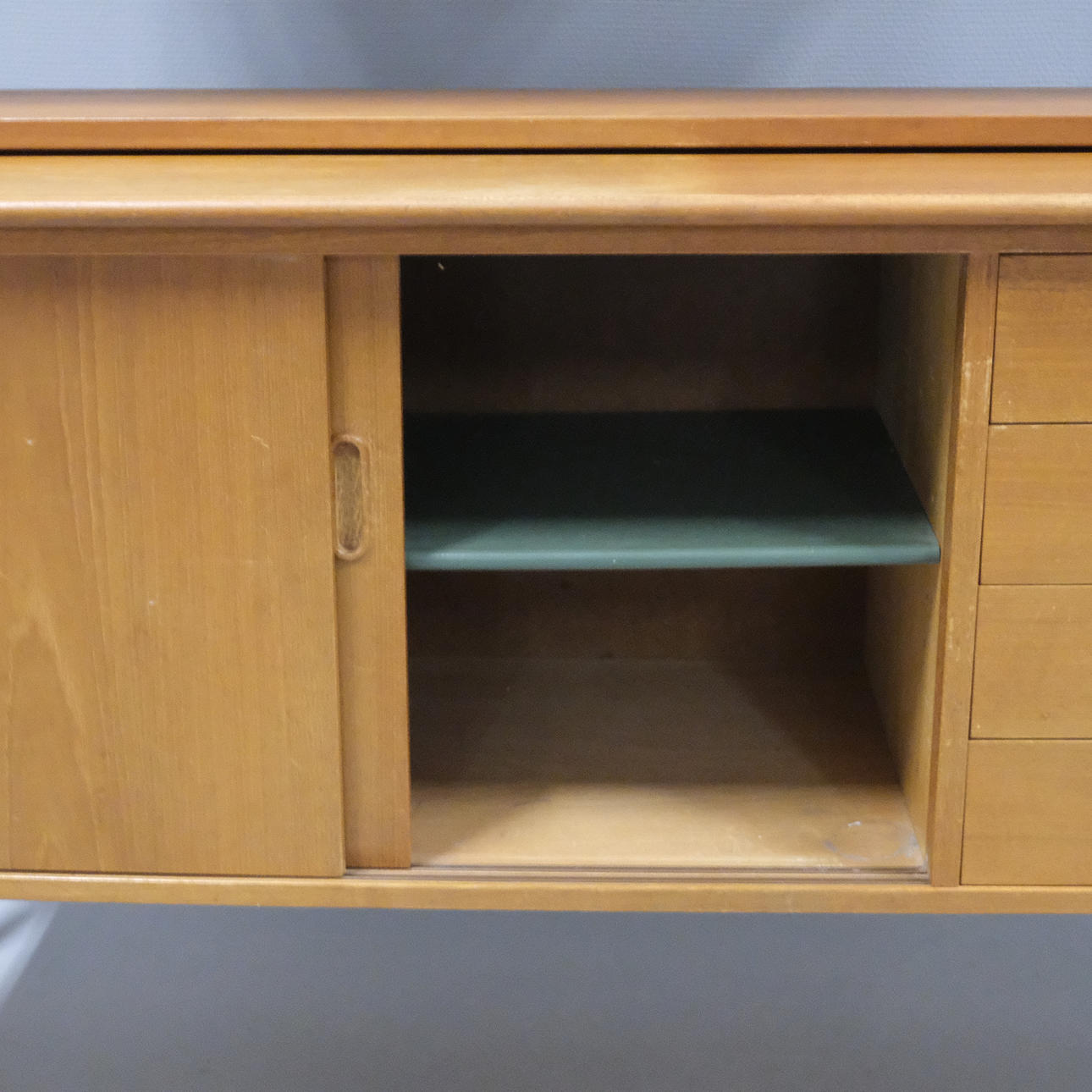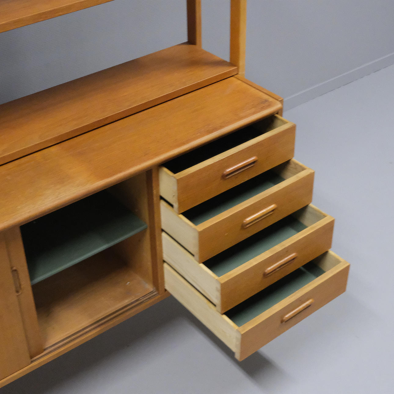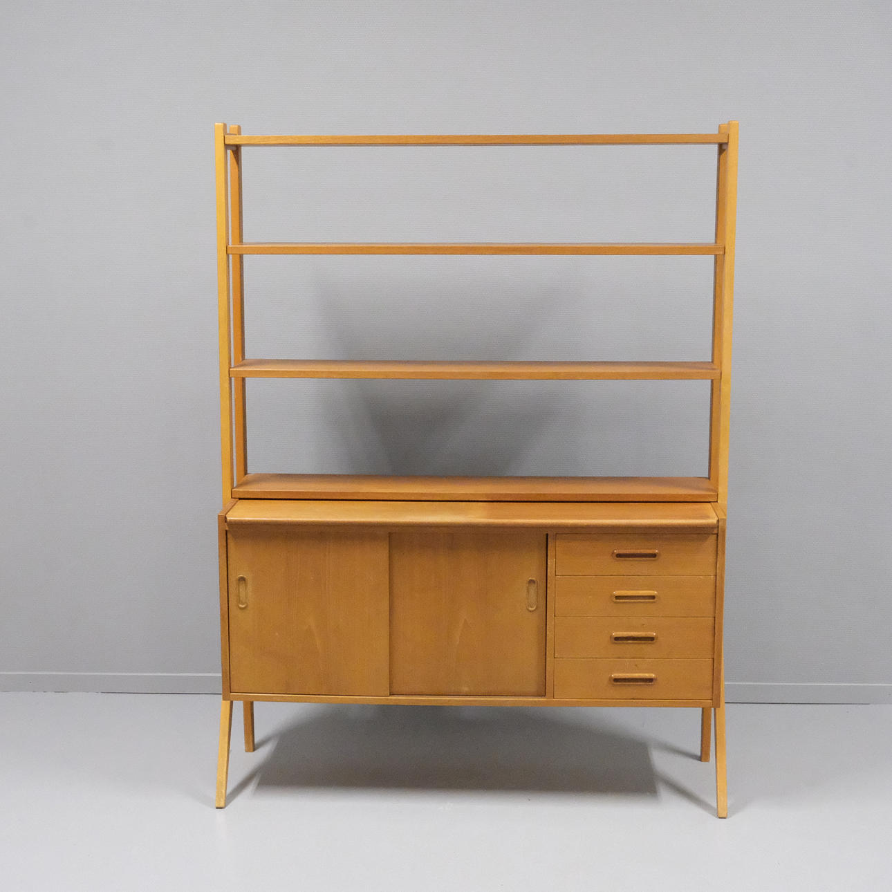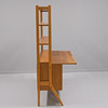 Veneered teak. Drawers, sliding doors and shelves. Height 159cm. Length 120cm. Depth 42cm, extended 63cm.