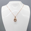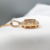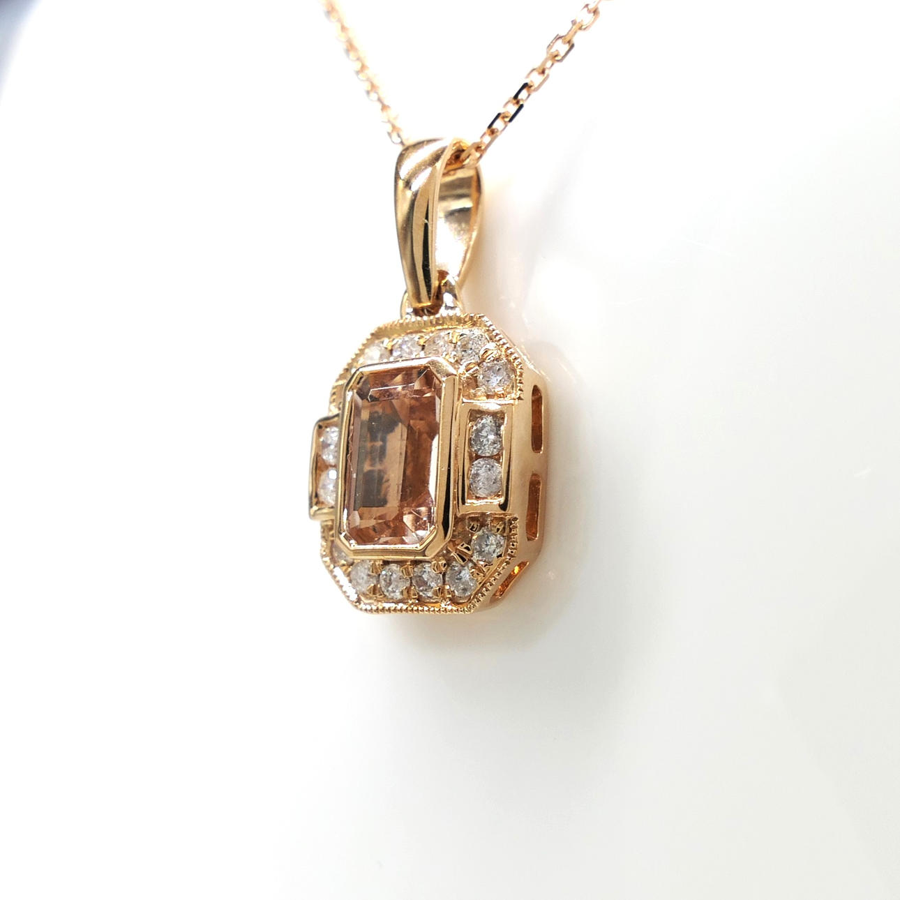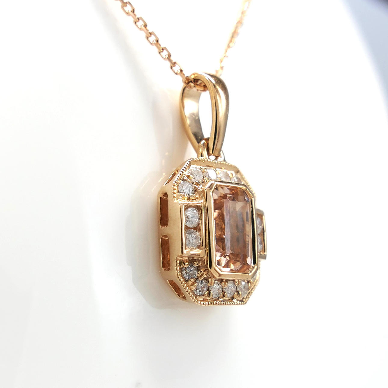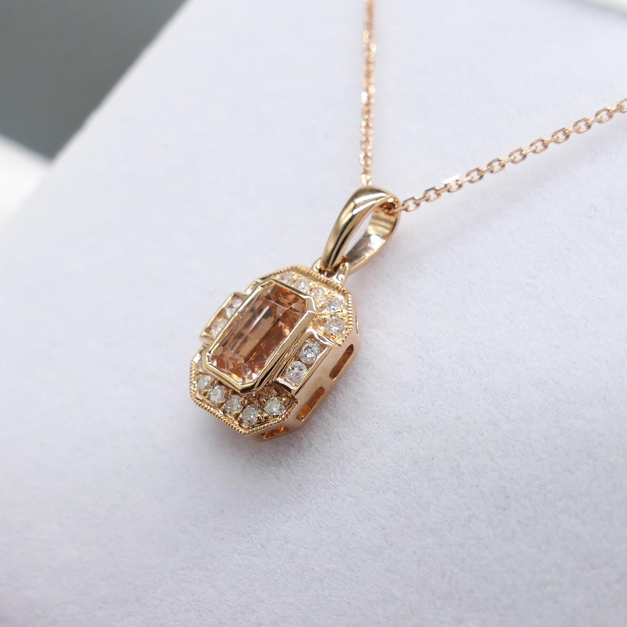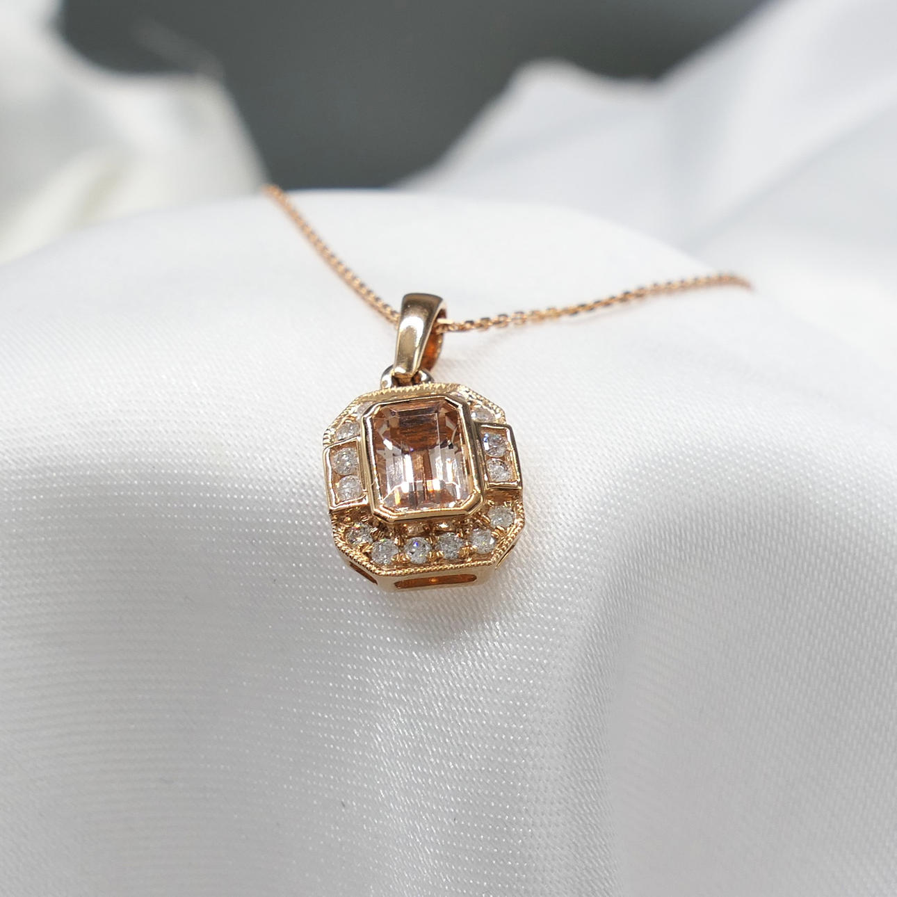 A rose gold Art Deco style morganite and diamond pendant on a rose gold chain, with gift box