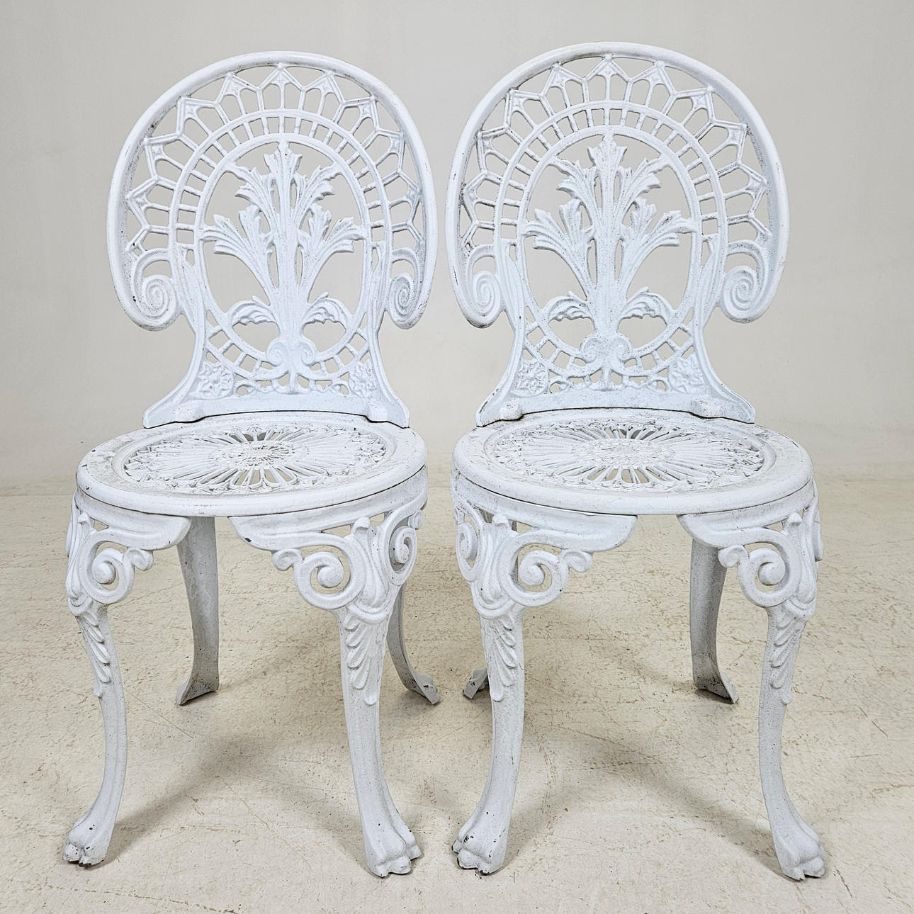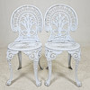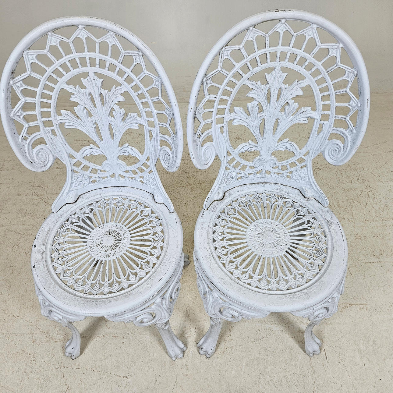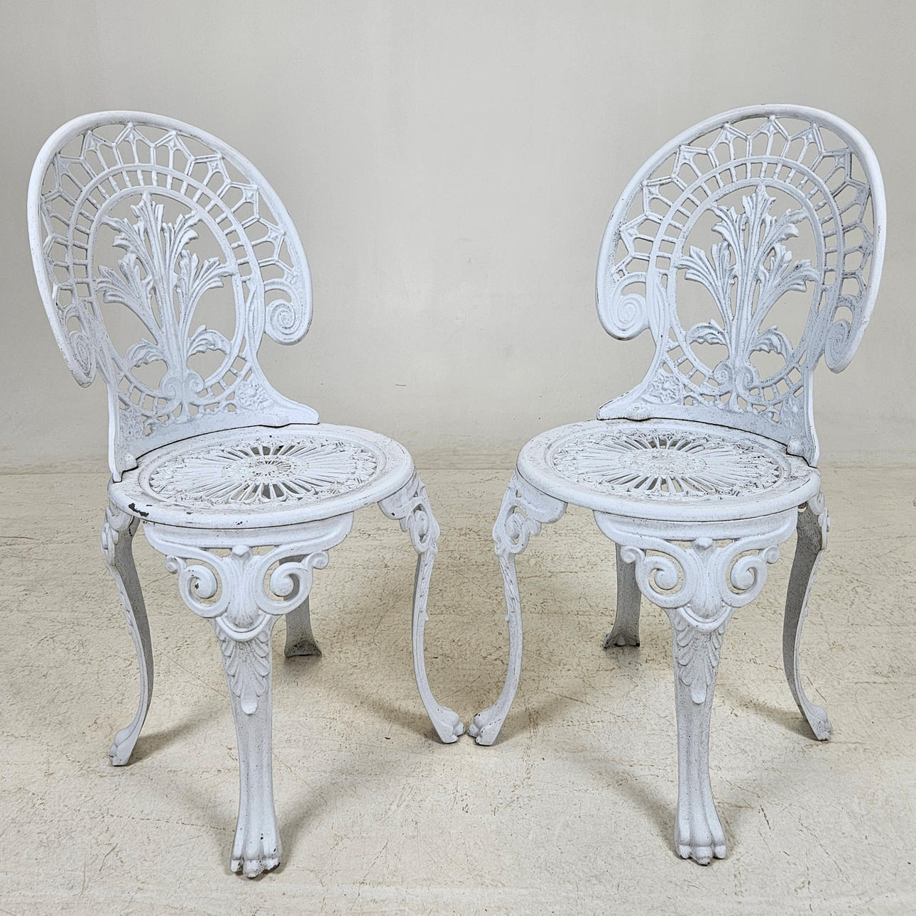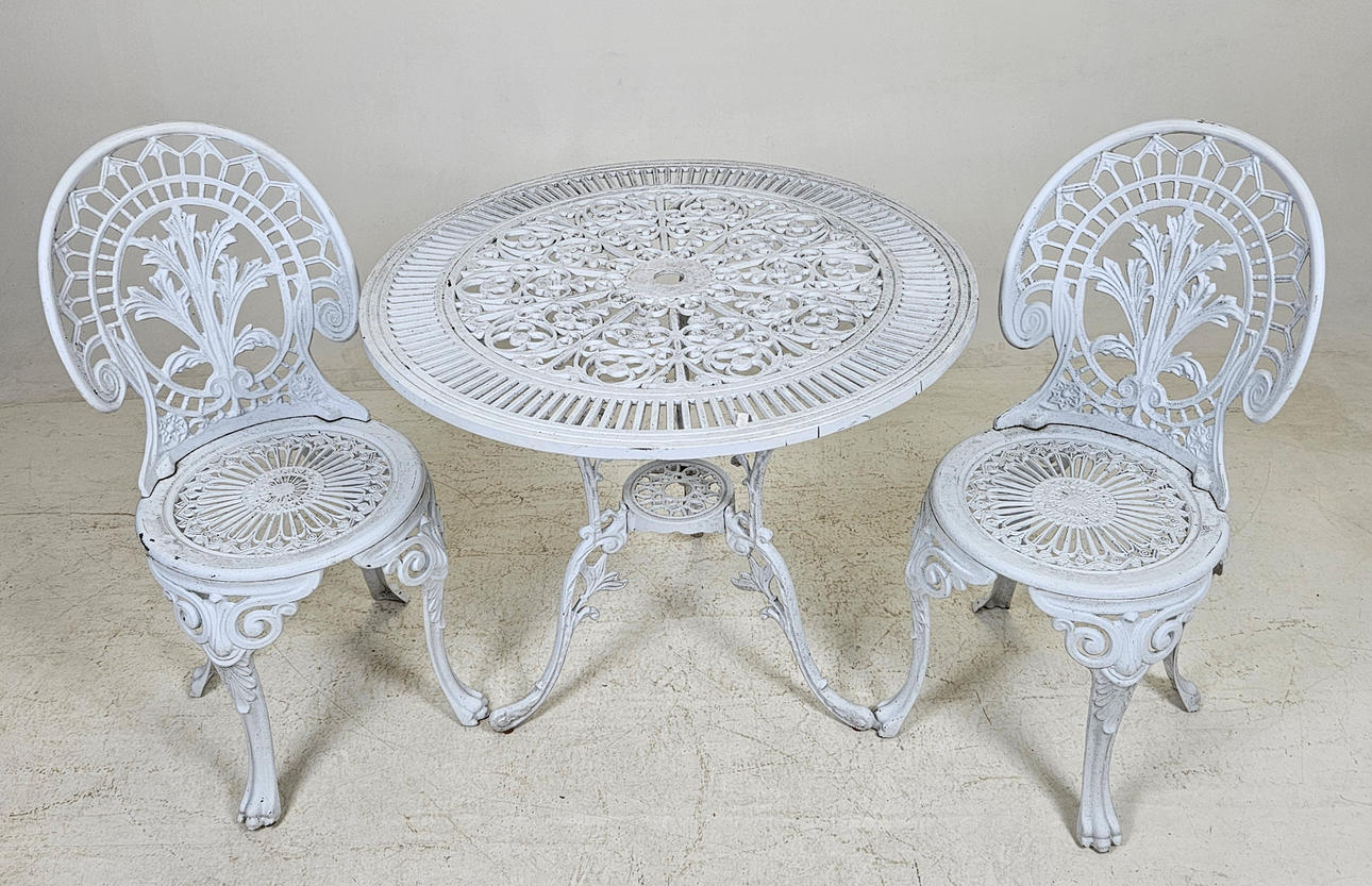 Light metal, openwork decor. Chairs, 2 pcs, height approx. 85, seat height 41 cm. Table, diameter approx. 81, height 68 cm.