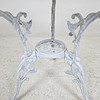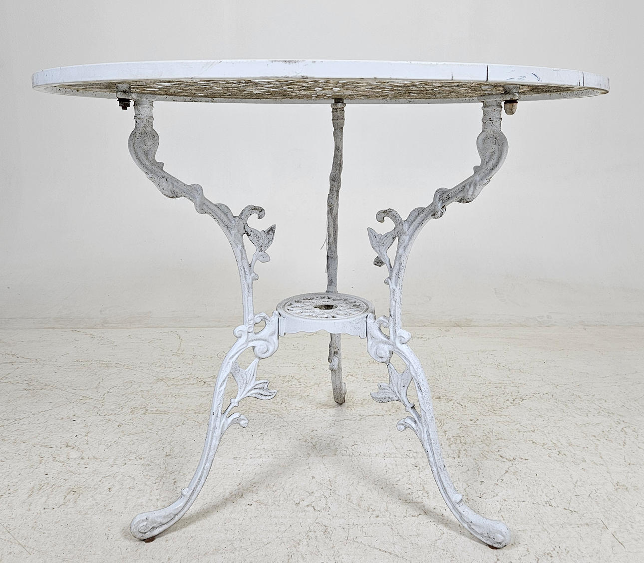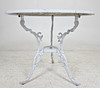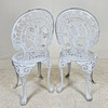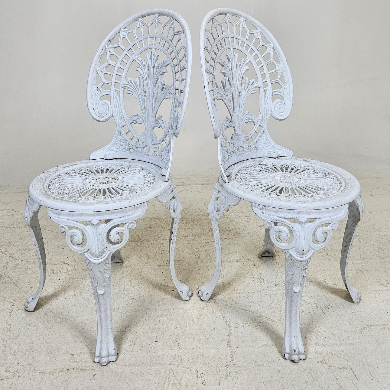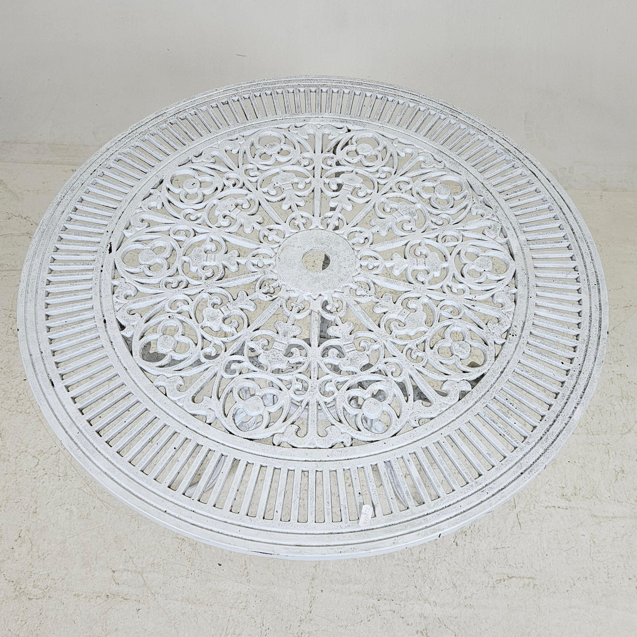 Light metal, openwork decor. Chairs, 2 pcs, height approx. 85, seat height 41 cm. Table, diameter approx. 81, height 68 cm.