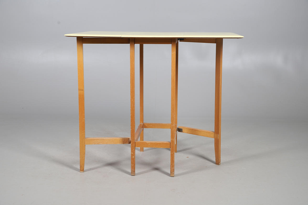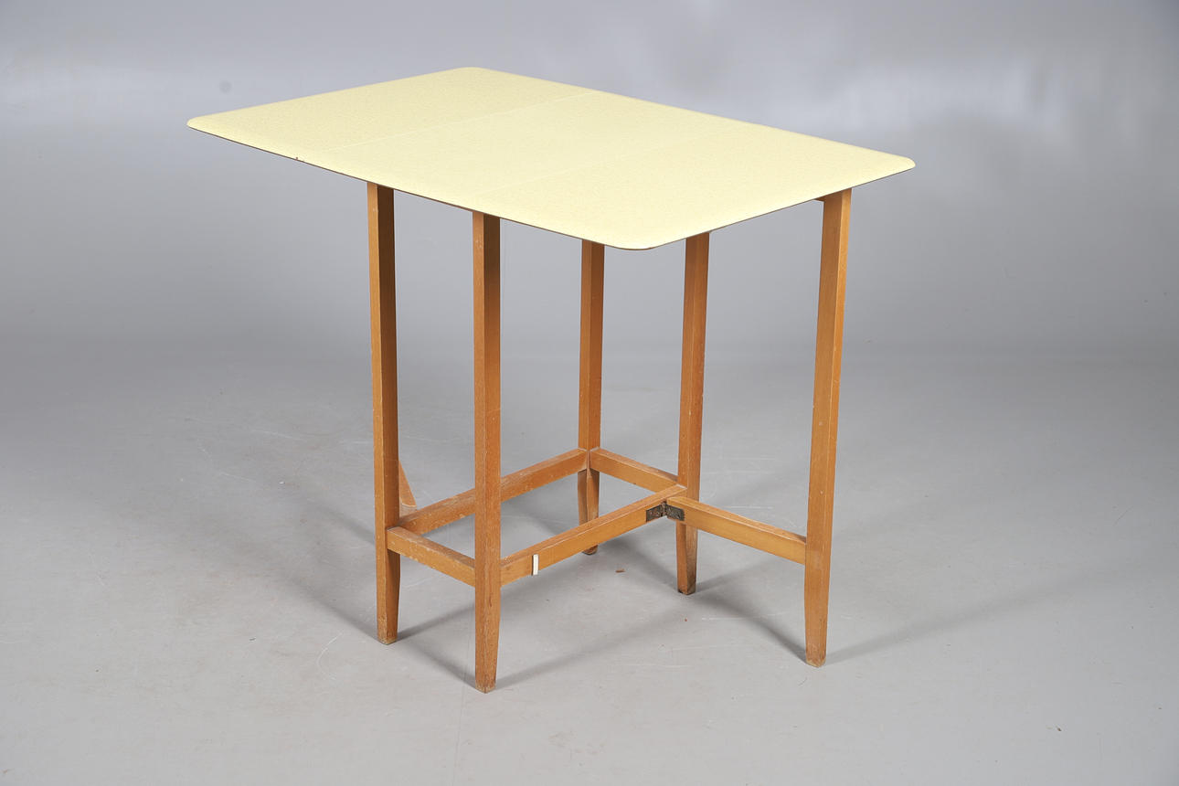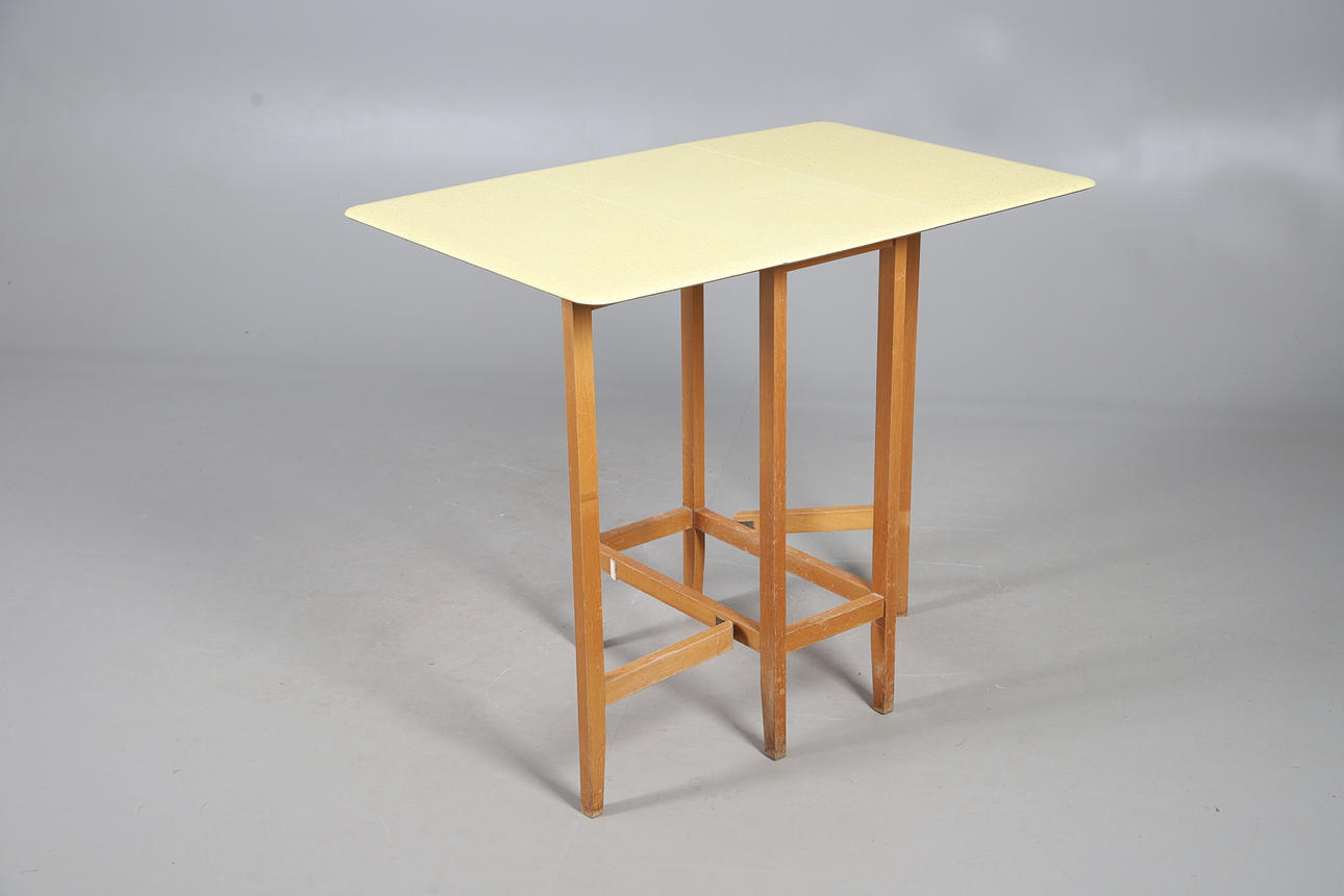 4954988. A 1960S YELLOW FORMICA TOP DROP LEAF TABLE.