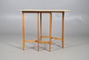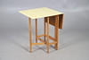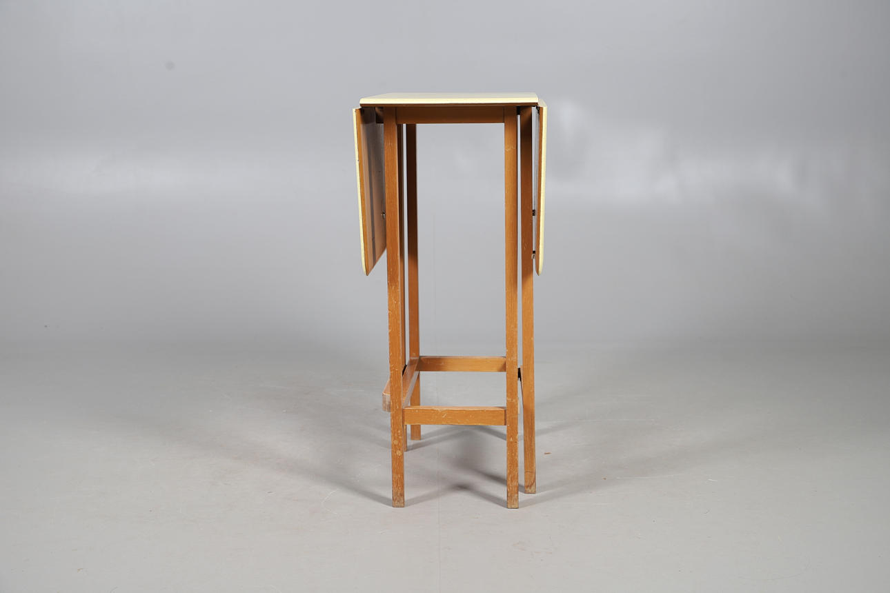 A 1960s yellow Formica top drop leaf table, 75cm (h) x 61cm (w) x 34cm (collapsed length) (each leaf measures 30cm).