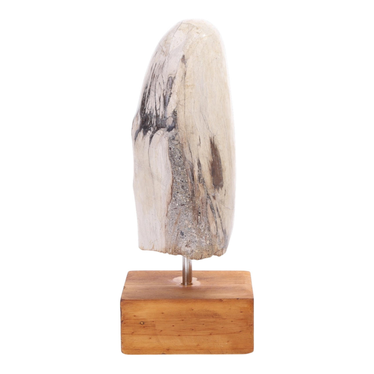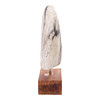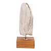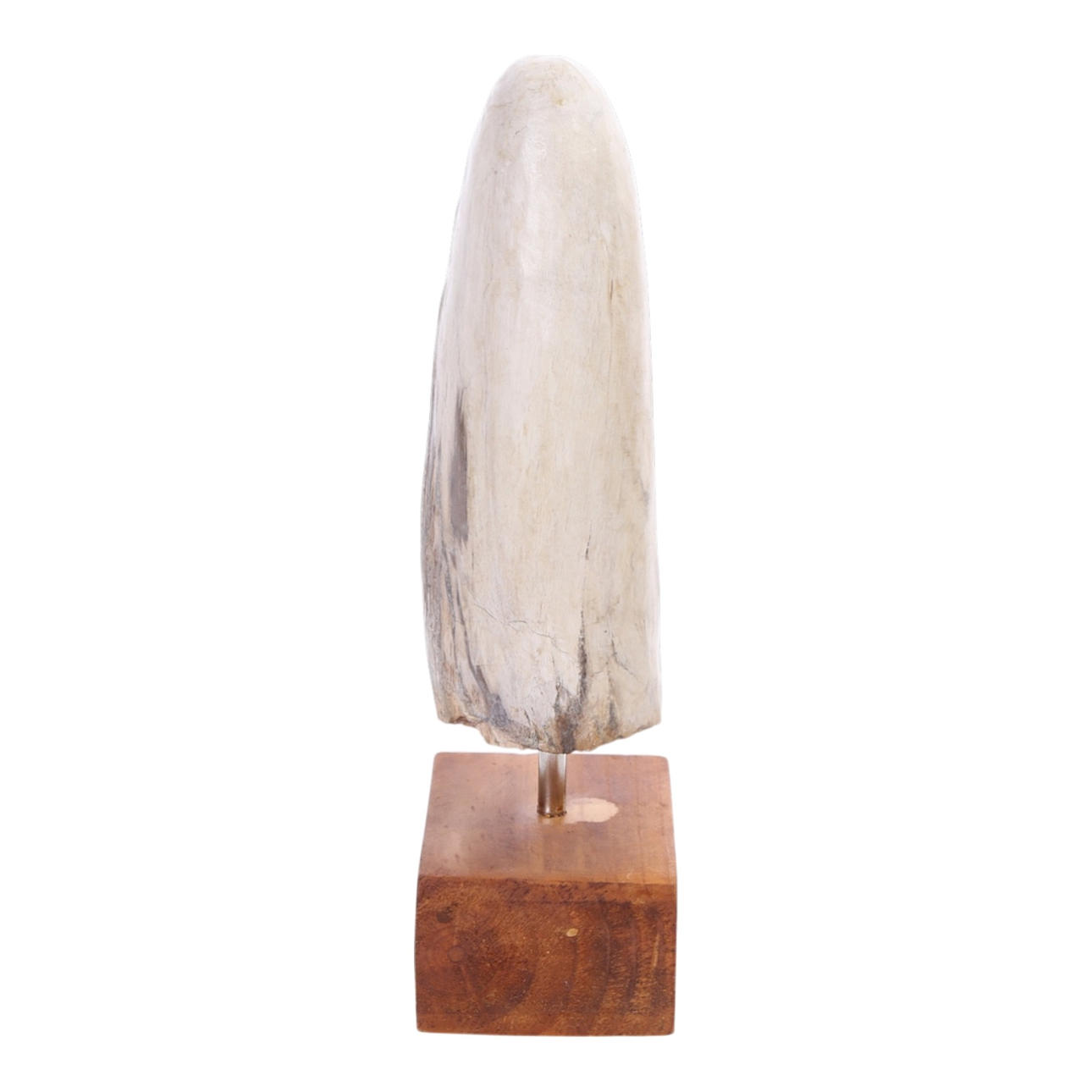 Petrified tooth/tusk. Set up on wooden plinth. Measure Tooth H. 23,5, B. 9.5, D. 8 cm. Goals incl. stand H. 32. B. 13, D. 8.5 cm.