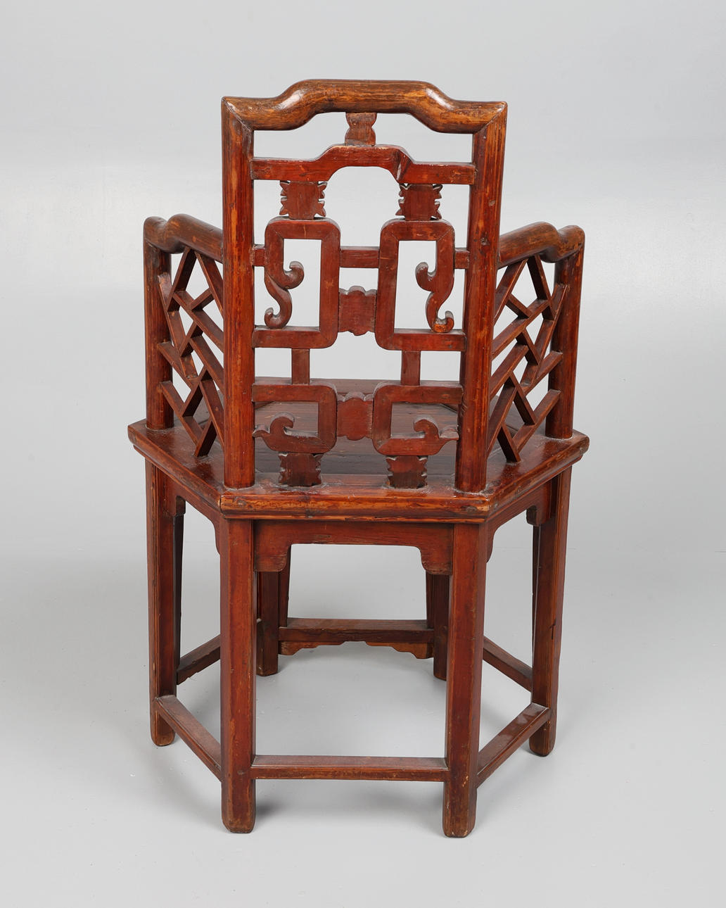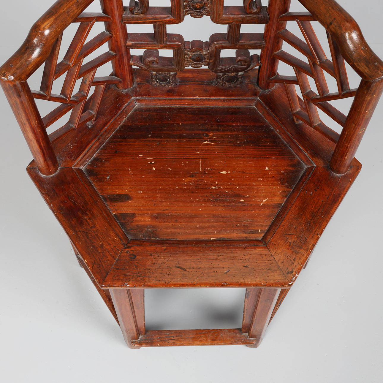 4955512. SMALL EARLY 20TH CENTURY CHINESE PINE HEXAGONAL ARMCHAIR.