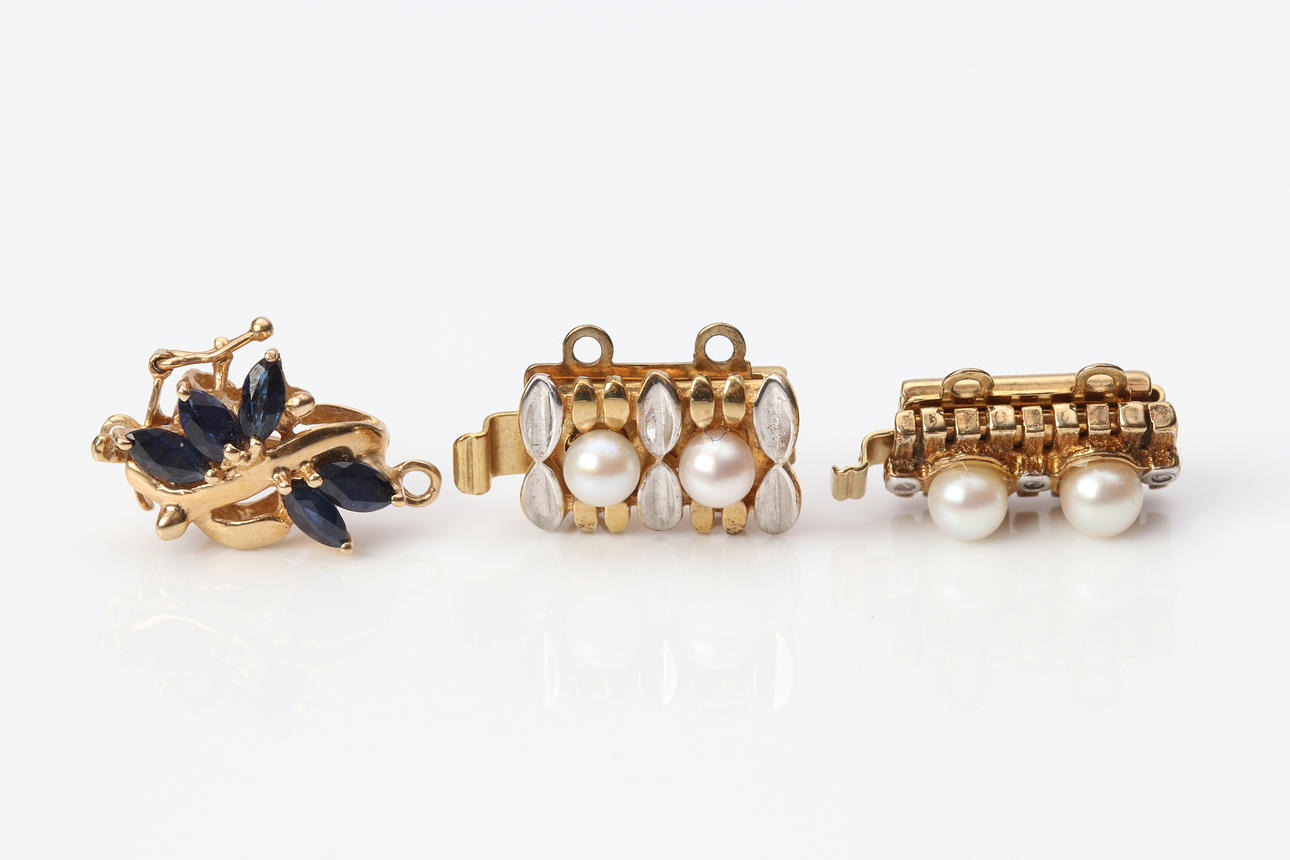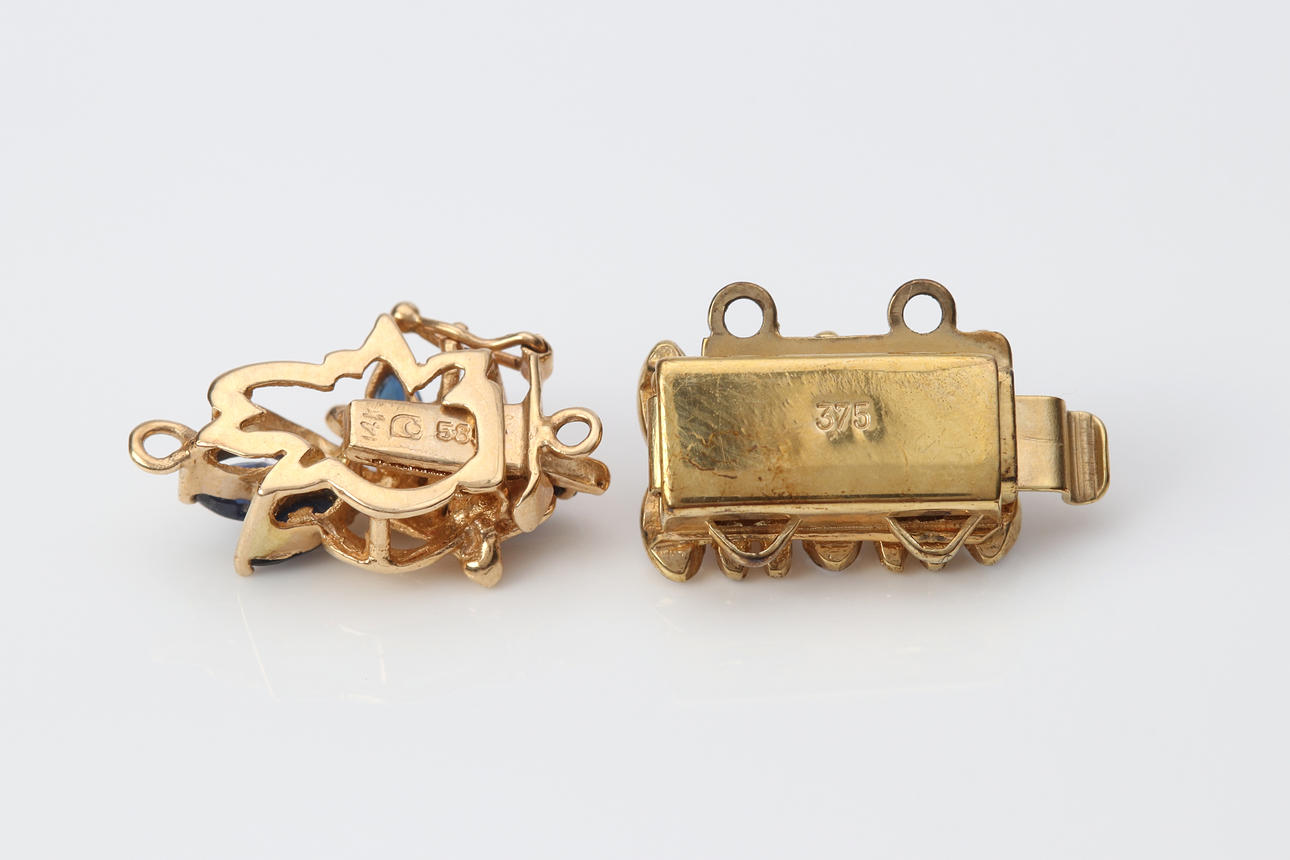 A clasp in 14k gold with sapphires, total weight approx. 1.3 grams.