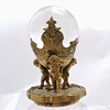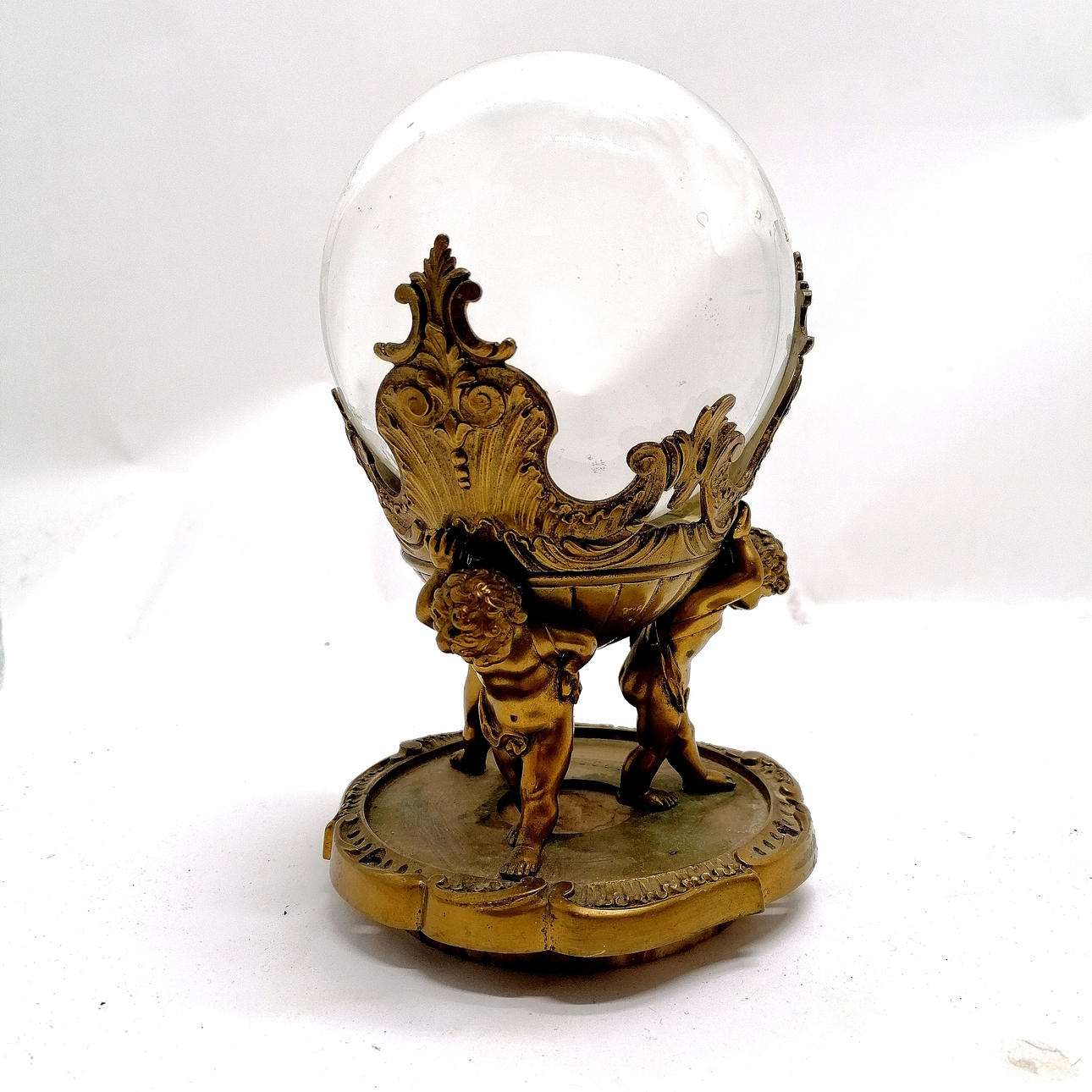 Antique clear glass sphere held in a brass base supported by 3 putti total height 20cm.