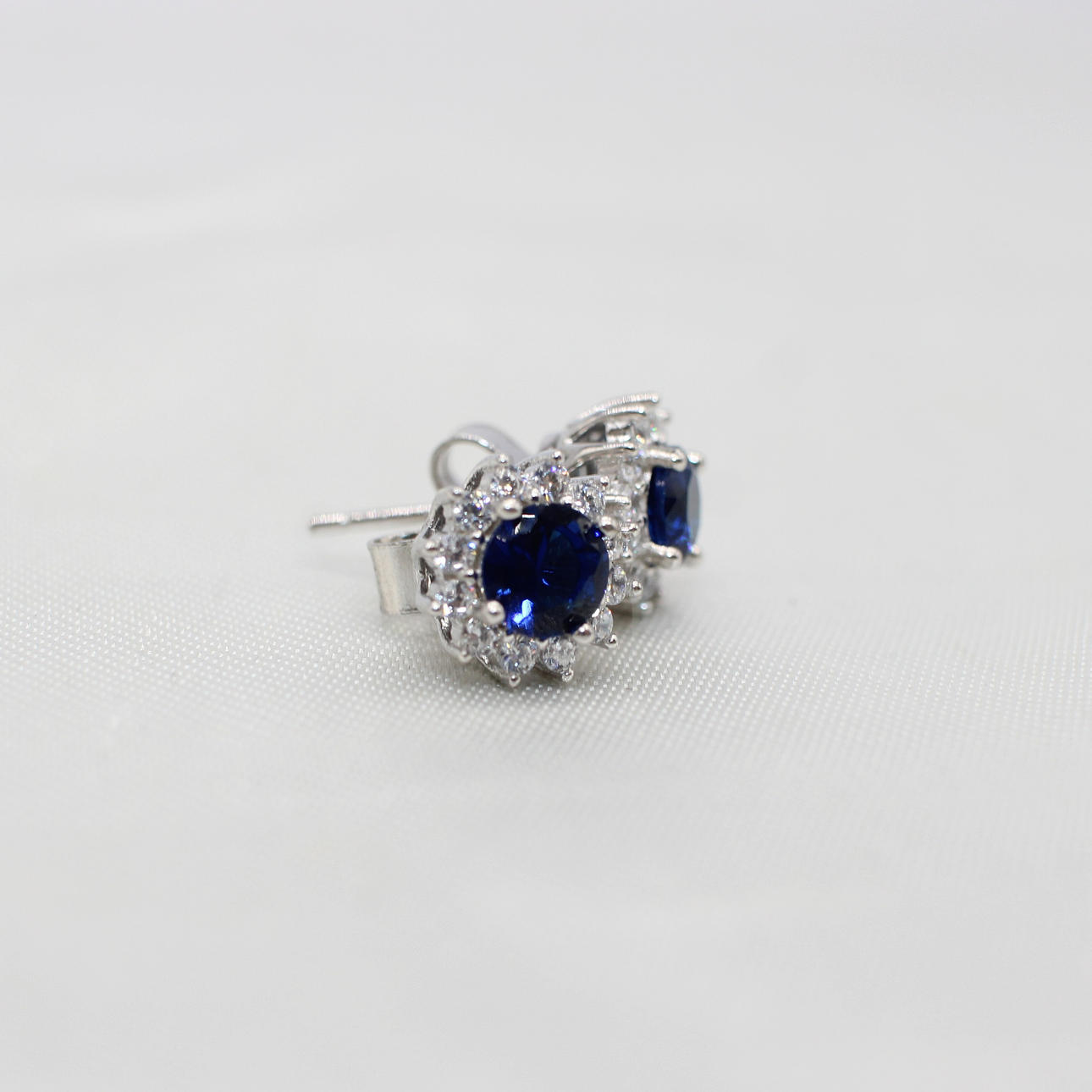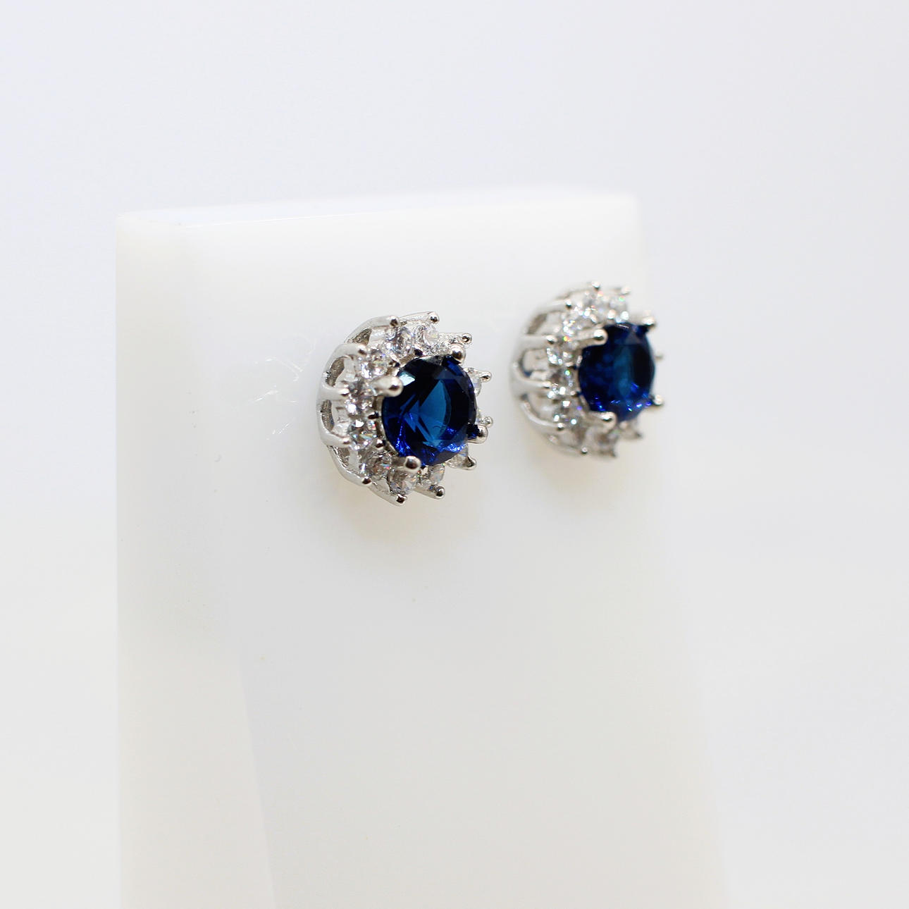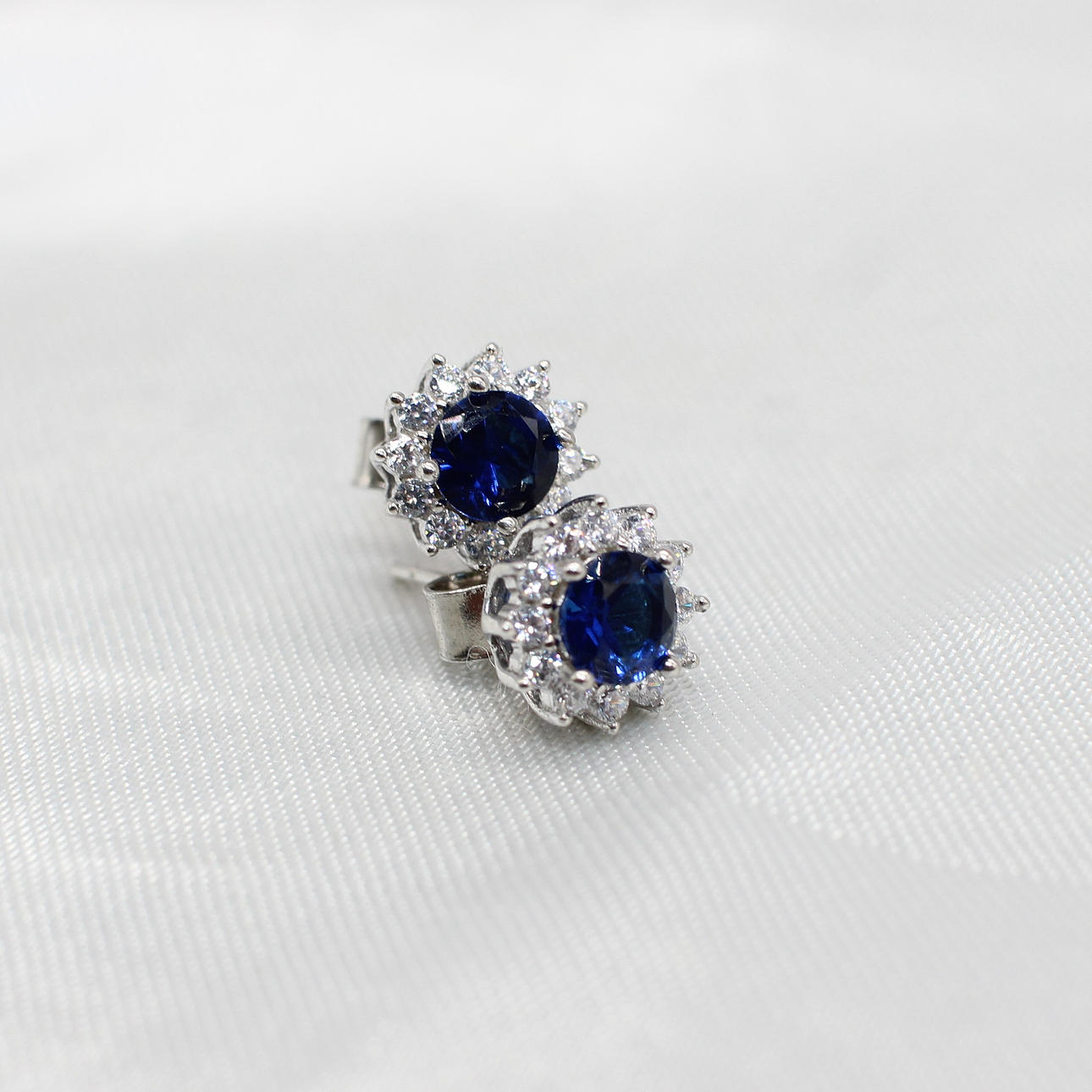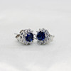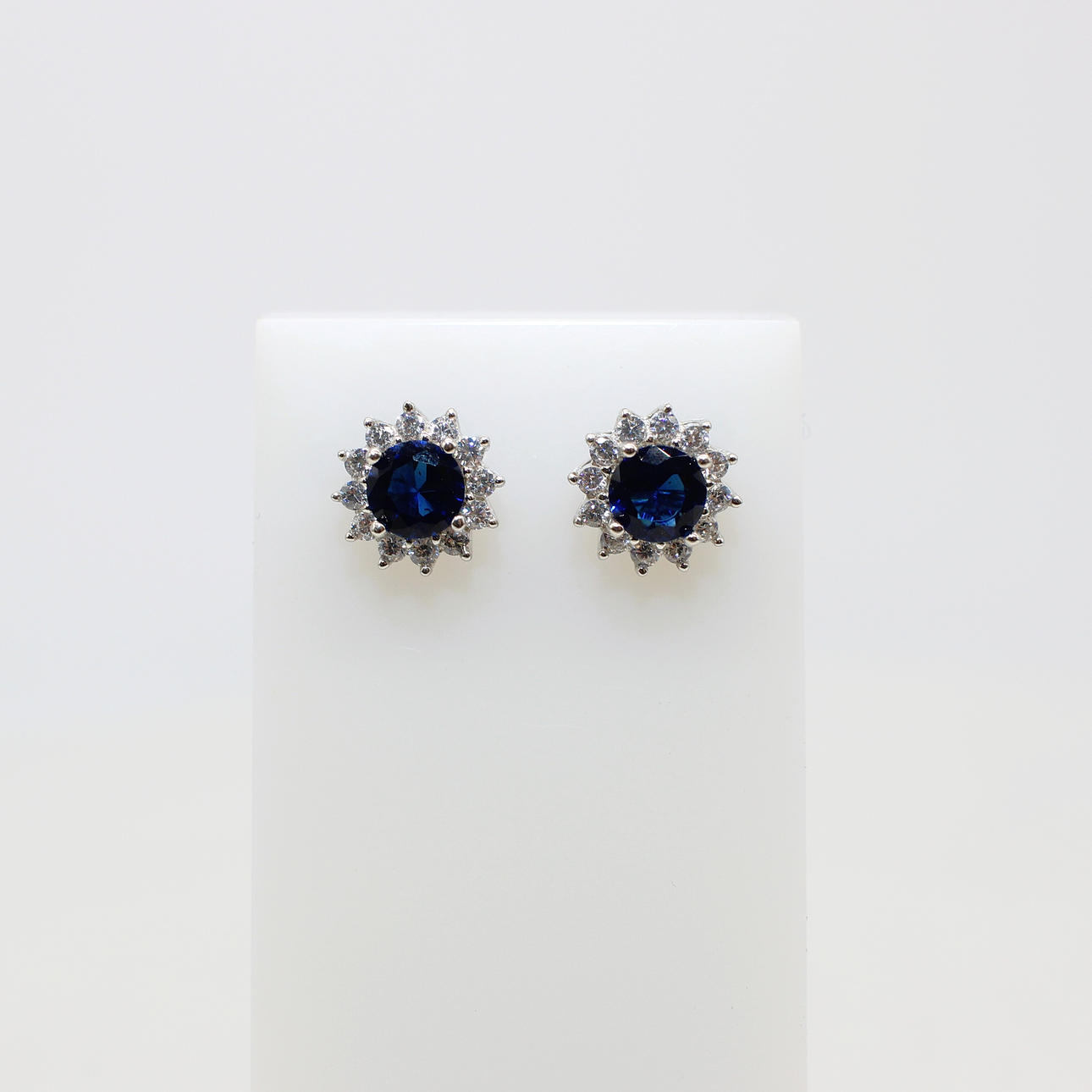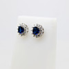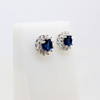 A Pair Of Round Blue Cubic Zirconia Ear Studs With A Halo Of Clear Cubic Zirconia's In Silver (Stamped "925").