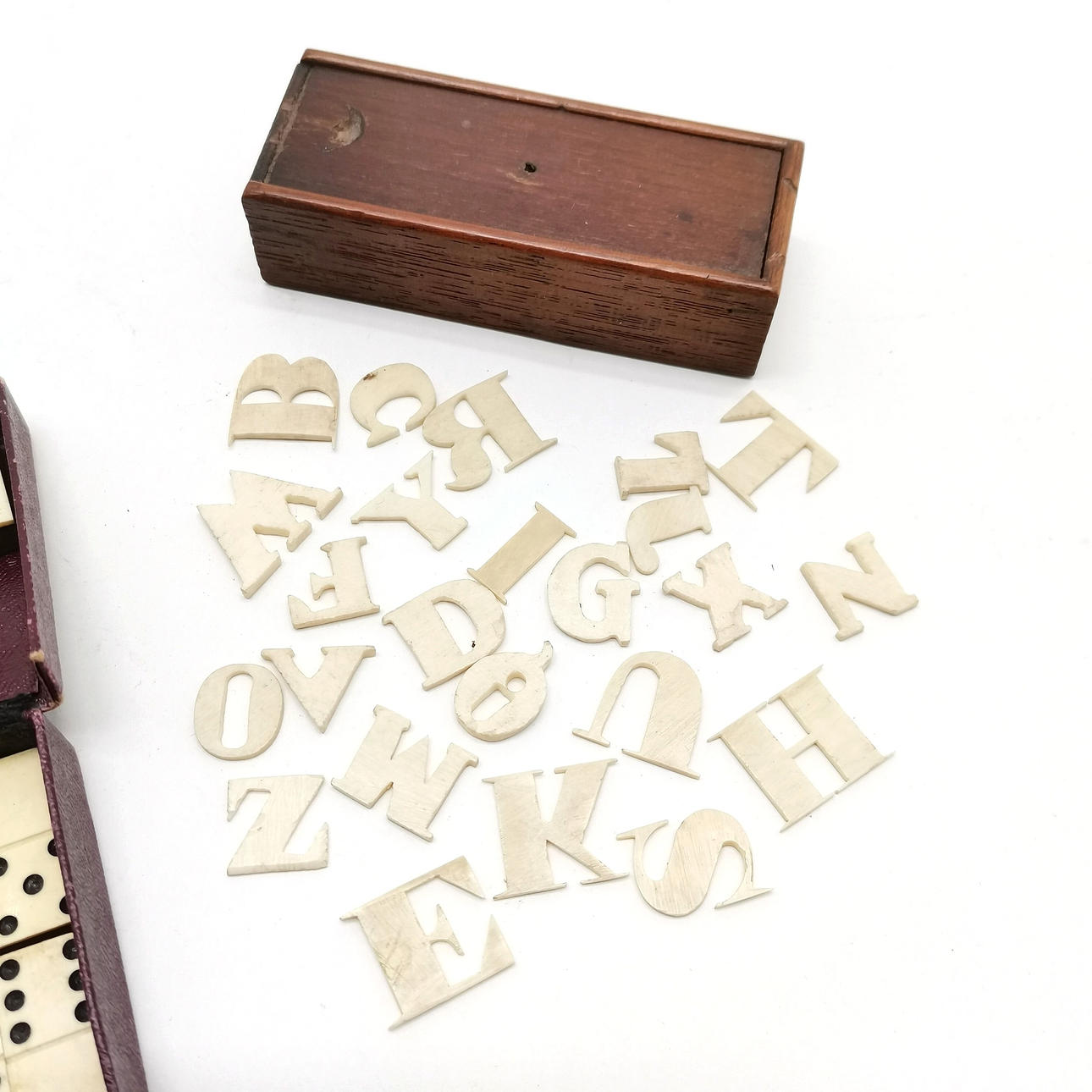 Antique hand carved bone alphabet in original mahogany box (8cm x 3cm x 2cm high) - missing letter A and P T/W a boxed set of antique miniature dominoes 9cm x 5cm - missing 1.