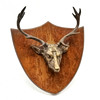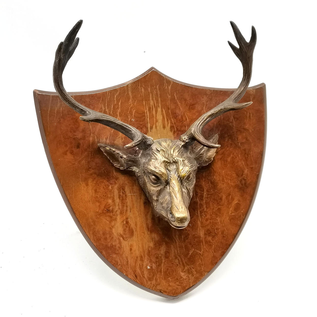 Antique bronze stags head mounted on a walnut wall plaque 20cm x 20cm.