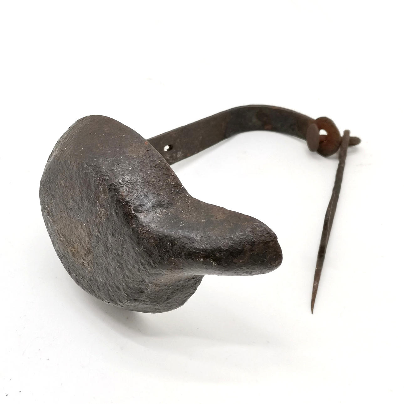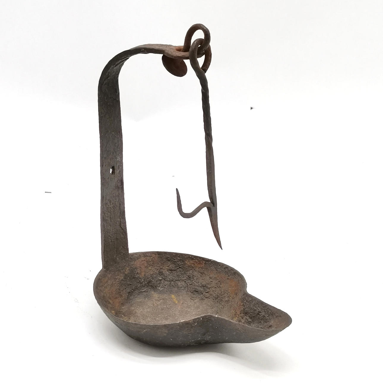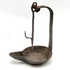 Antique wrought iron hanging lard/whale fat lamp 19cm high.