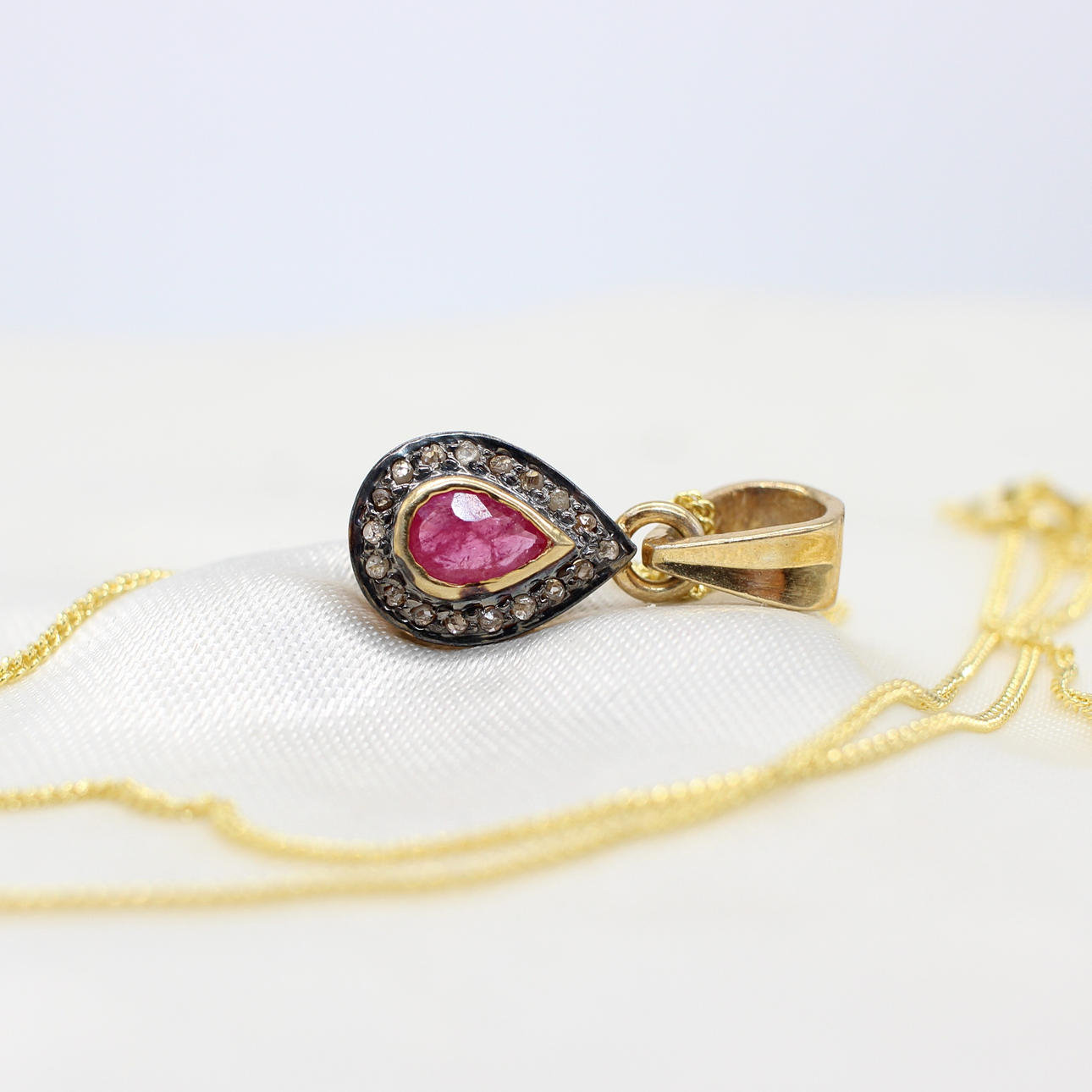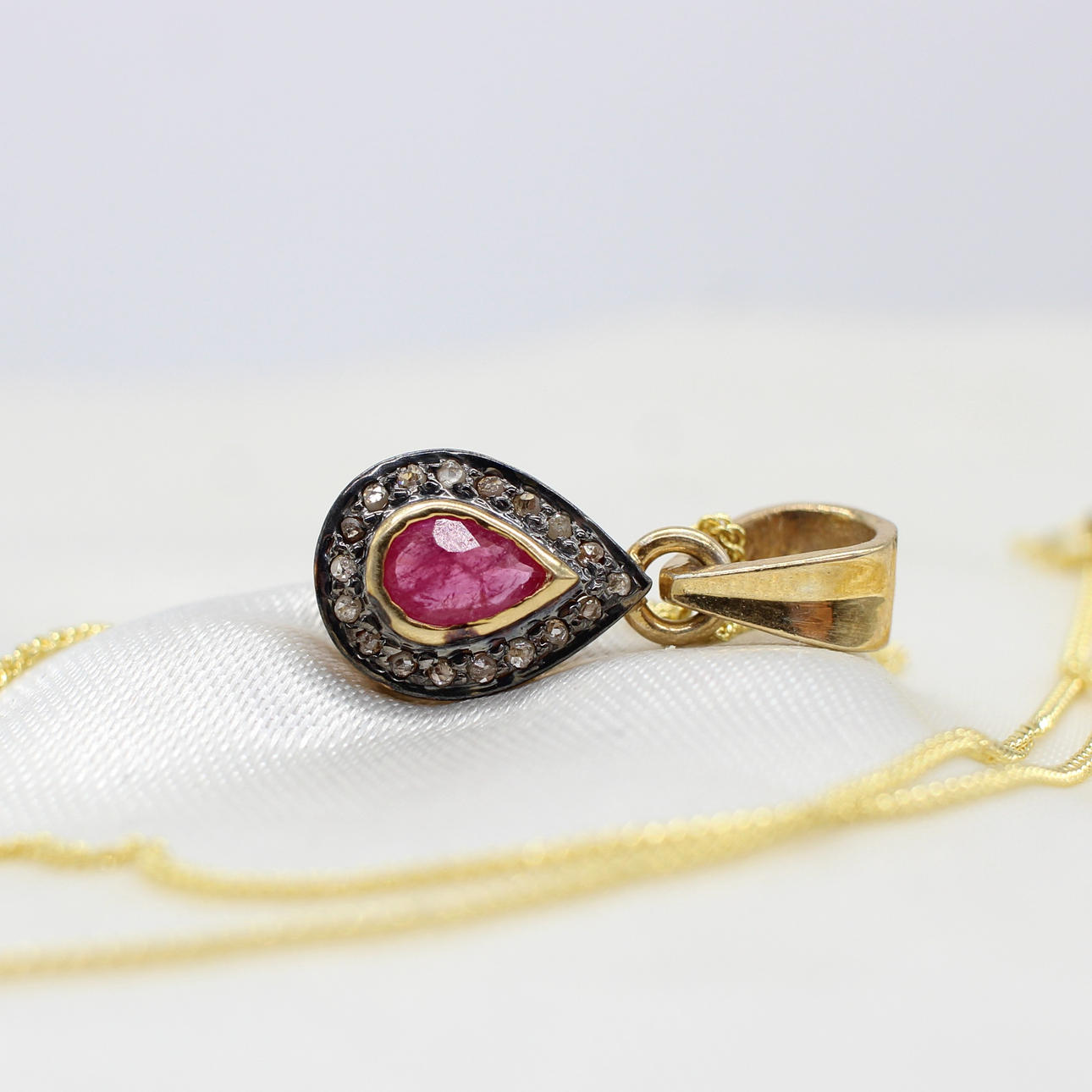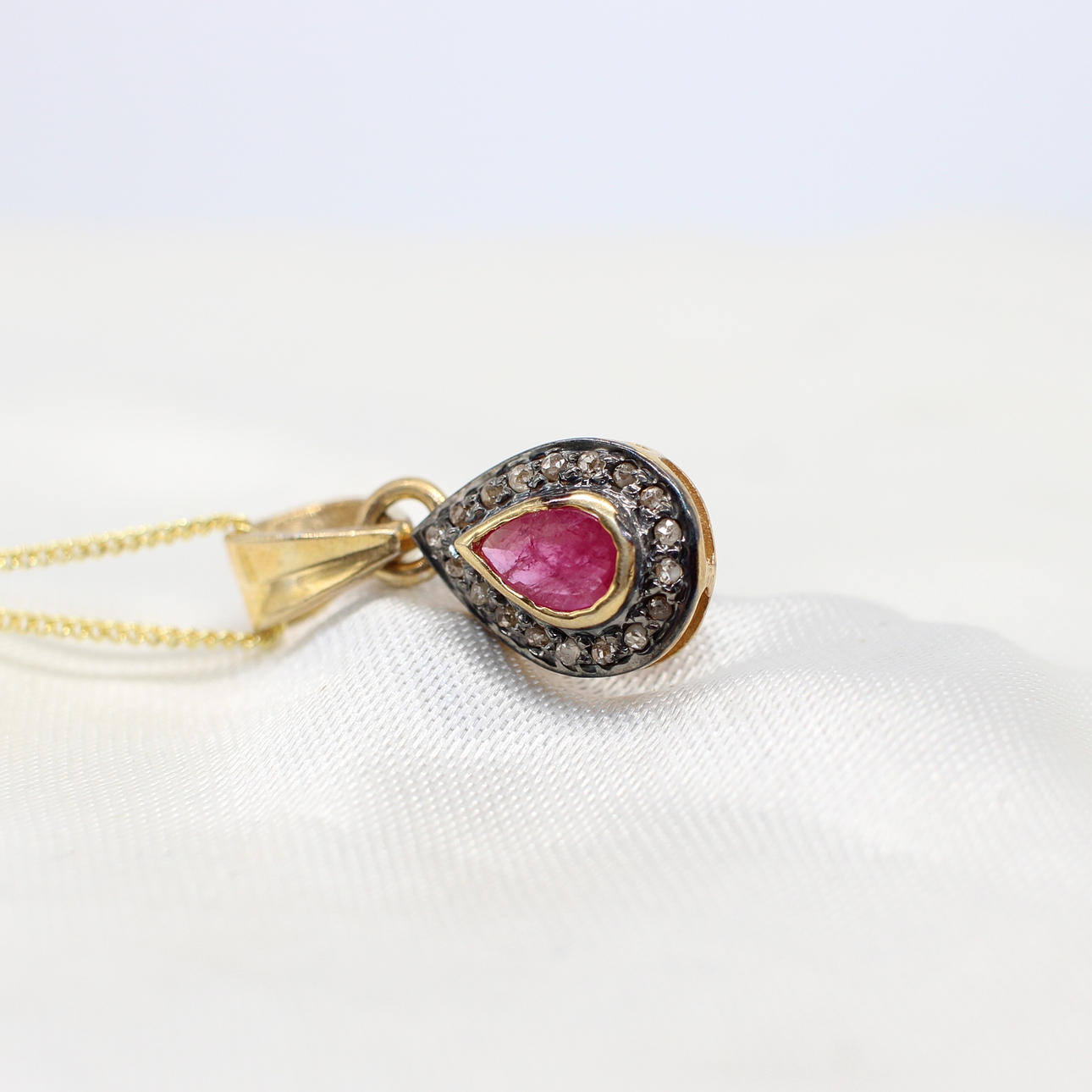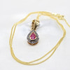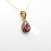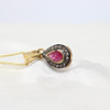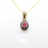 Necklace features a central pear cut ruby of approximately 0.25ct and a halo of rose cut diamonds, approximately 0.15ct in total