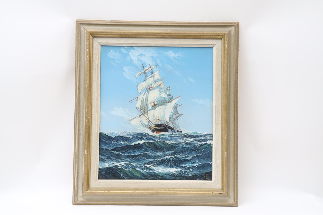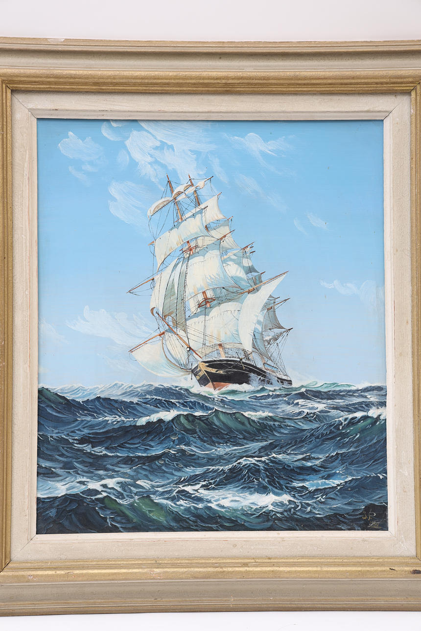 OIDENTIFIERAD KONSTNÄR. Sea view with ship, monogram signed JP and dated 1950. Oil painting on panel.