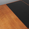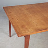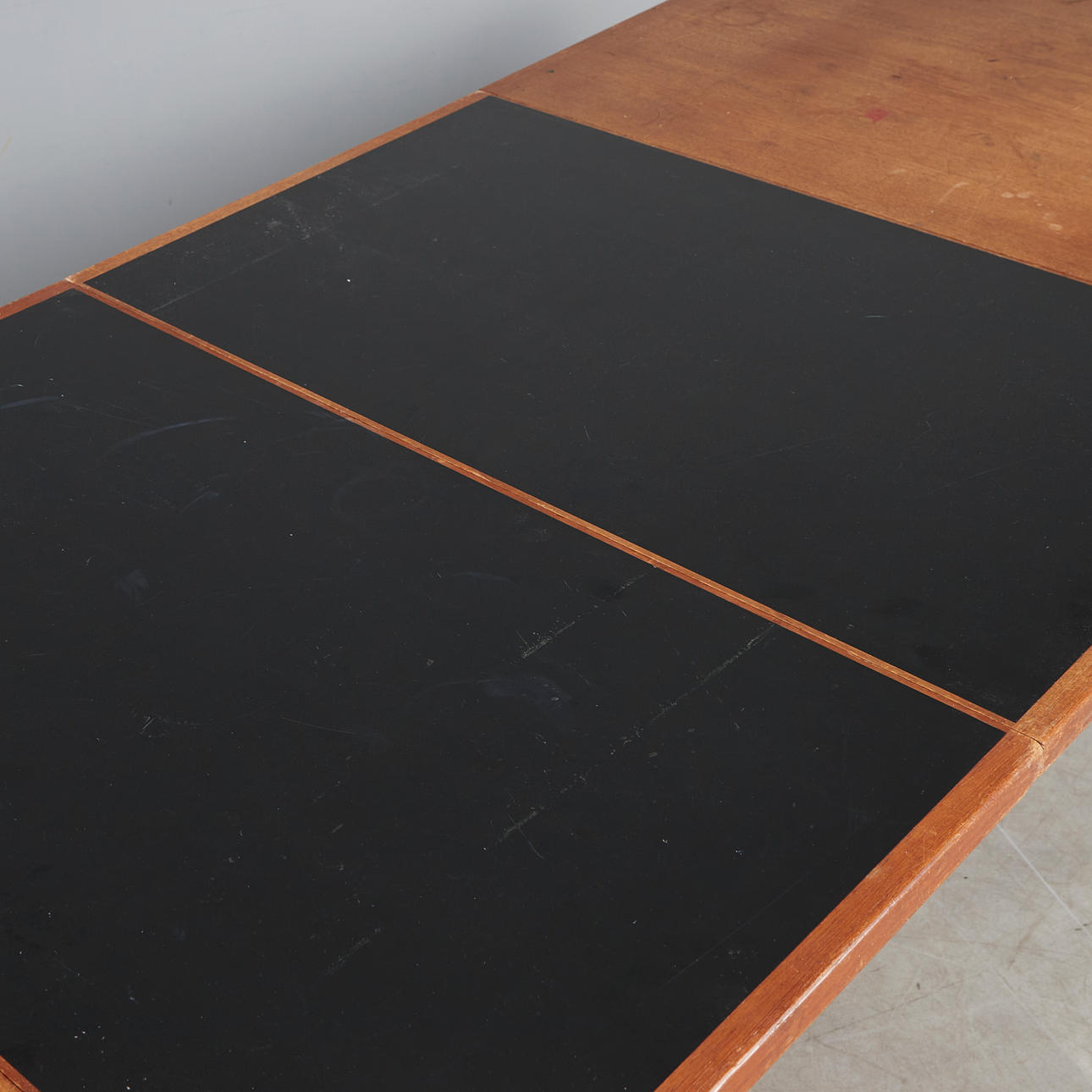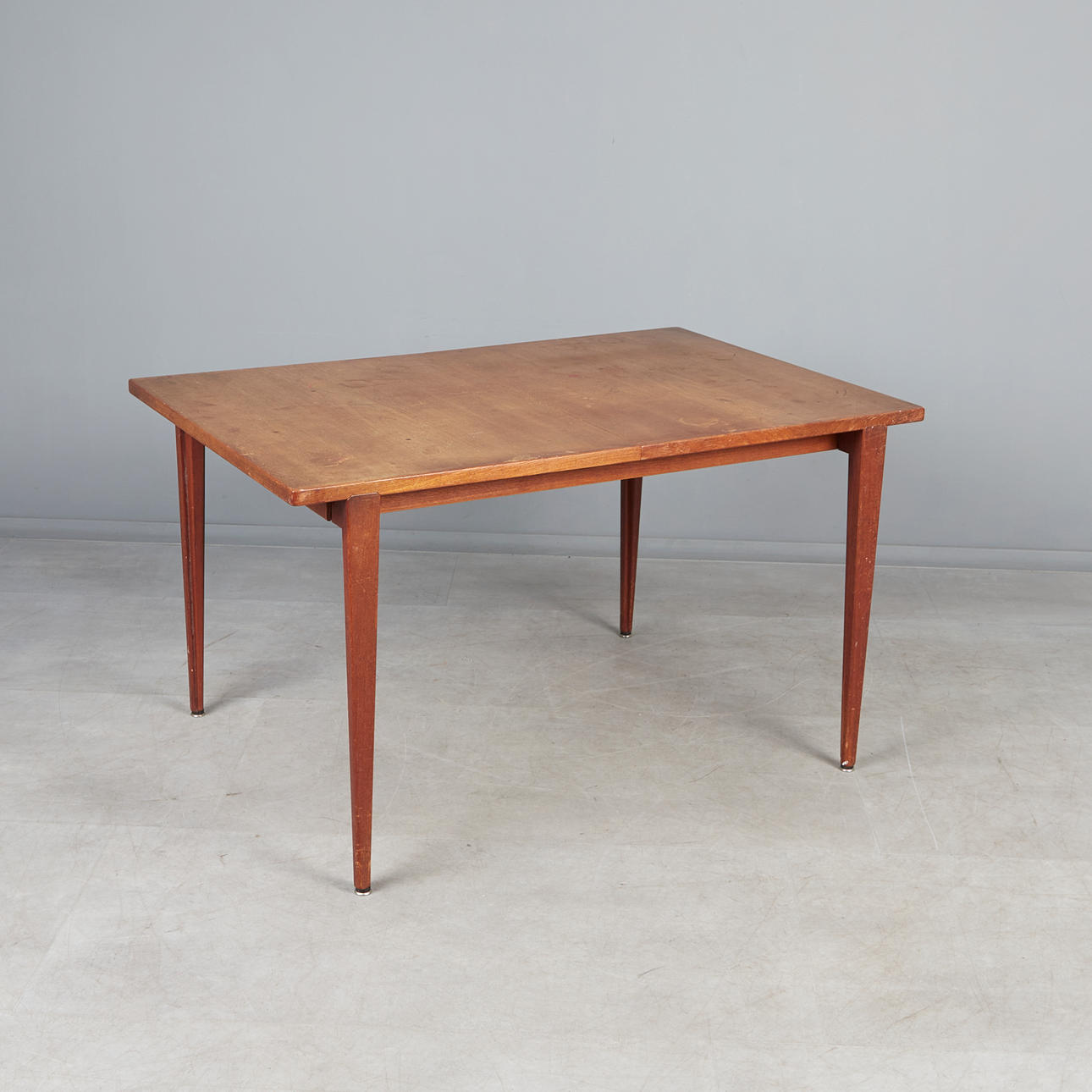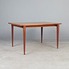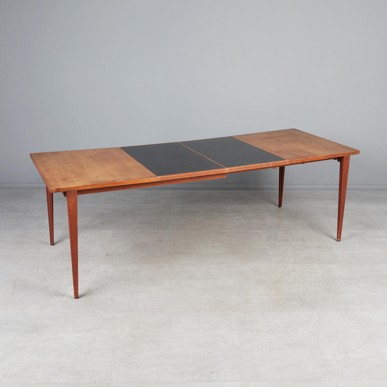 Rectangular table/teak dining table, expandable with two black-colored insert plates, standing on conical legs, branded with manufacturer's mark on the underside.