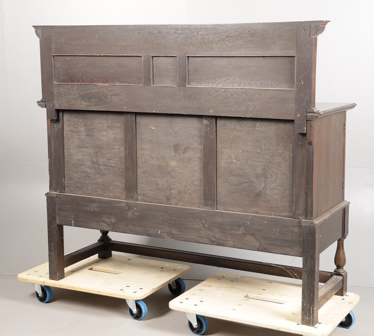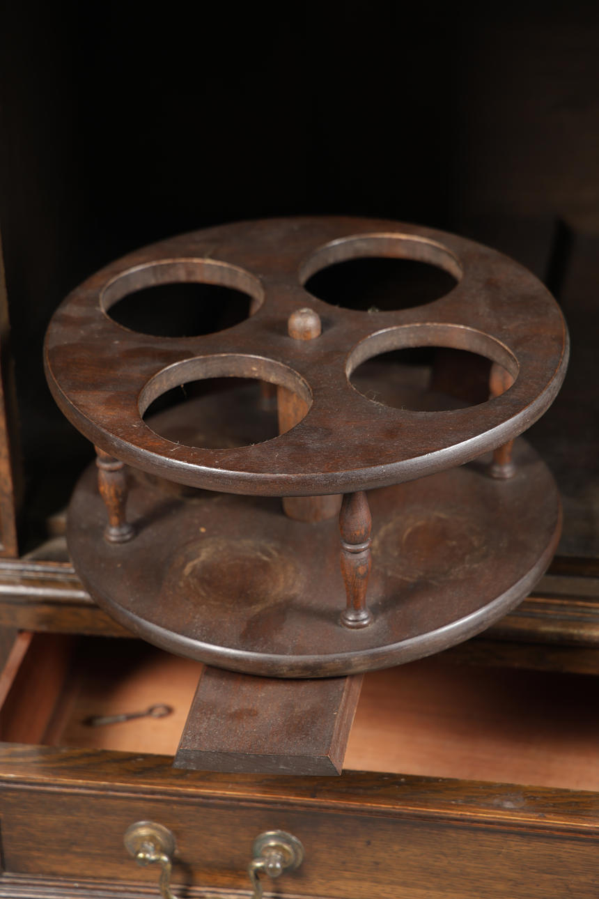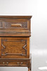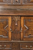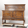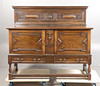 The gallery top above a pair pf geometric moulded doors with tow drawers below, raised on baluster supports and block feet united by stretchers, 152cm wide, 134cm high, 55.5cm deep.