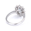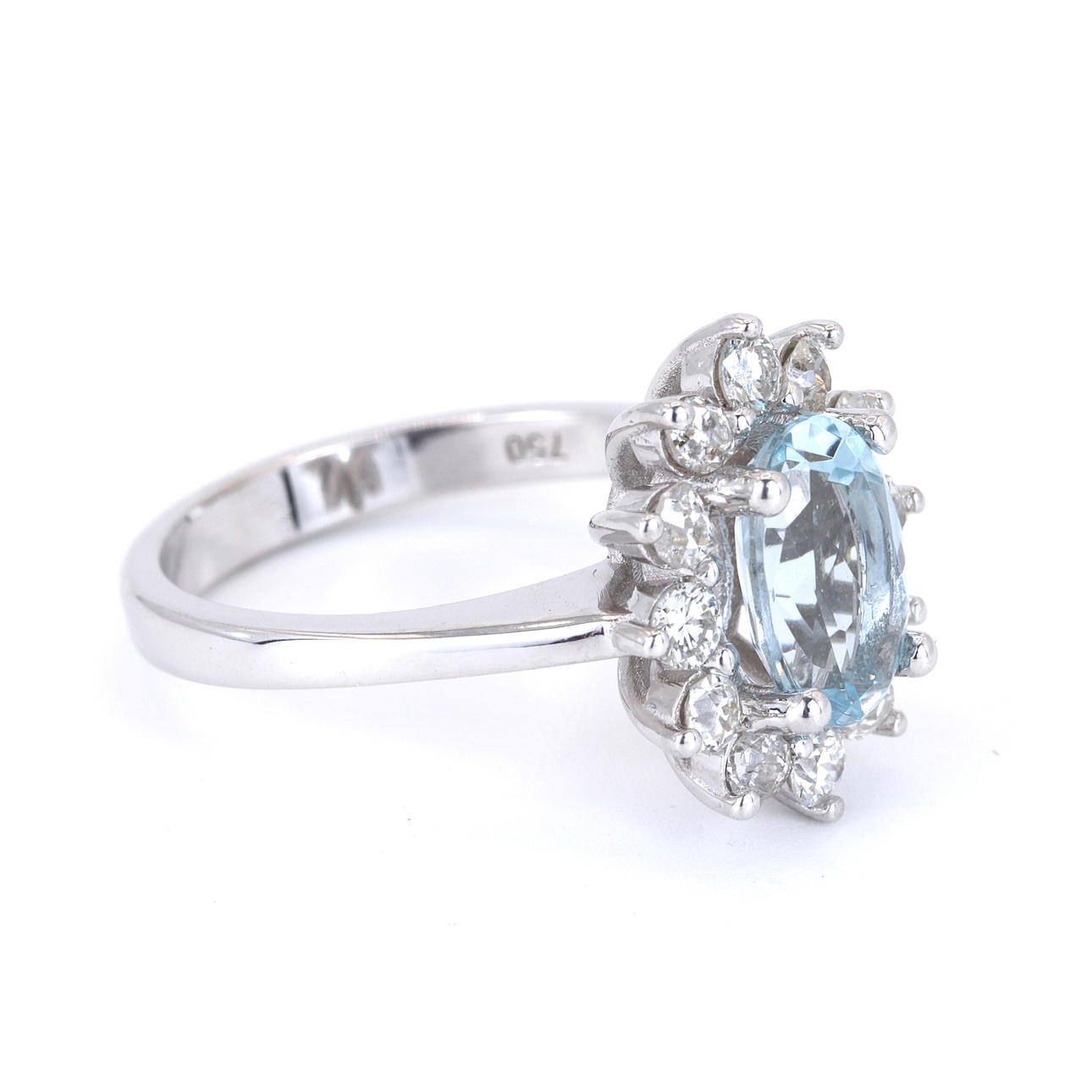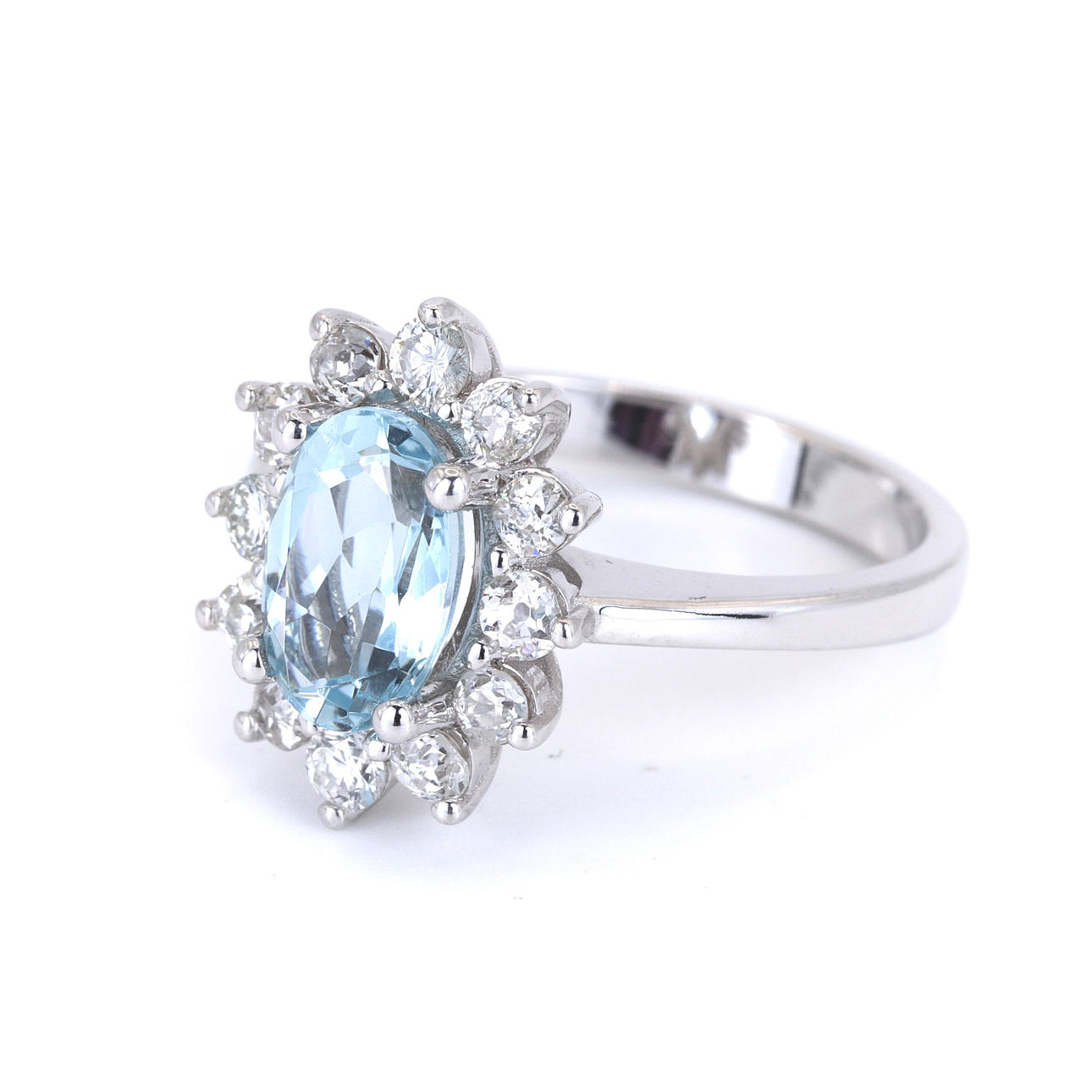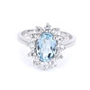 An 18ct white gold ring set with oval cut aquamarine surrounded by diamonds.