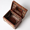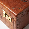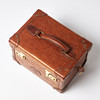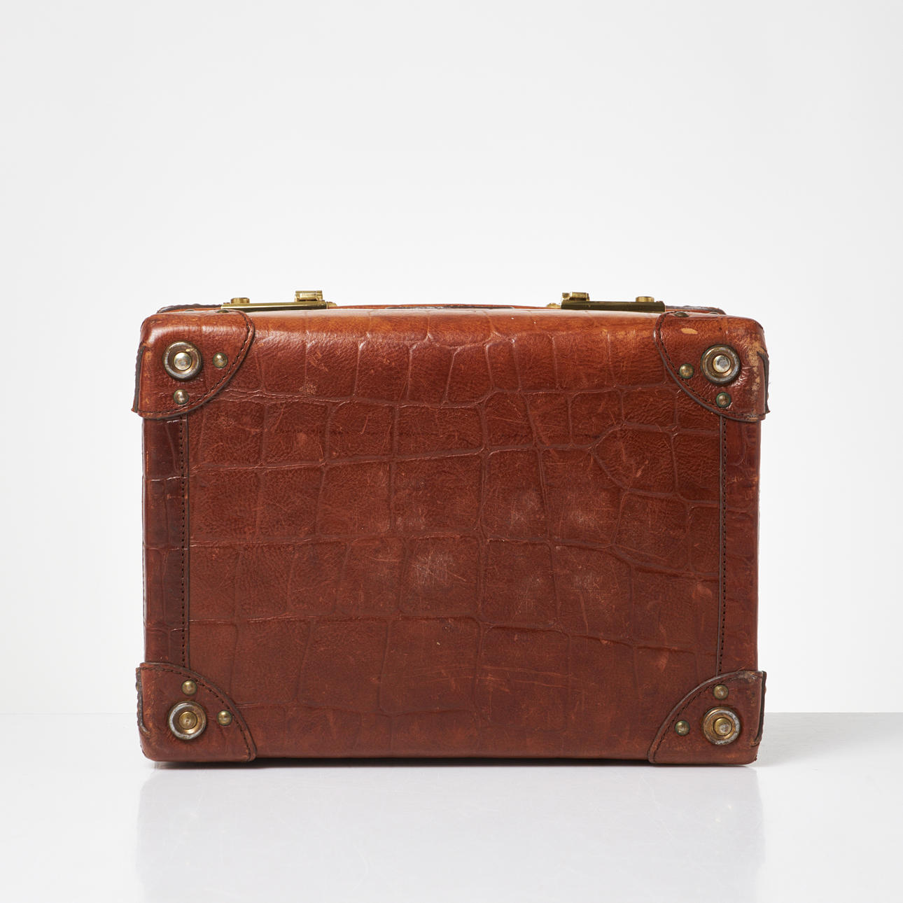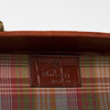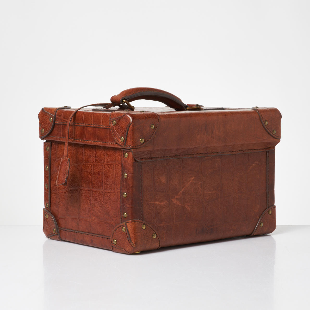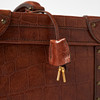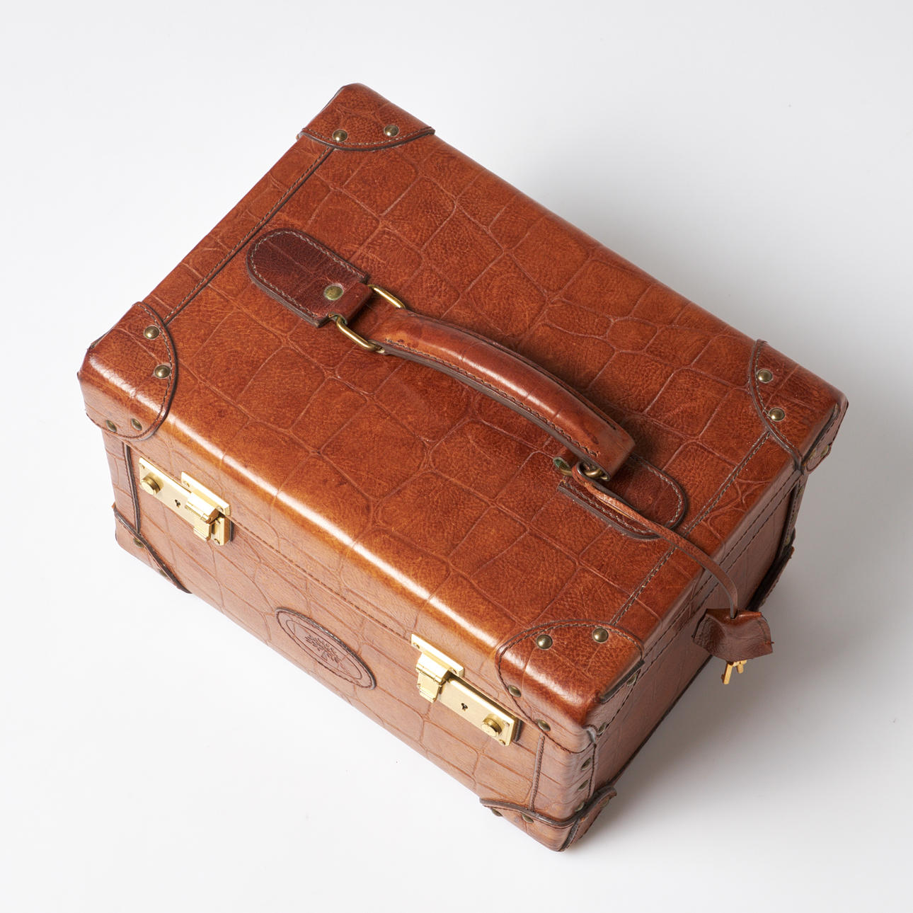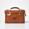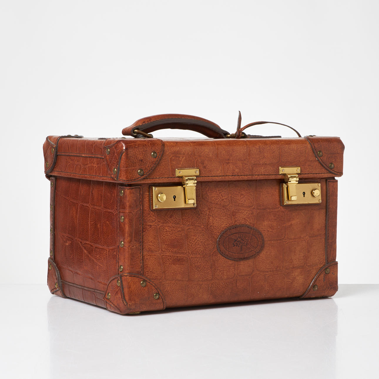 Rectangular shape in brown embossed 'congo' leather with handle on cover. Lanyard with 2 keys. Yellow metal fittings. Interior upholstered in classic Mulberry plaid fabric, with interior of removable mirror, two smaller compartments and straps. Marked “Mulberry England CM”. Dimensions approx. exl handle, H.33, width 23, height 21 cm.