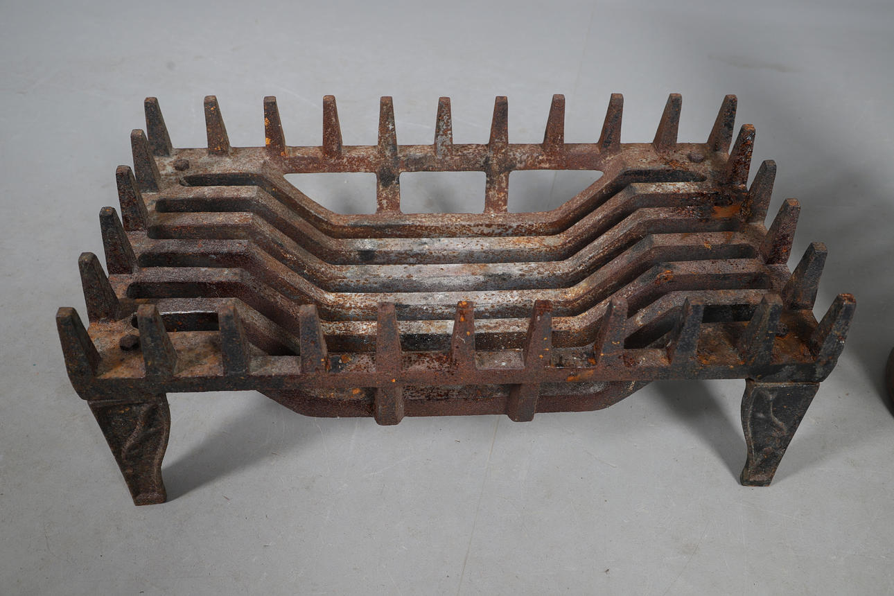 To include a cast iron fire gate, 22cm (h) x 58.5cm (w) x 32cm (d). Together with a copper coal scuttle, with two handles to the body and raised on small brass feet to the base, 59cm (h) x 23cm (w). (2).