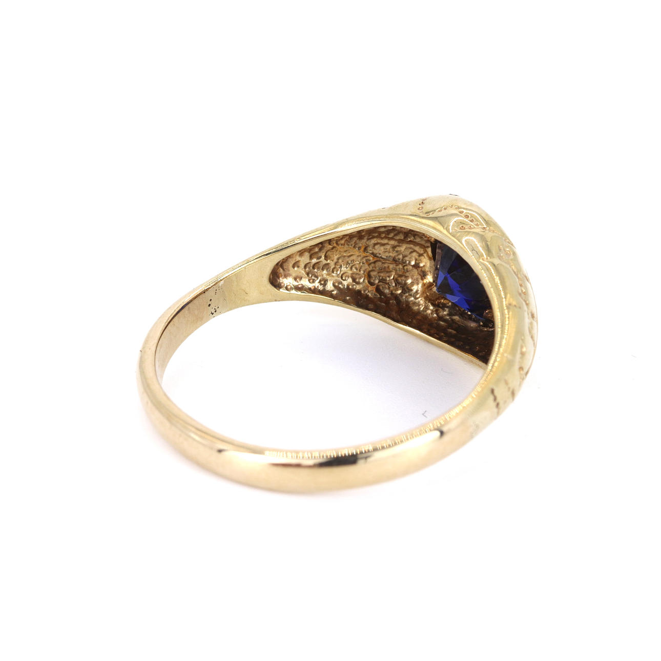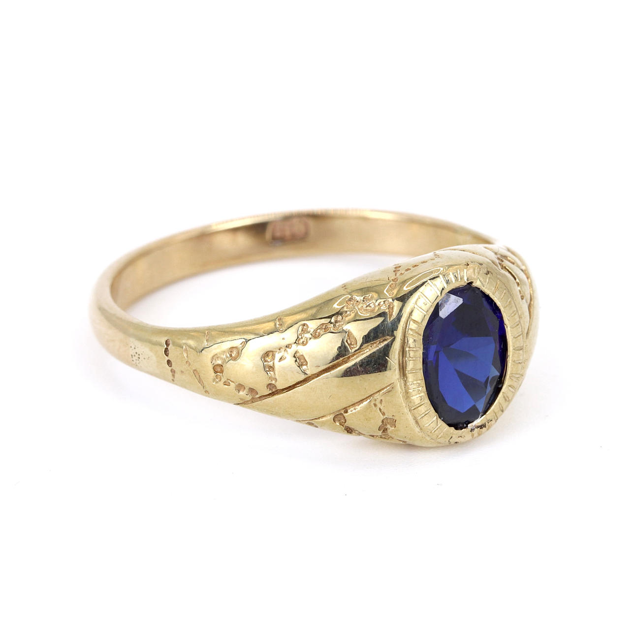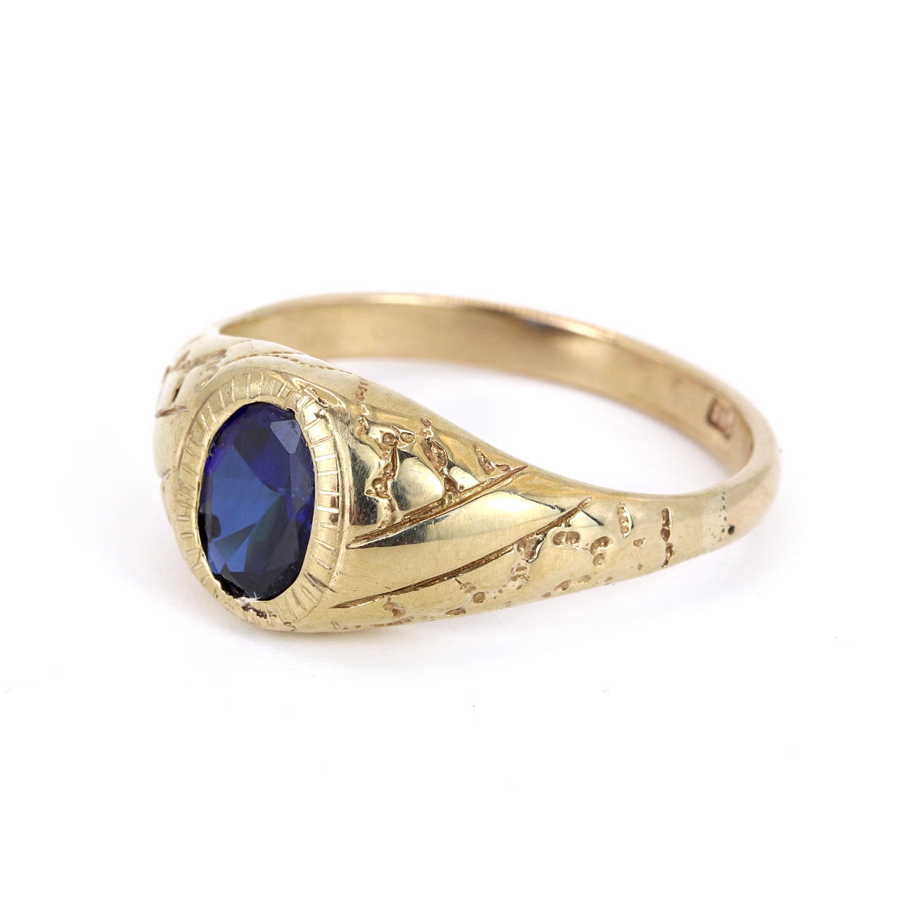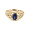 A 9ct yellow gold signet ri ng set with synthetic sapphire. UK ring size: V.