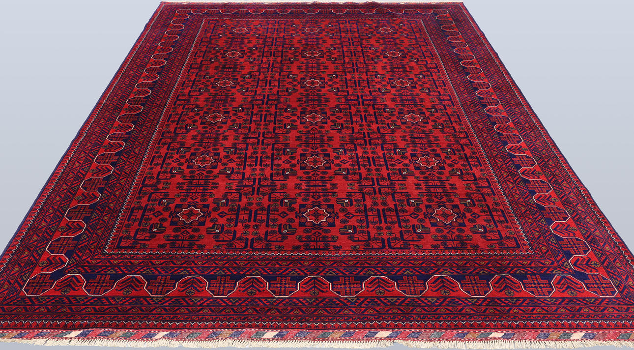 Afghan fine with a red base color and a center field covered in repeating dark blue lake motifs. The border consists of repeating geometric patterns in similar colors. The bangs are made of wool and the warp is made of cotton.
