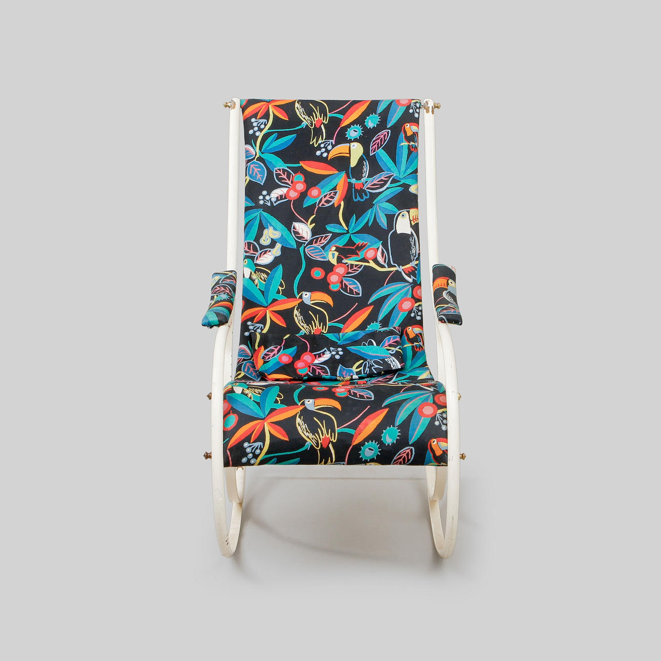 Frame in white lacquered metal. Width 63, seat height 50, depth 90, height 110 cm.