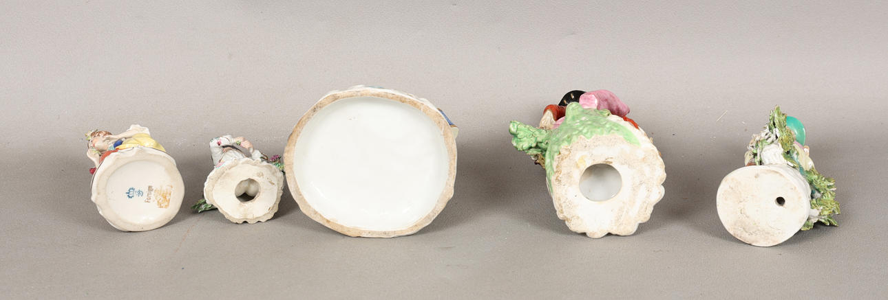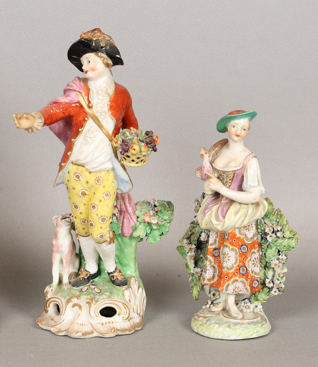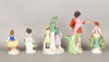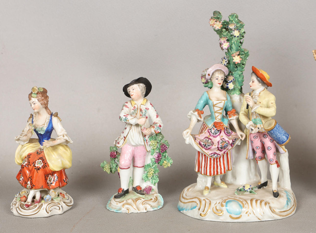 One in the form of a courting couple, 19.5cm tal, another in orange overcoat holding a basket of fruit, 21cm tall, and three smaller, 16cm, 13.5cm and 13cm (5).