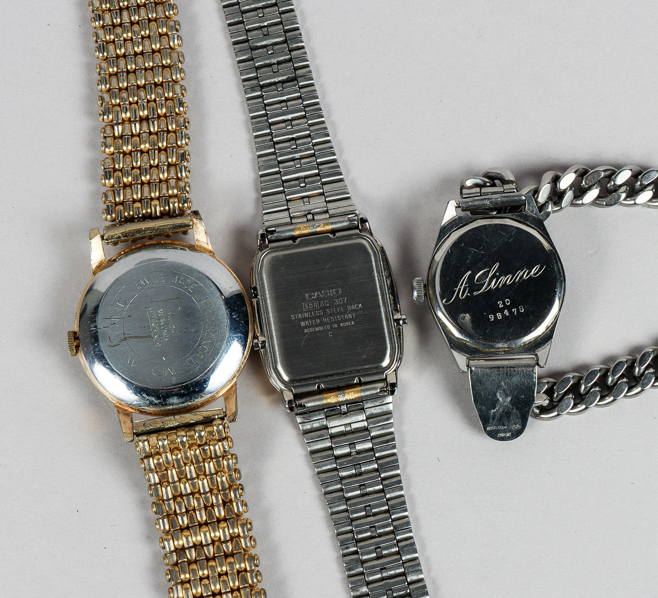Grovana, manual, 36 mm. Casio, quartz, 30 mm. Drott, manual, 28 mm. Birka, manual, 21 mm.