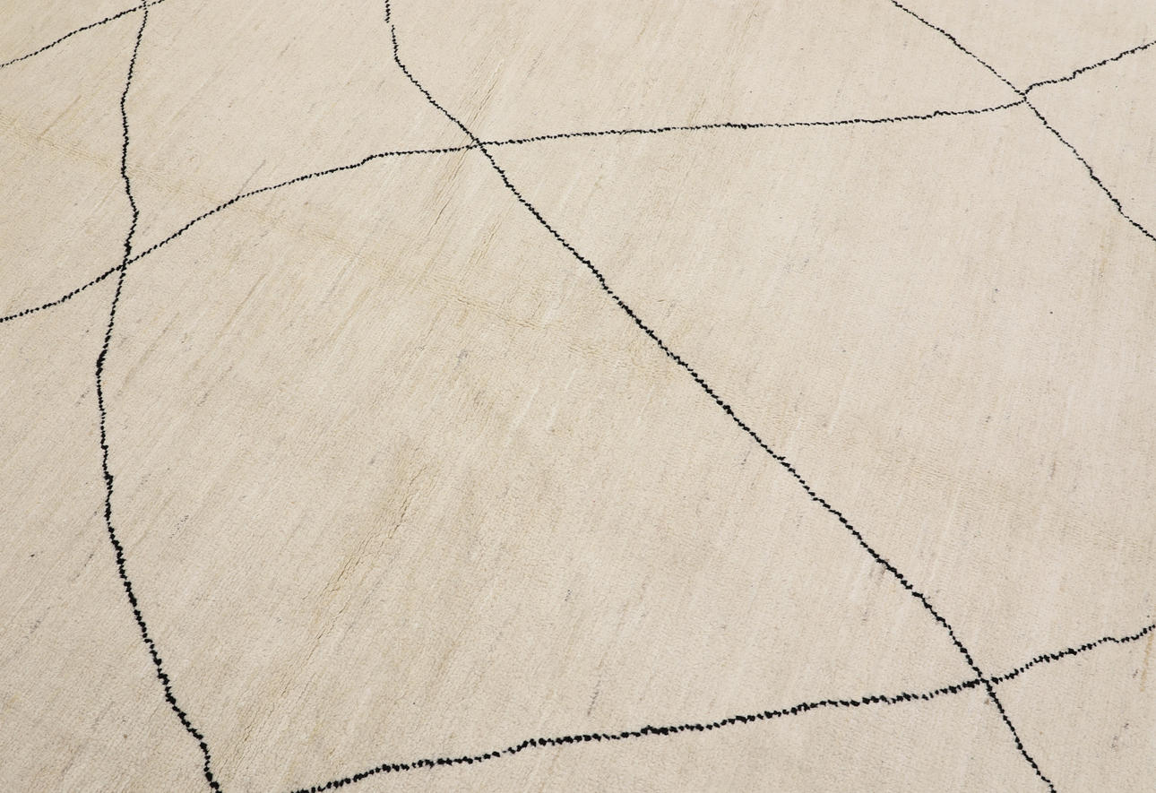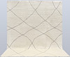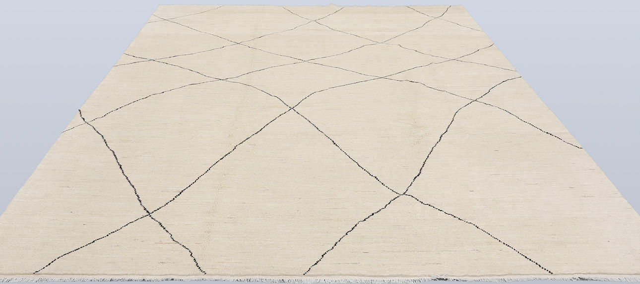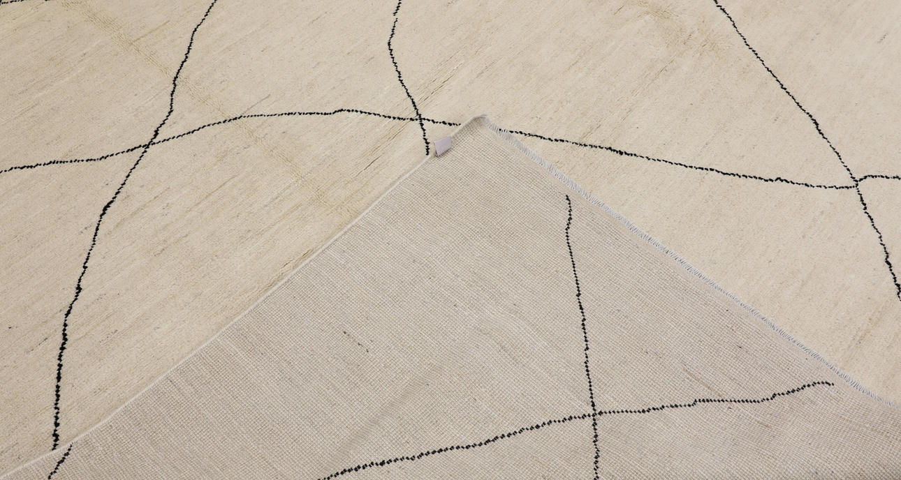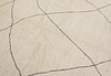 Morocco carpet with a light bottom and an abstract checkerboard pattern of thin lines in a dark shade. The forelock is made of wool and the warp is of cotton.