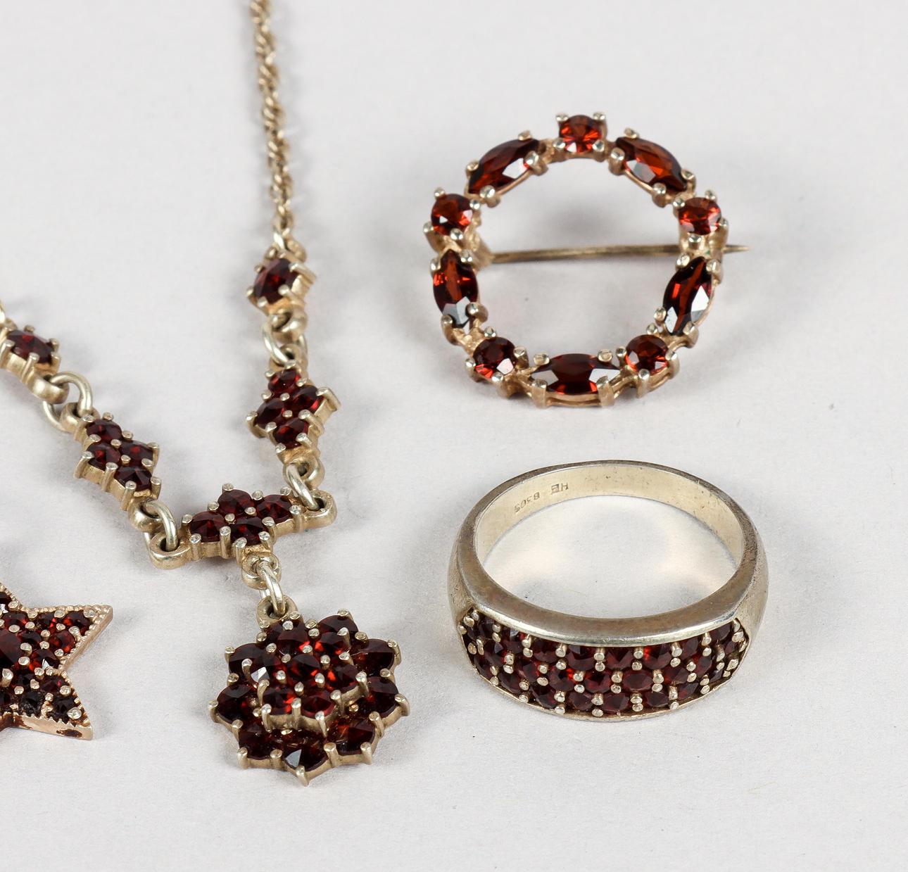 Ring, brooch, necklace, 2 pendants, 3 earrings of which one odd.