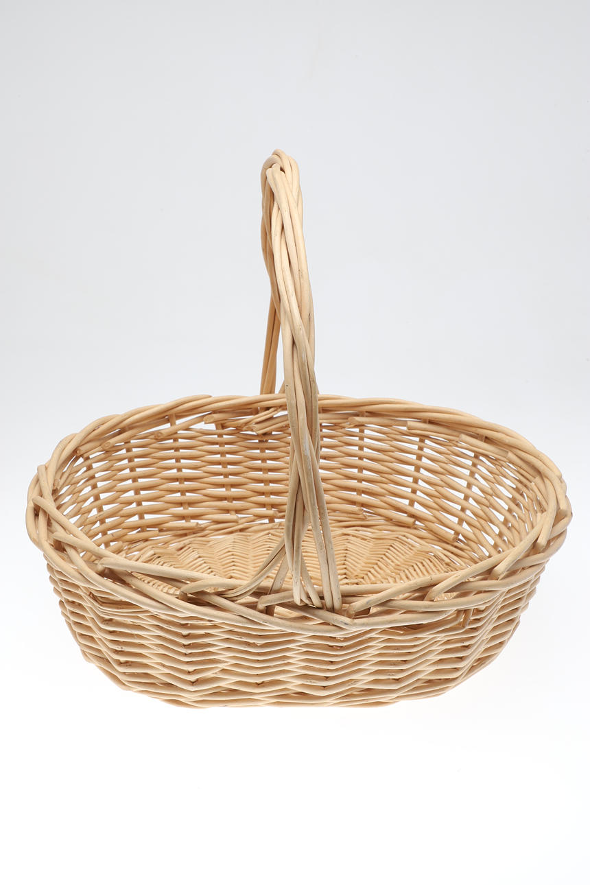 A quantity of wicker baskets, to include a shallow wicker trug, a wicker basket, and two wicker trays, size of largest, 45cm (h) x 48cm x 41cm. (4).