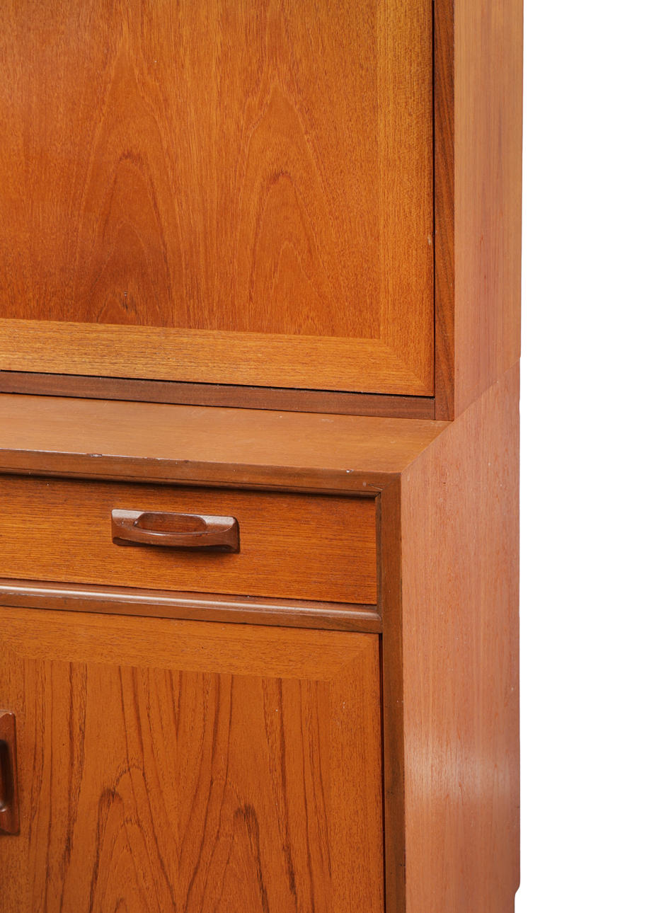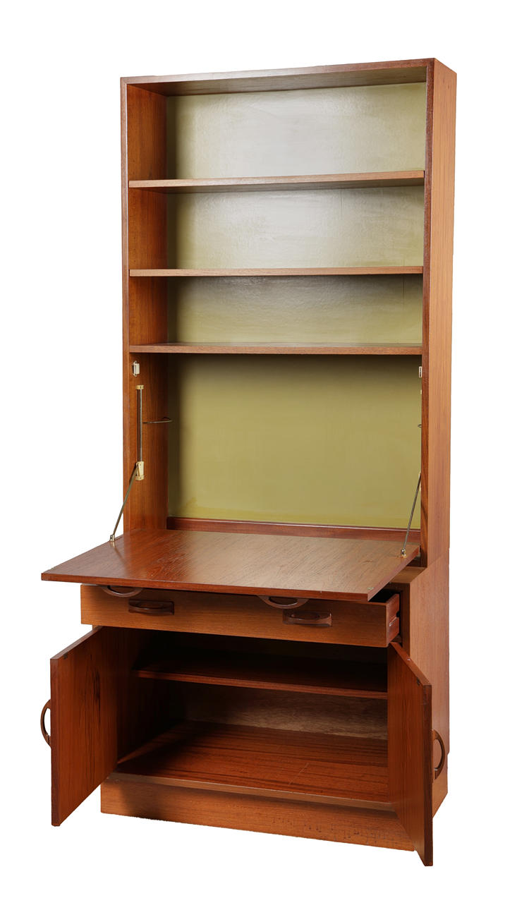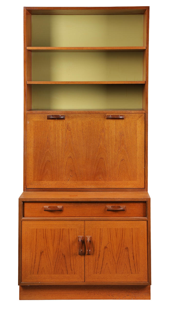 Having two shelves above a drop down front, the base fitted with a single drawer and a pair of cupboard doors, 199cm high 84cm wide 46cm deep.