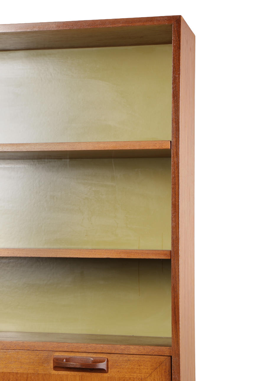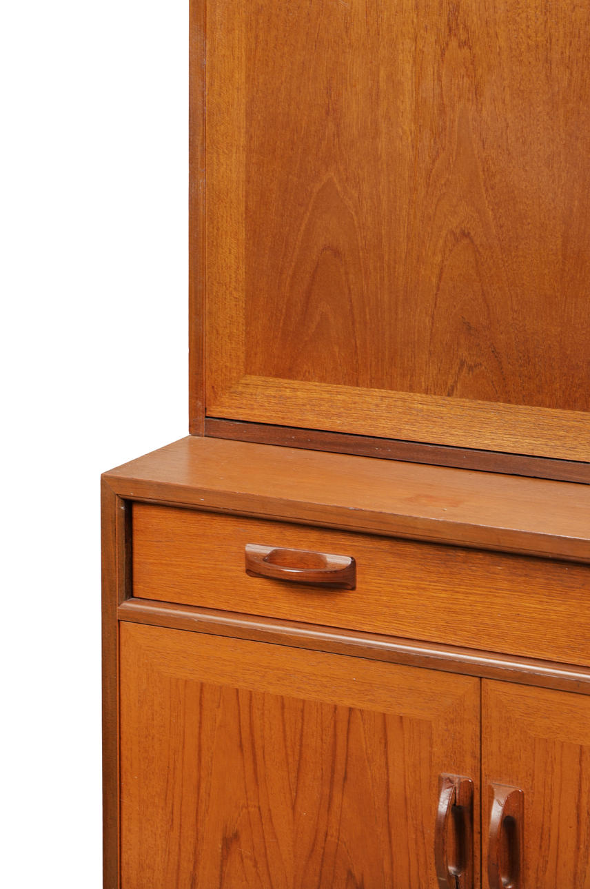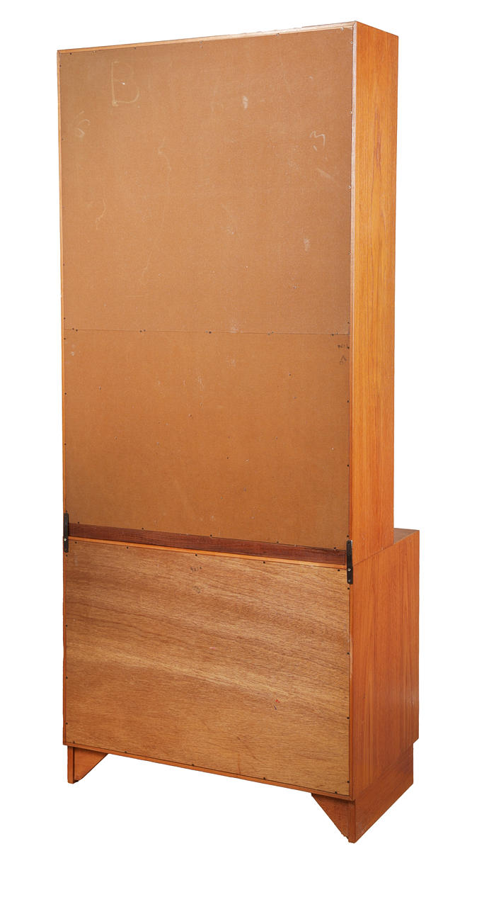 Having two shelves above a drop down front, the base fitted with a single drawer and a pair of cupboard doors, 199cm high 84cm wide 46cm deep.