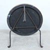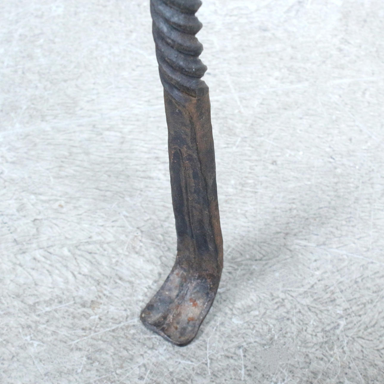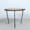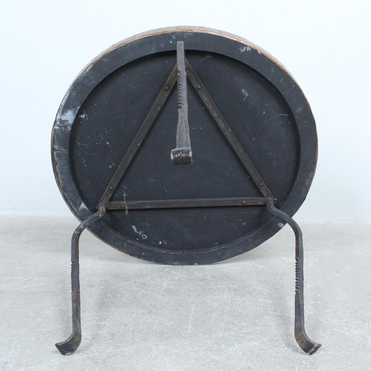 Wooden body on a three-legged wrought iron frame.