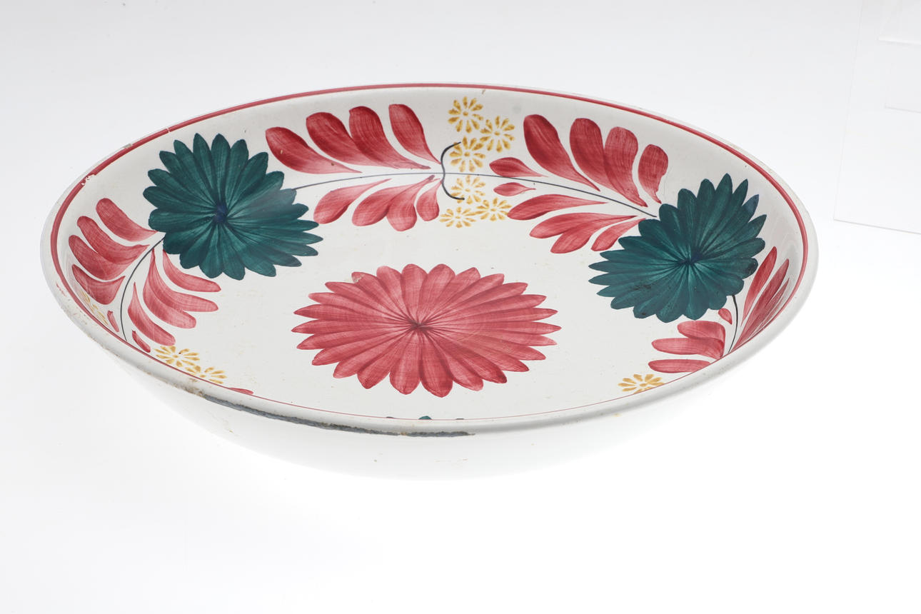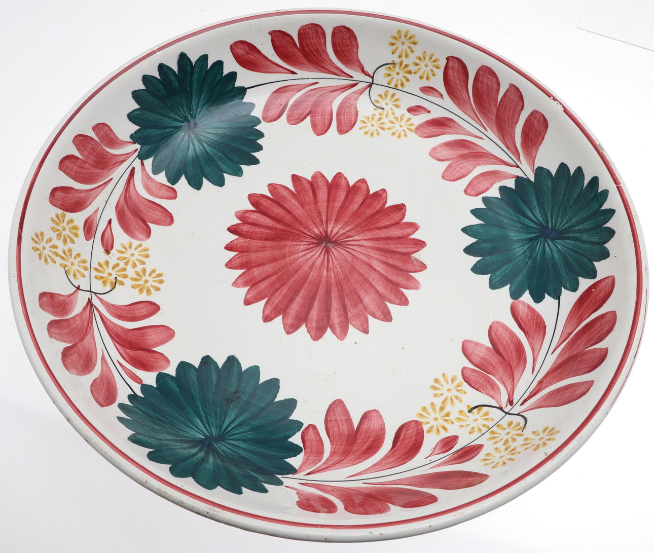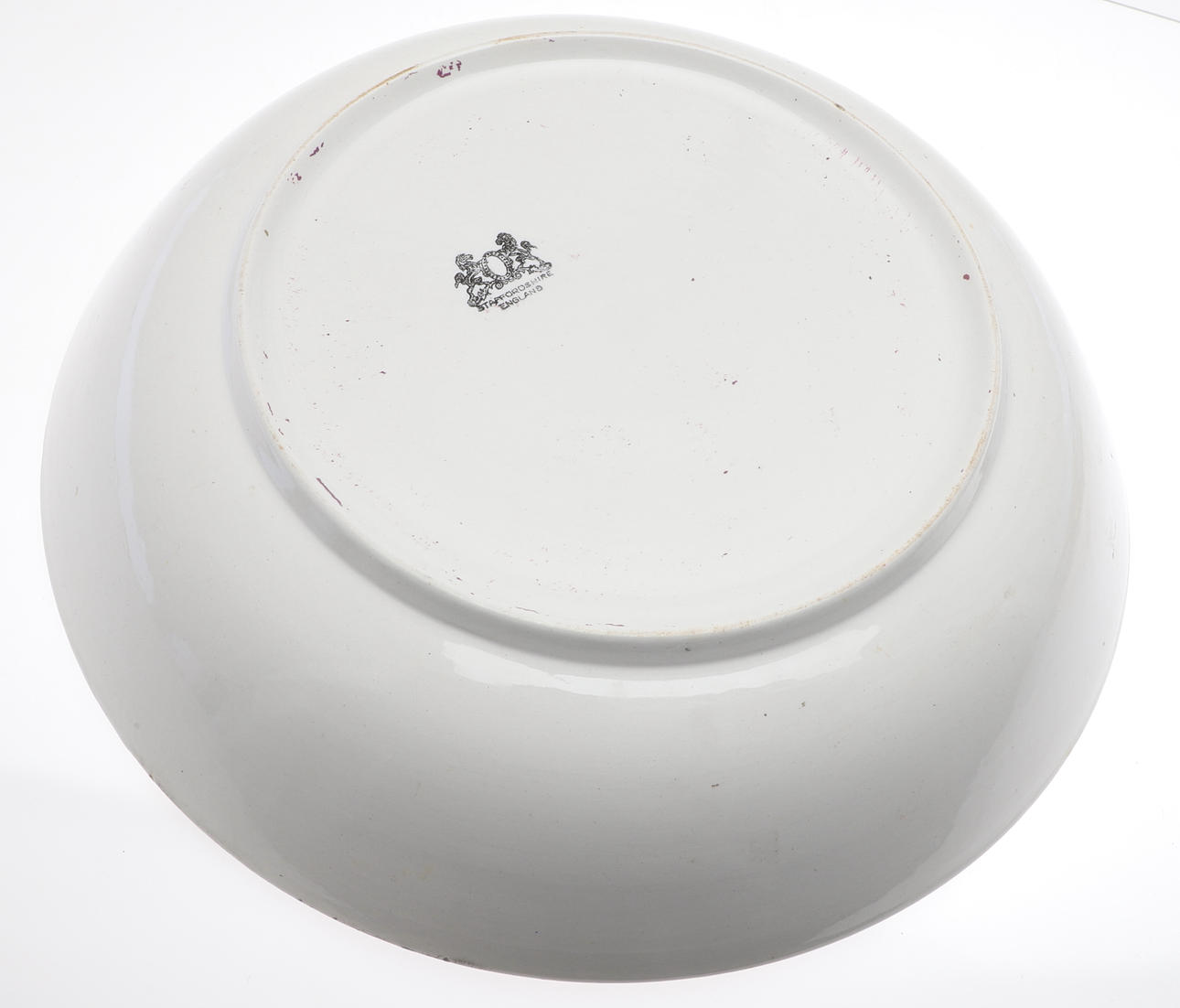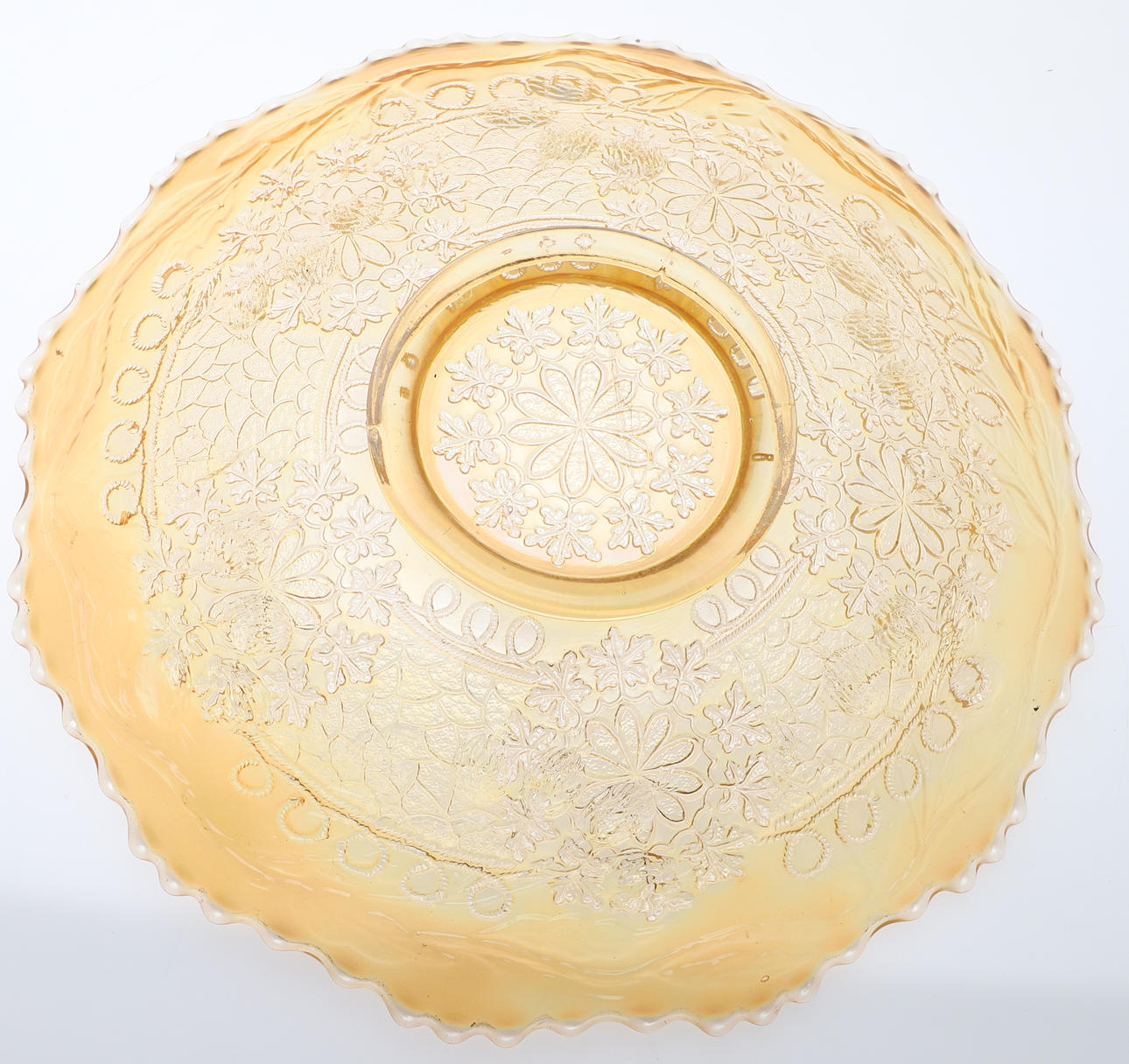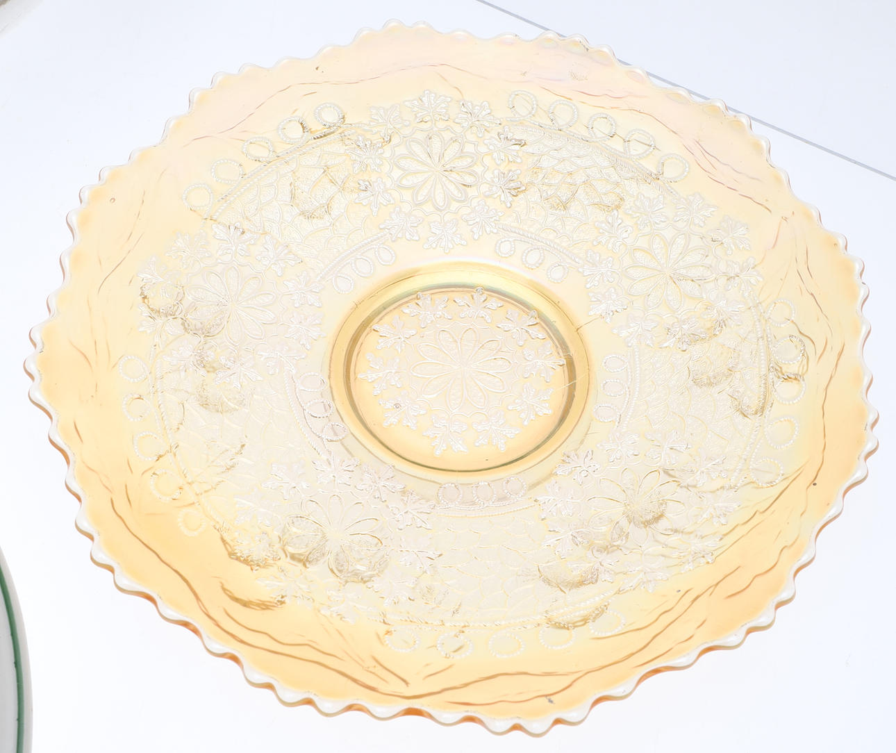 of circular form with transfer printed christmas tree decoration, 28cm diameter, a Staffordshire pottery serving or fruit bowl with foliate decoration, 37cm diameter, and other items to include carnival glass (qty).