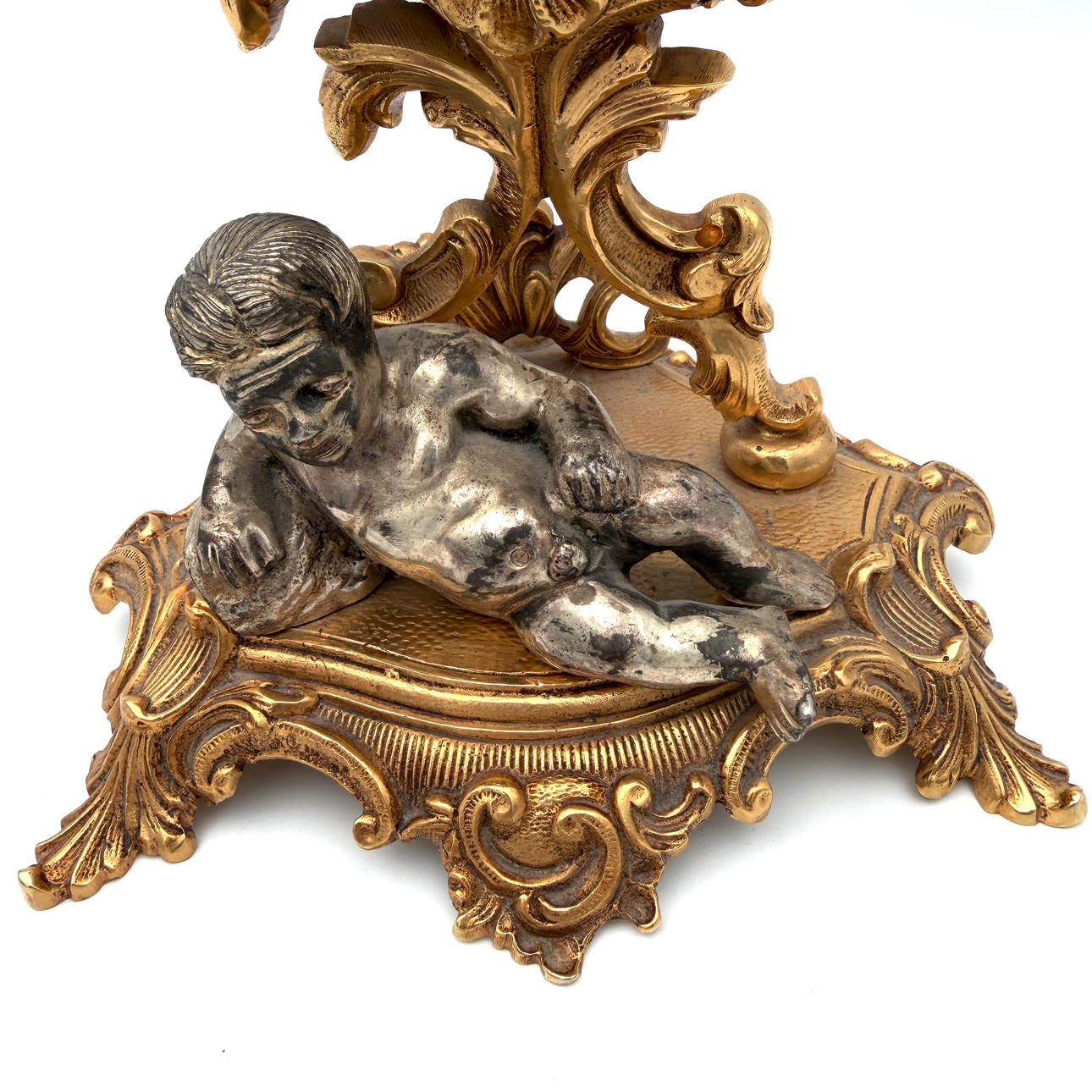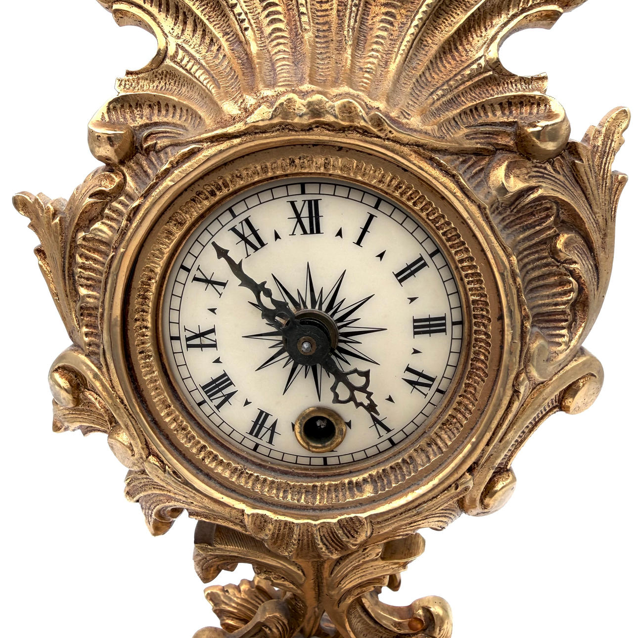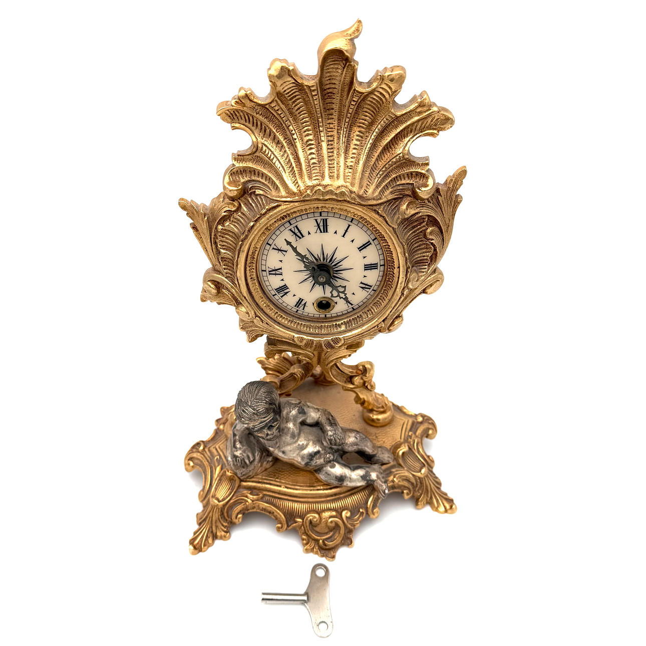 brass case, dial with Roman numerals, partially pierced decoration of volutes and mussel beards, and reclining cherub.