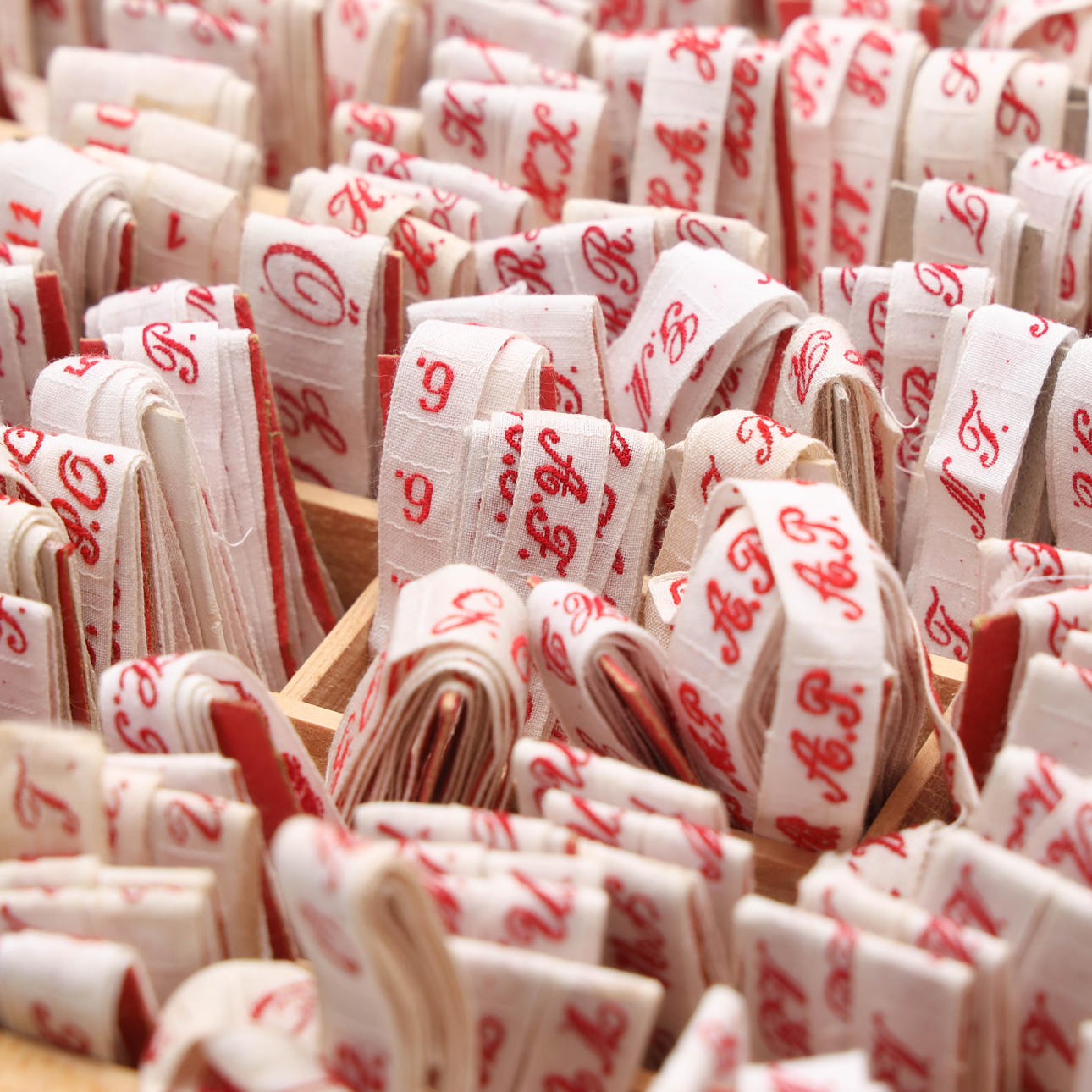 DISPLAYBOX, filled with monogram-signed ribbons, mixed signatures.