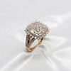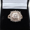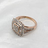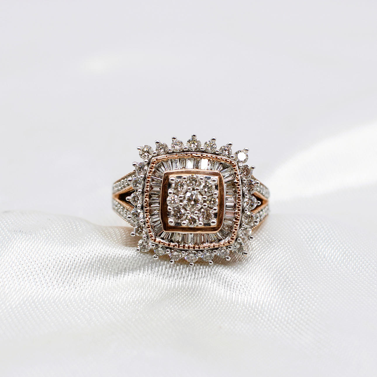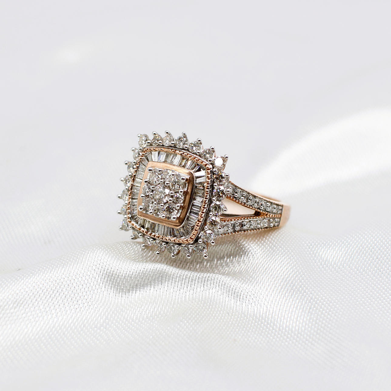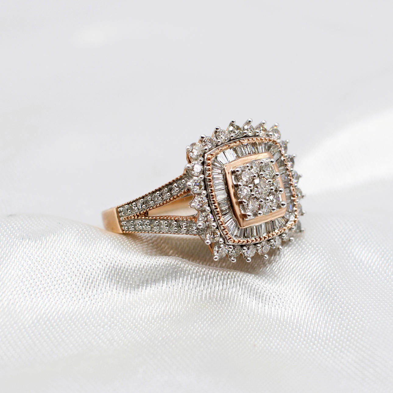 A 10ct Rose Gold (Stamped 10K) Square Round Brilliant And Baguette Cut Diamond Cluster Ring With Diamond Set Shoulders.