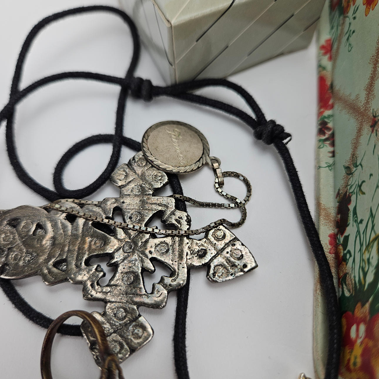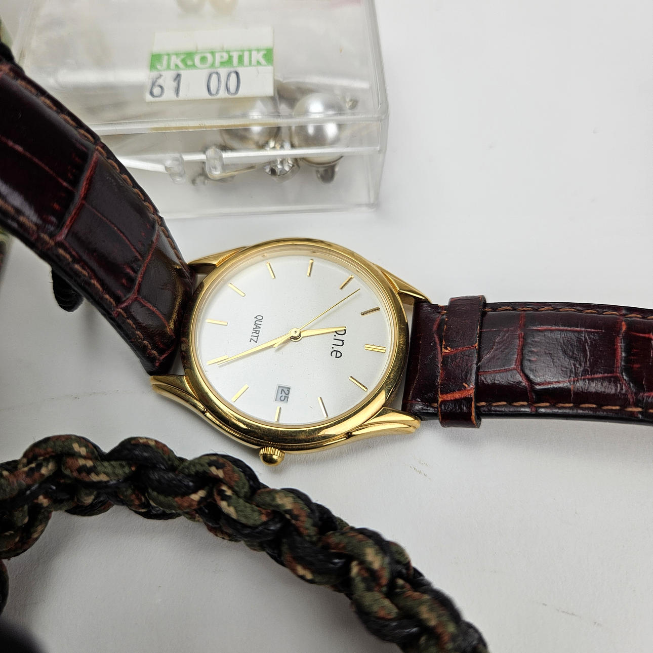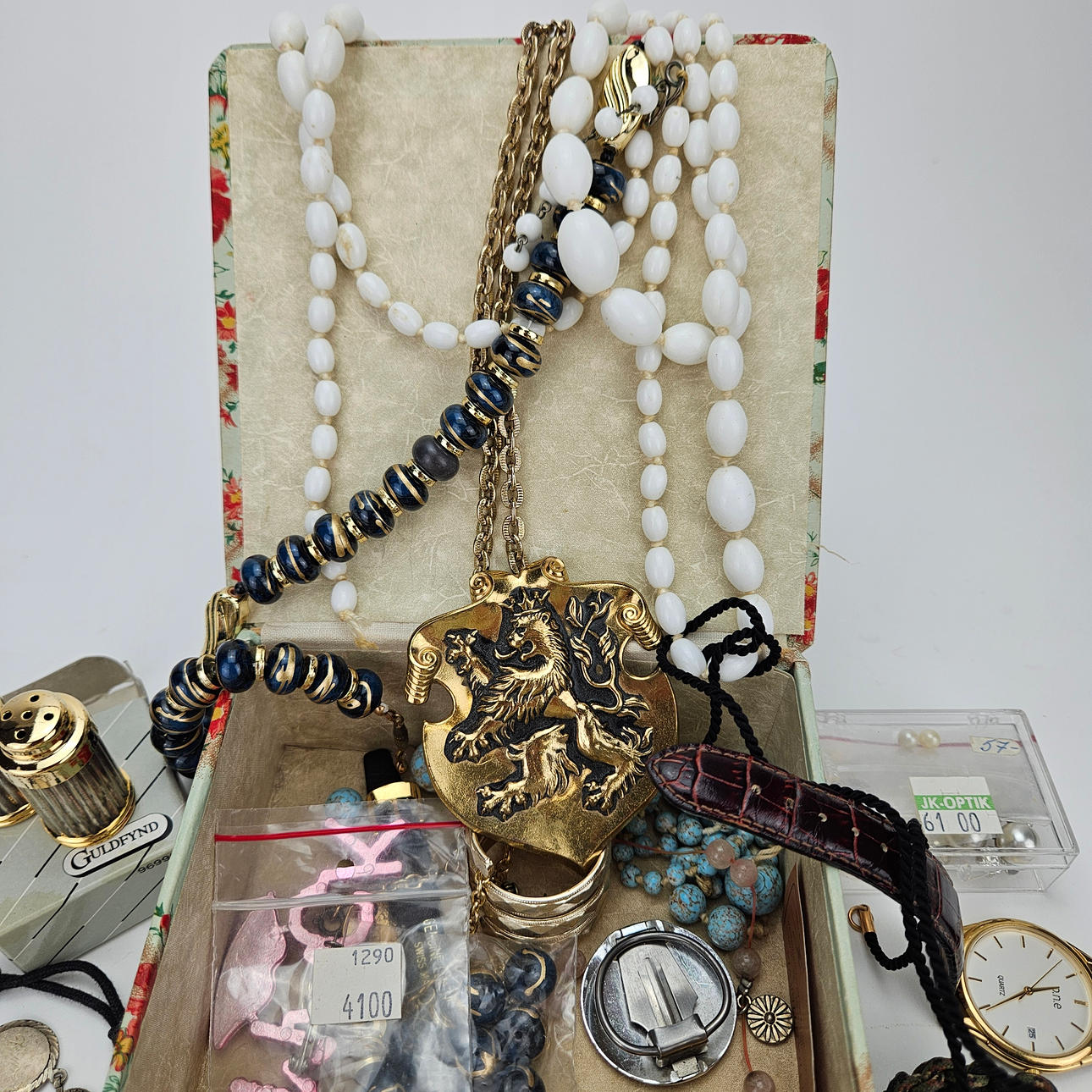 In ash, approx. 14x14x6 cm. Bijouterie, necklaces, brooches and more. Wristwatches, among others Certina, ca. 23-33 mm.