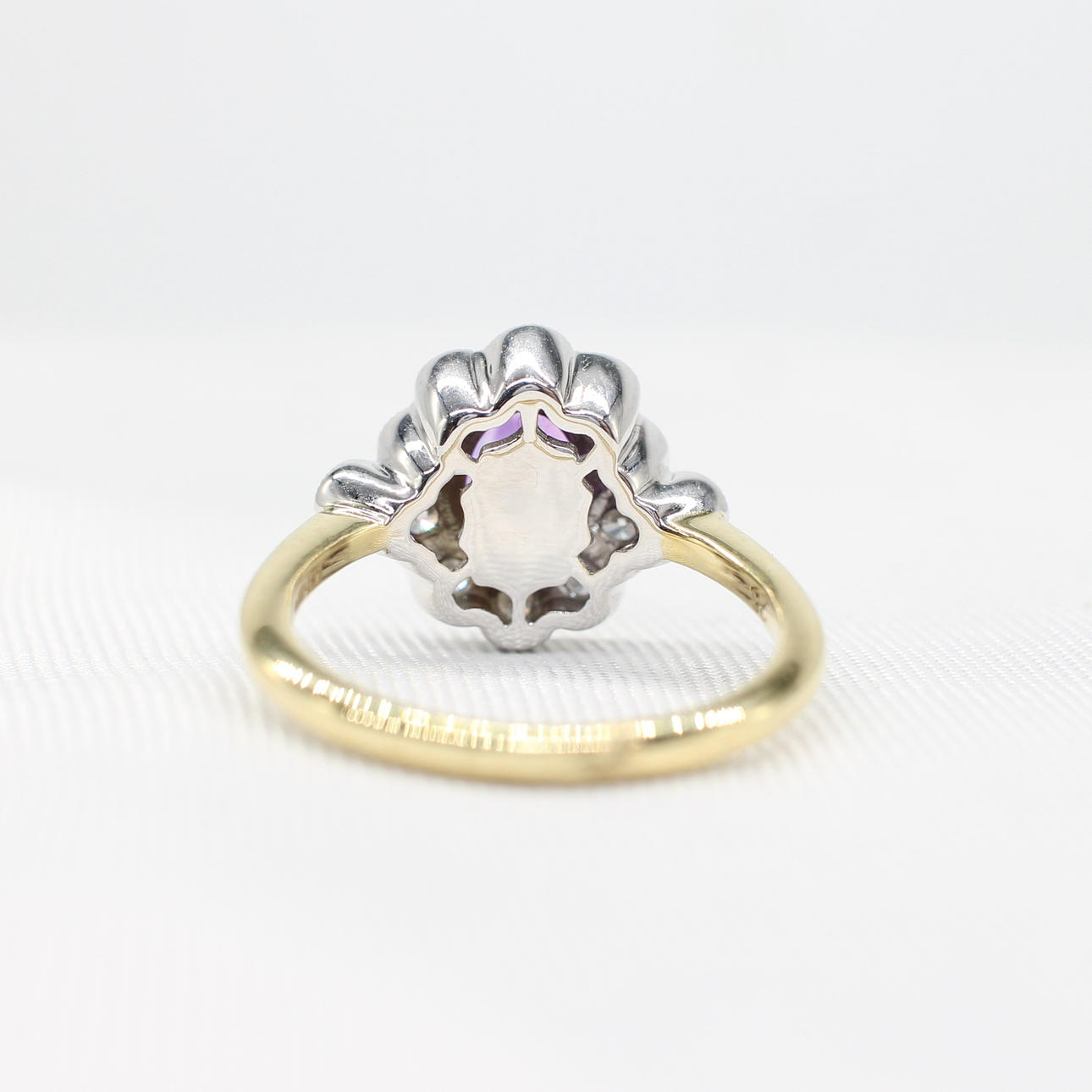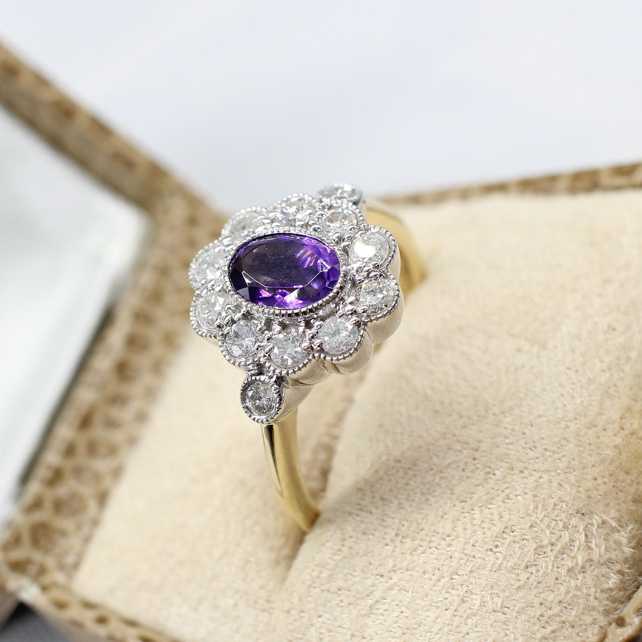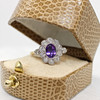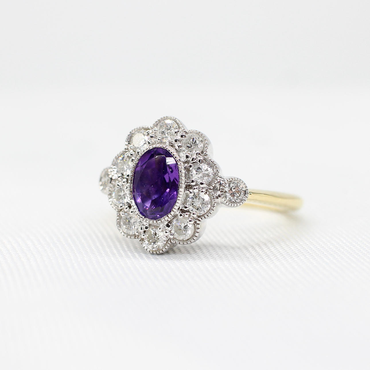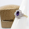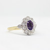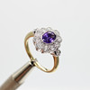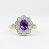 A 9K Yellow And White Gold (Hallmarked) Victorian Style Daisy Ring Set With An Oval Amethyst And Round Brilliant Cut Diamonds.
