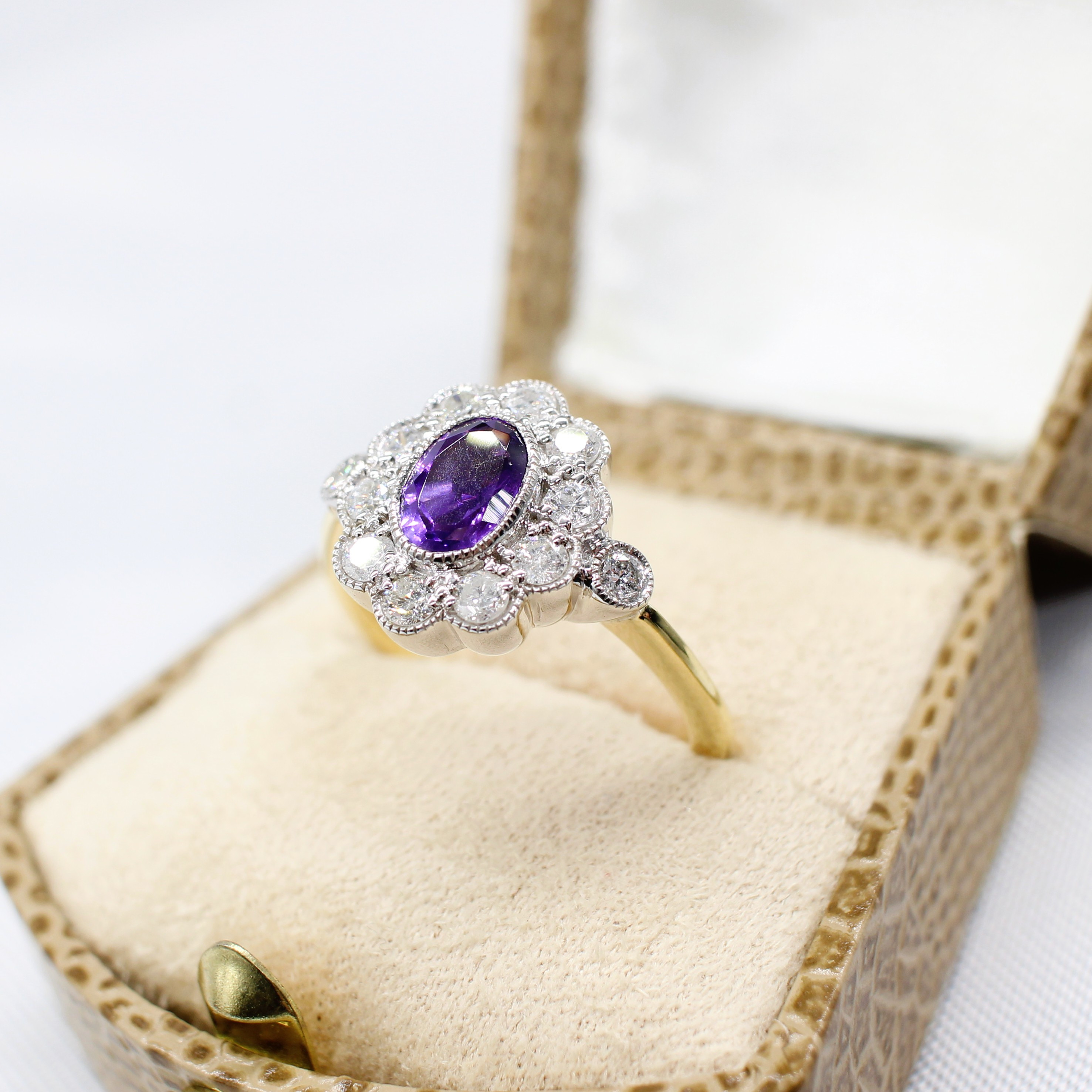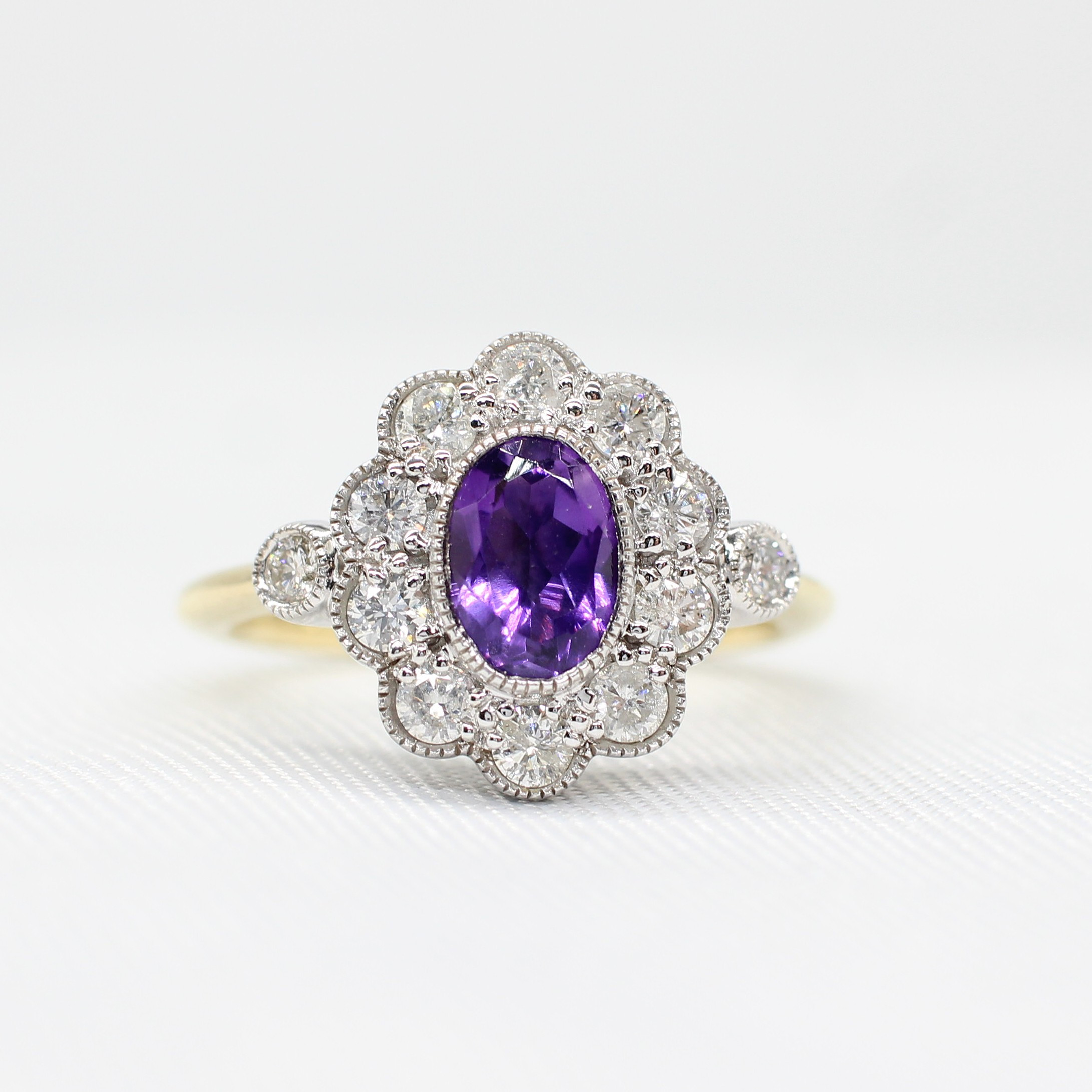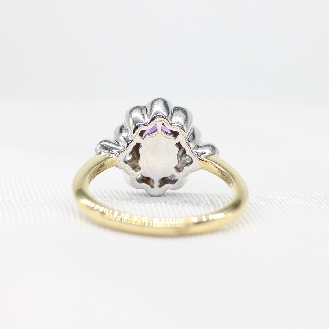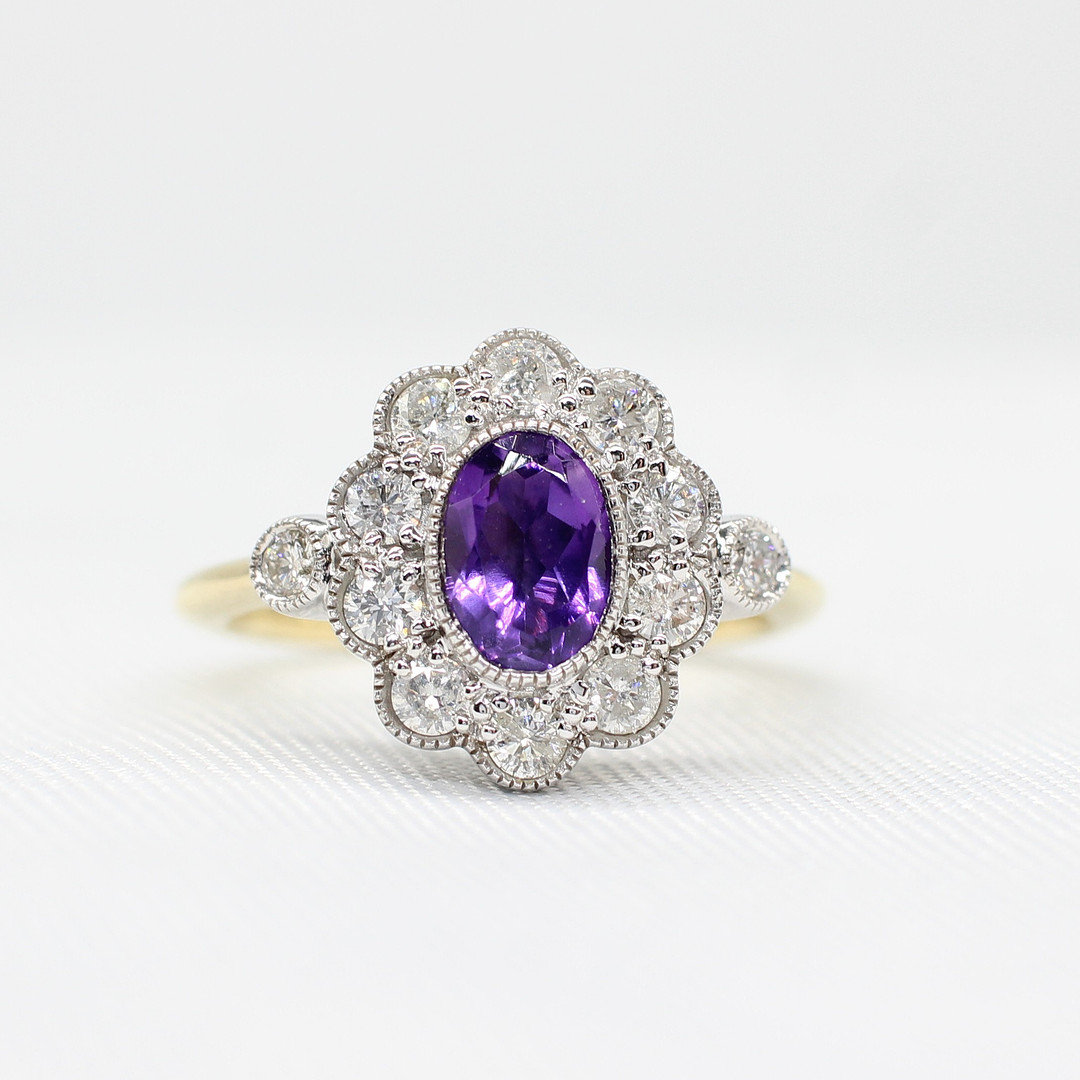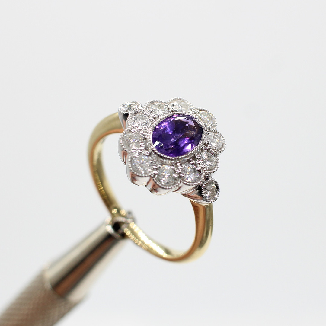 4959436. AMETHYST & DIAMOND DAISY RING.