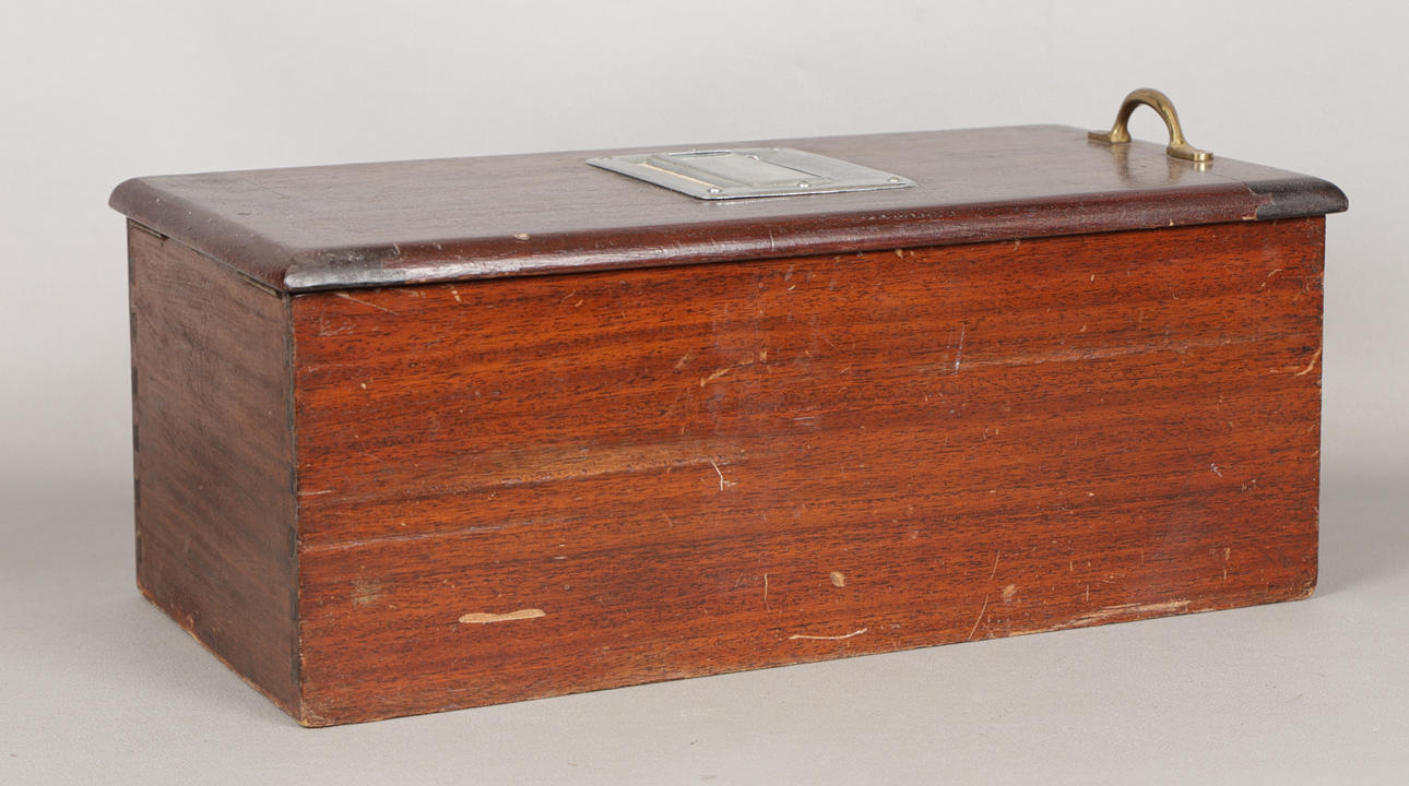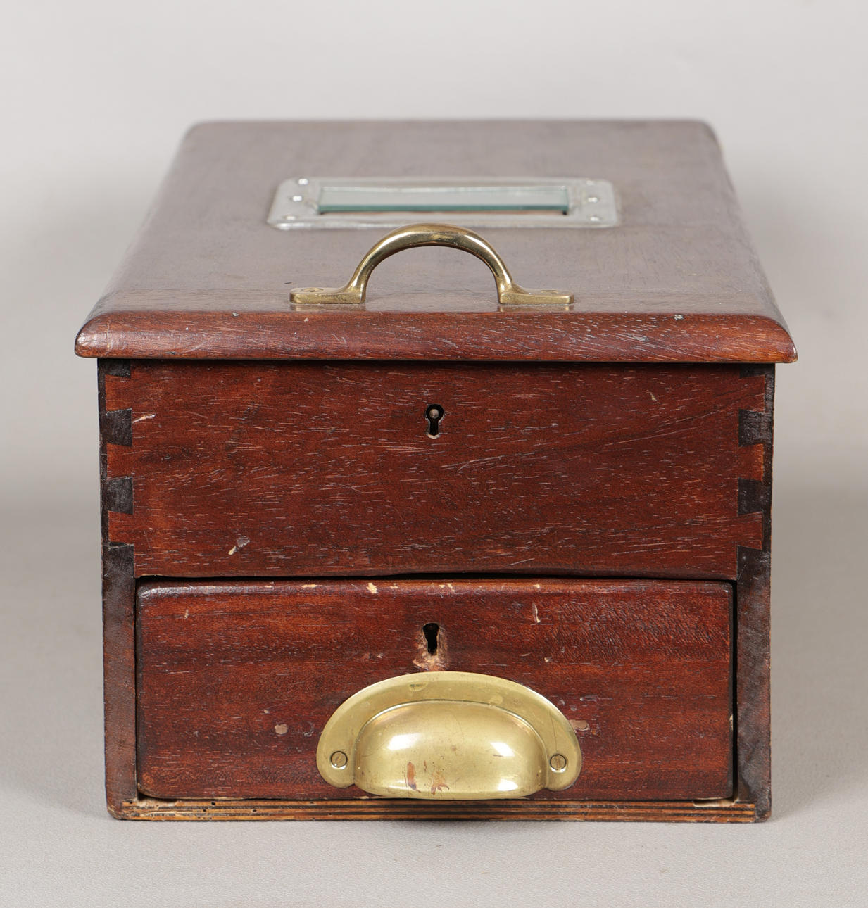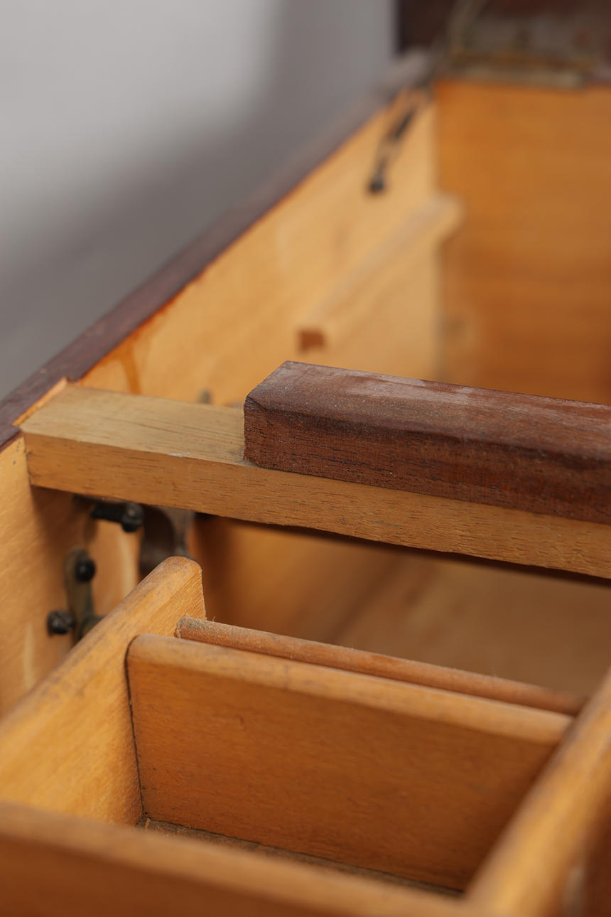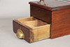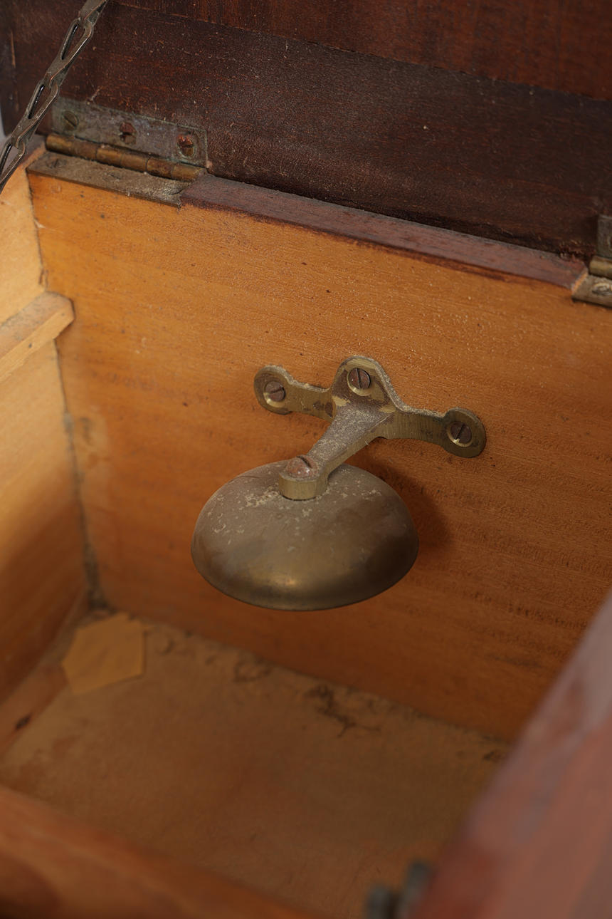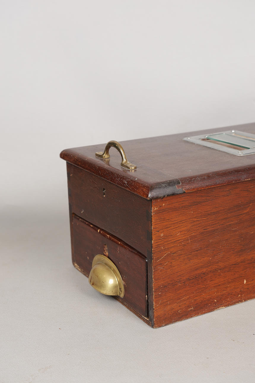 The hinged lid with glazed panel, the lower section with fitted drawer, with bell, 25cm wide, 48.5cm deep, 19cm high.
