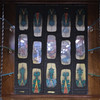 Interior with shelves made of glass and back cover partially made of glass with lighting.