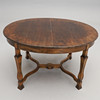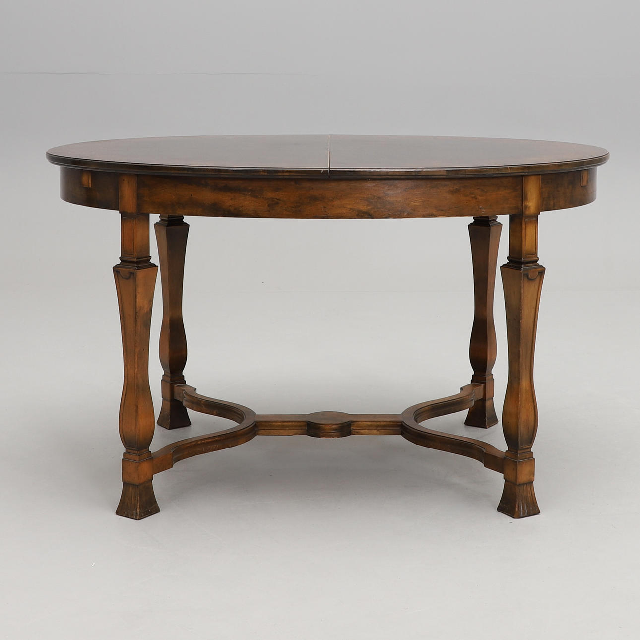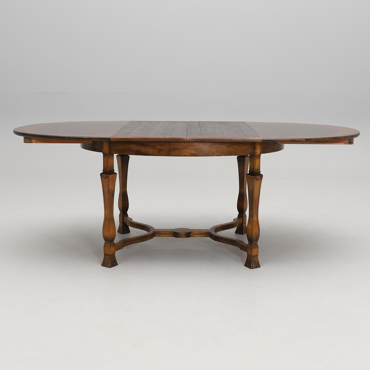 Dark veined birch. Oval retractable disc. 2 insert plates of 40 cm and one insert plate of 34 cm. Linked legs. Length 131 (with insert plates 245), width 105, height approx. 76 cm.
