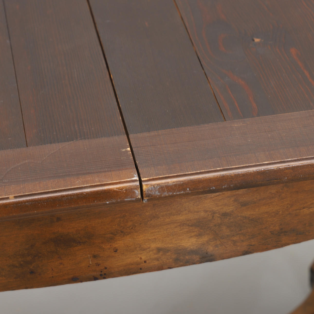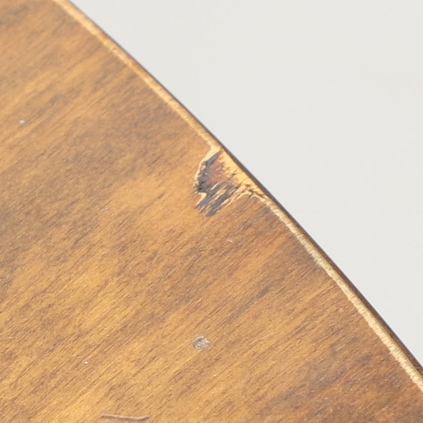 Normal wear and tear. Marks and minor veneer cracks. A minor veneer damage at the edge.